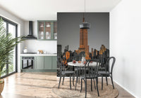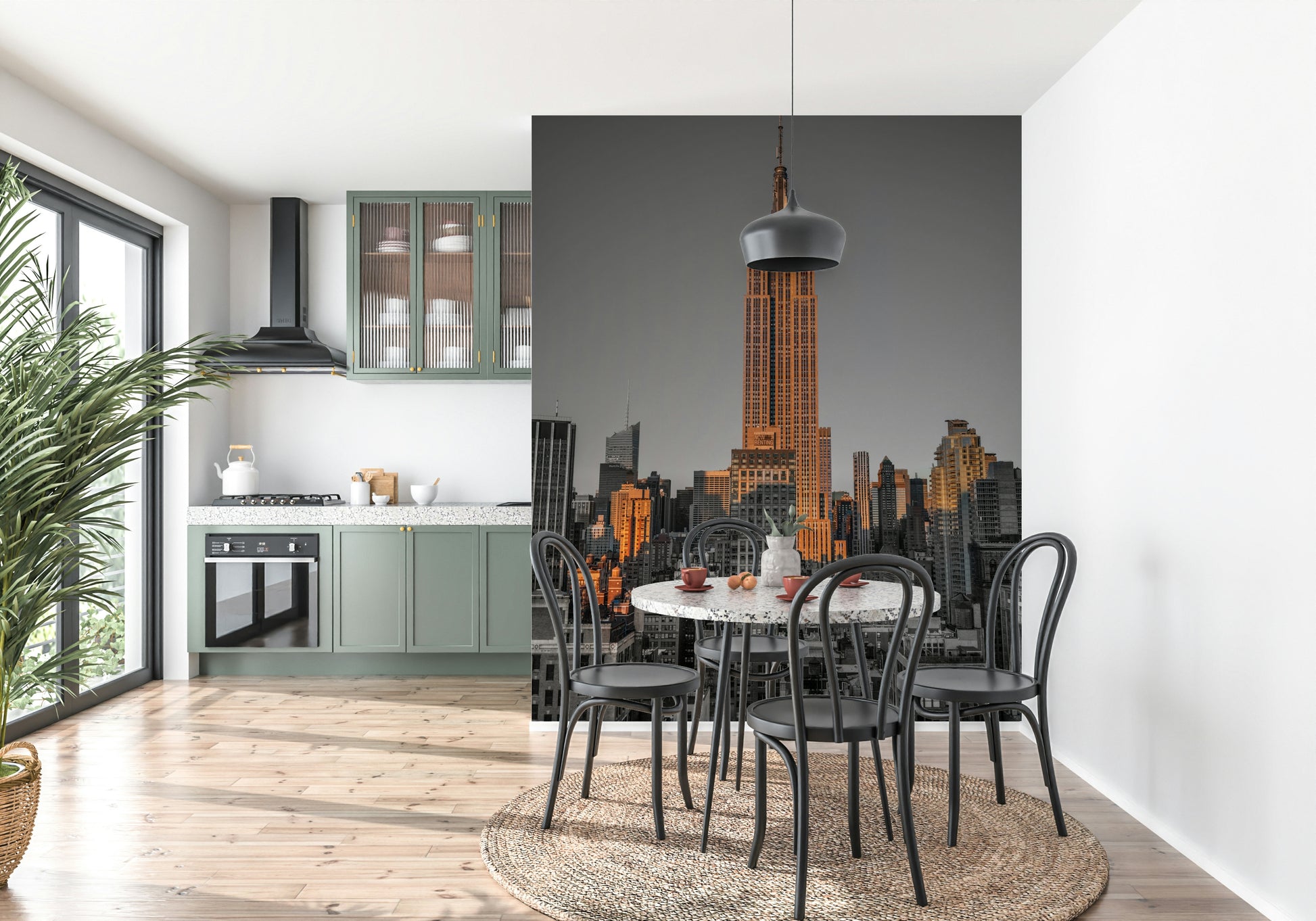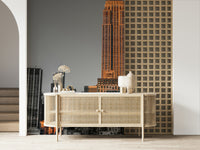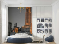 Empire State Building with New York City Manhattan skyline with skyscrapers. Introduce a touch of big-city glamour with this arresting cityscape featuring the Empire State Building. This wallpaper for walls uses selective colourisation to highlight the iconic building in radiant gold, contrasting against a muted, greyscale background. This design instantly infuses personality and intrigue into spaces. The warmth of the Empire State Building provides a comforting and stylish touch. Perfect for an entryway, bedroom, or study. Its striking contrast makes it pair effortlessly with modern furnishings. Bring New York's magic into your home with this unique vista.
