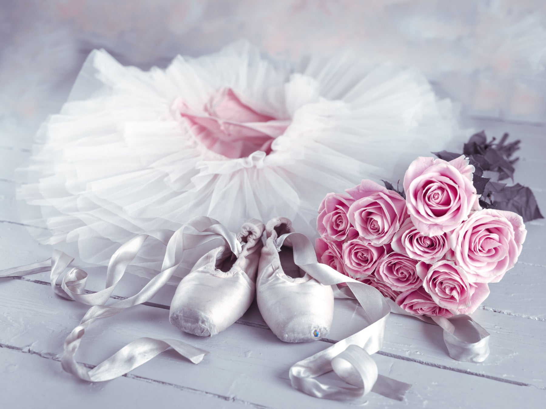 Ballet shoes and an elegant ballet skirt with a bunch of roses. Immerse yourself in the delicate beauty of "Graceful Ballet Still Life with Roses". This exquisite wallpaper captures the essence of ballet elegance, presenting a serene still life composition. Silken ballet slippers, worn and ready to dance, lie gracefully alongside a lush bouquet of blush pink roses. A pristine white tutu provides a soft, dreamlike backdrop, evoking the ethereal atmosphere of a backstage moment. The soft, muted color palette and gentle lighting create a sense of peace and tranquility, making it an ideal choice for adding a touch of refined sophistication to any space. Let the romantic allure of this ballet-inspired scene inspire your senses and elevate your digital environment with its timeless grace and charm. Perfect for lovers of dance, flowers, or simply refined aesthetics.