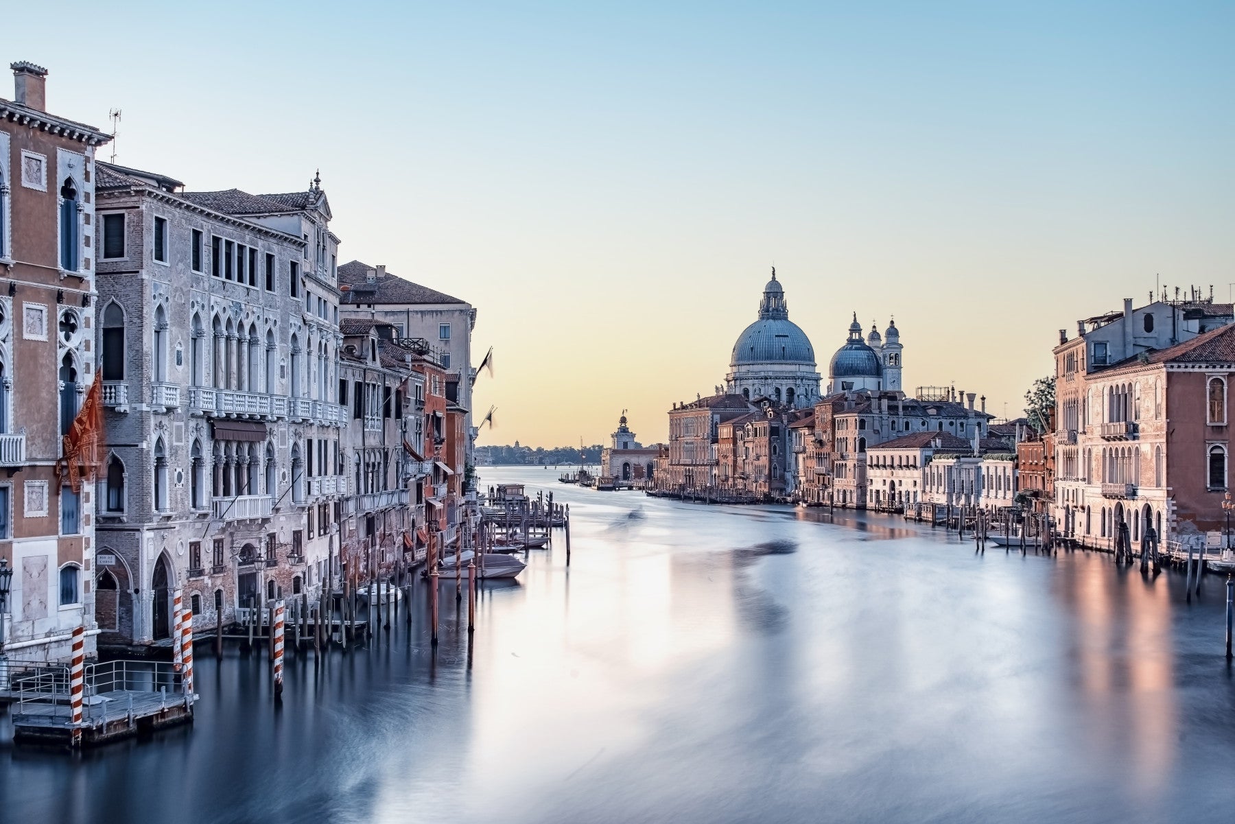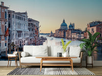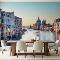 Invite a serene escape into your home with this cityscape scene. This wallpaper for walls captures the timeless beauty of Venice's Grand Canal at dawn. Gentle light bathes the historic buildings, creating a soft, inviting mood. The tranquil waterway reflects the sky, amplifying the sense of calm. With its muted colour palette and classic architectural design, this wallpaper suits a dining room or home office, providing a sophisticated backdrop. It enhances the perception of depth, making smaller rooms feel more spacious and lends a touch of Old World charm to any interior.