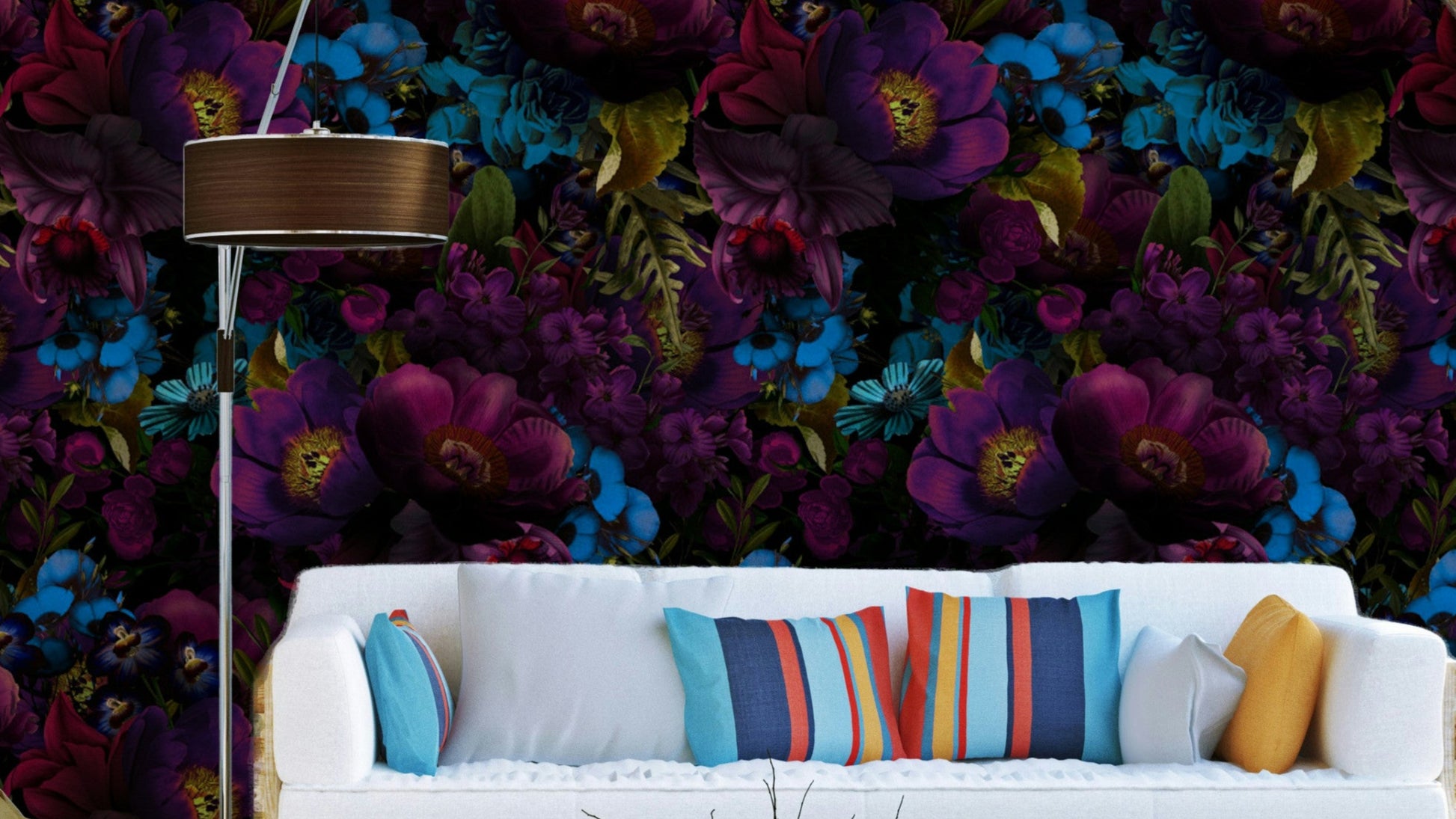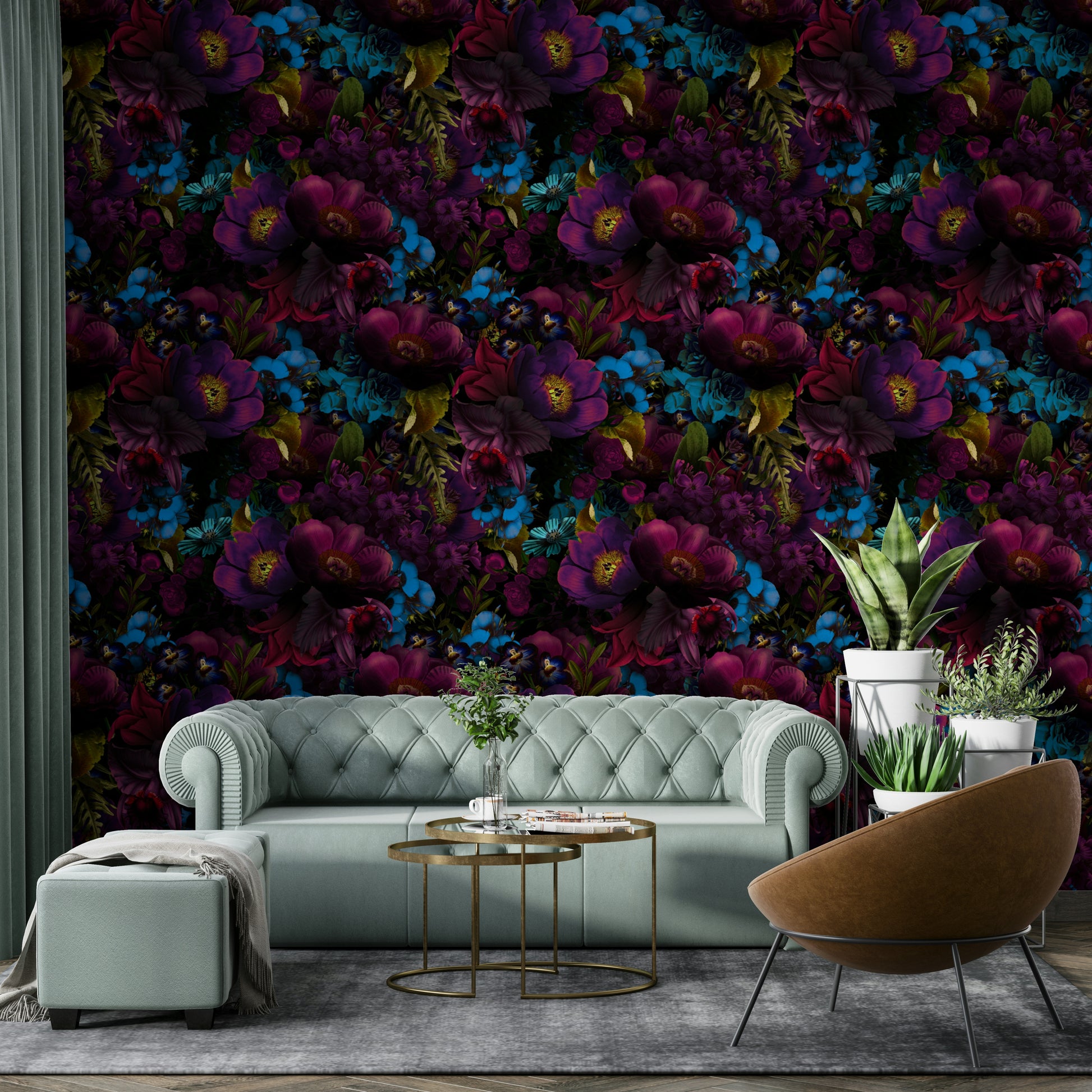 Indulge in the opulent allure of 'Grandmillennial Dramatic Glamour Heritage Gothic Dark Moody Florals 3'. This wallpaper design captures the essence of dark romanticism with its rich tapestry of deep purple, crimson, and vibrant teal blooms. Exquisitely detailed flowers, reminiscent of vintage botanical illustrations, are intricately arranged against a moody black backdrop. The dramatic contrast and rich color palette evoke a sense of gothic glamour, perfectly blending classic heritage floral patterns with a modern, moody twist, making it an ideal choice for adding a touch of sophisticated darkness to any space. The grandmillennial aesthetic shines through in the lavish abundance of the floral arrangement, creating a captivating and uniquely stylish wallpaper.