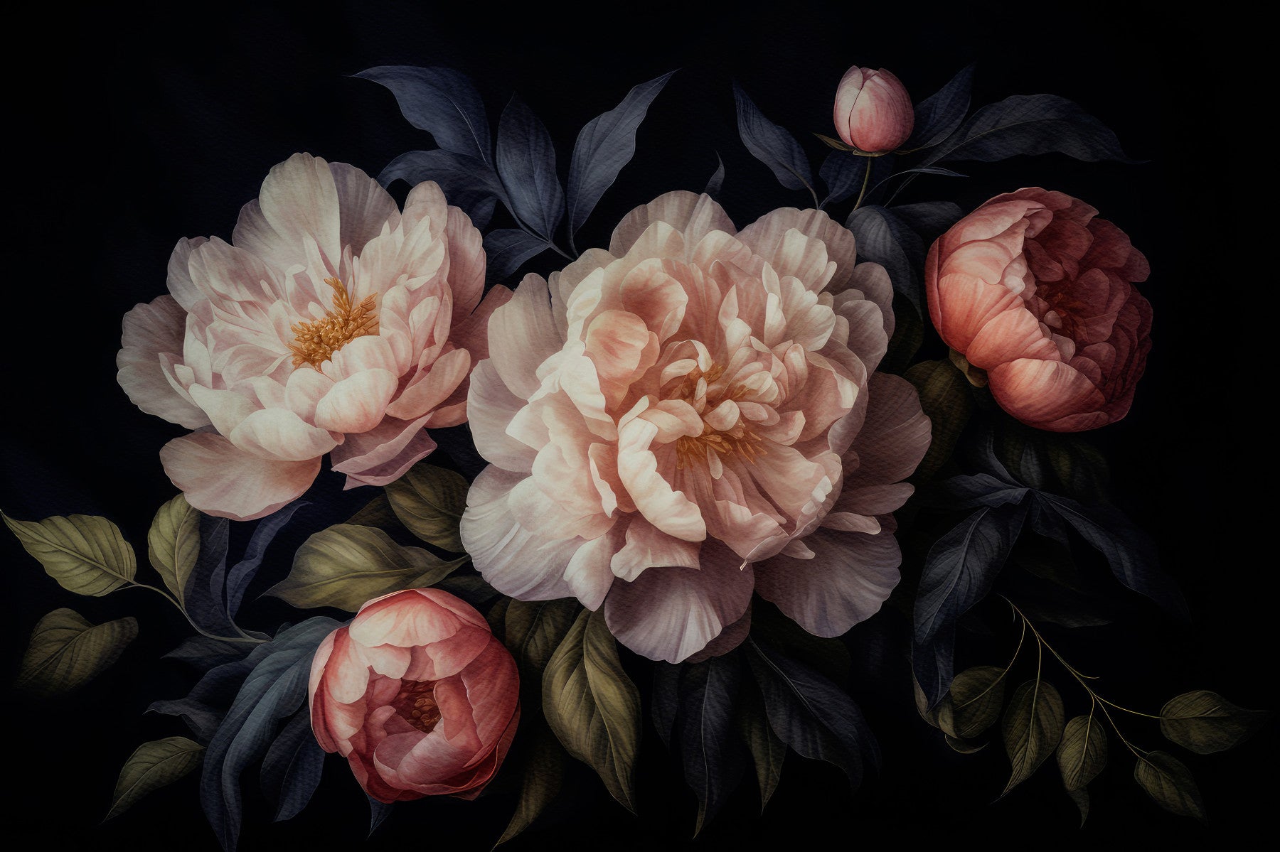 Moody peony floral wall mural for a dramatic home atmosphere.