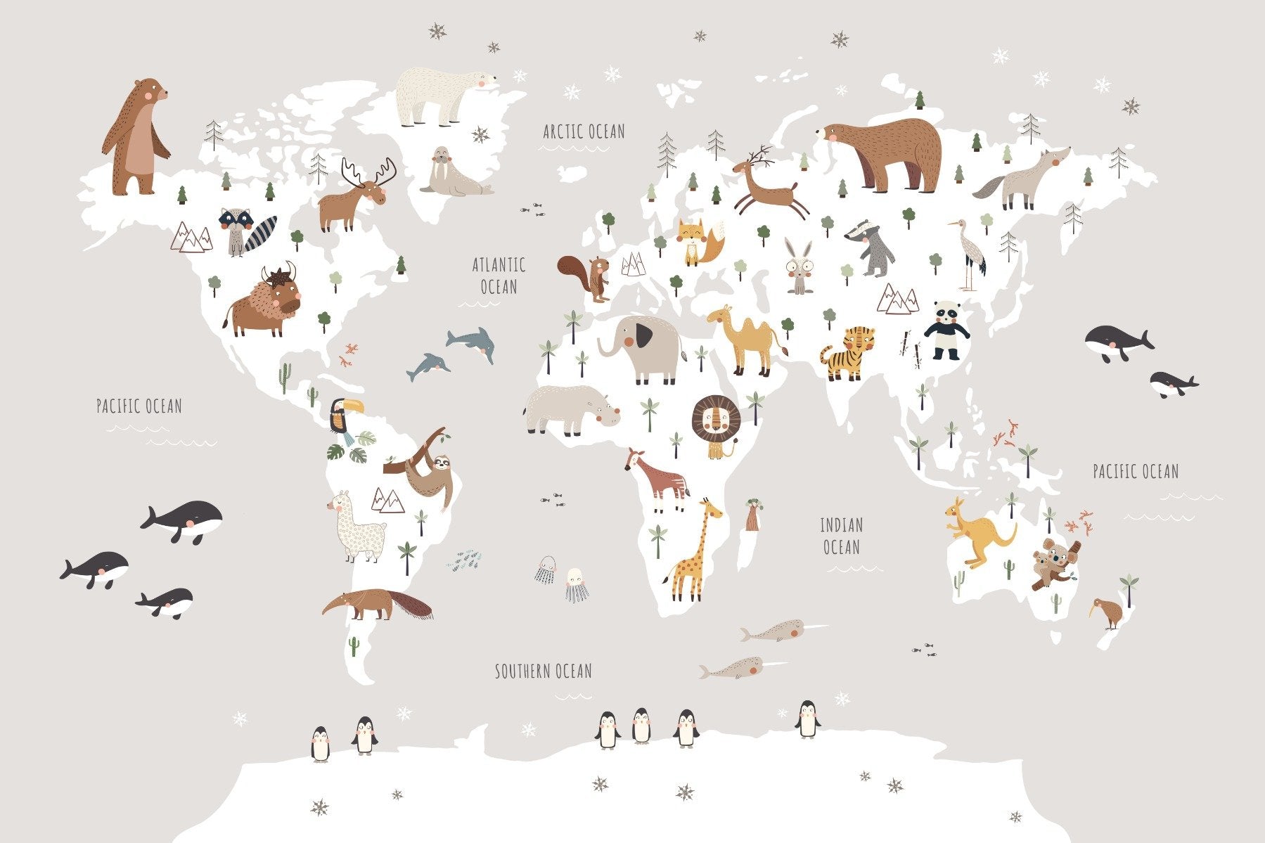 Bring a world of adventure to your child's room with our grey animal map wallpaper mural. This charming world map wallpaper features a large world map in soothing grey tones, adorned with delightful illustrations of animals from around the globe. Designed to spark curiosity and learning, this mural is a perfect addition to any nursery or playroom.
