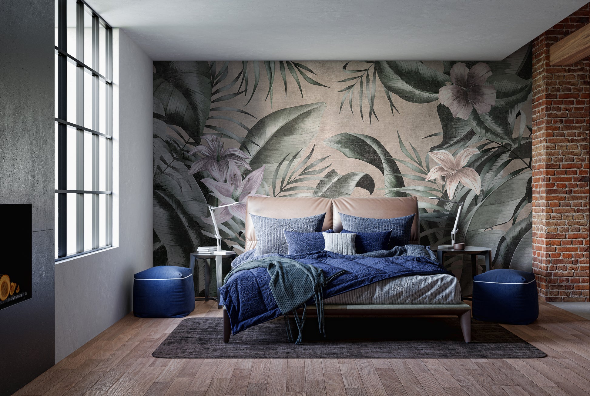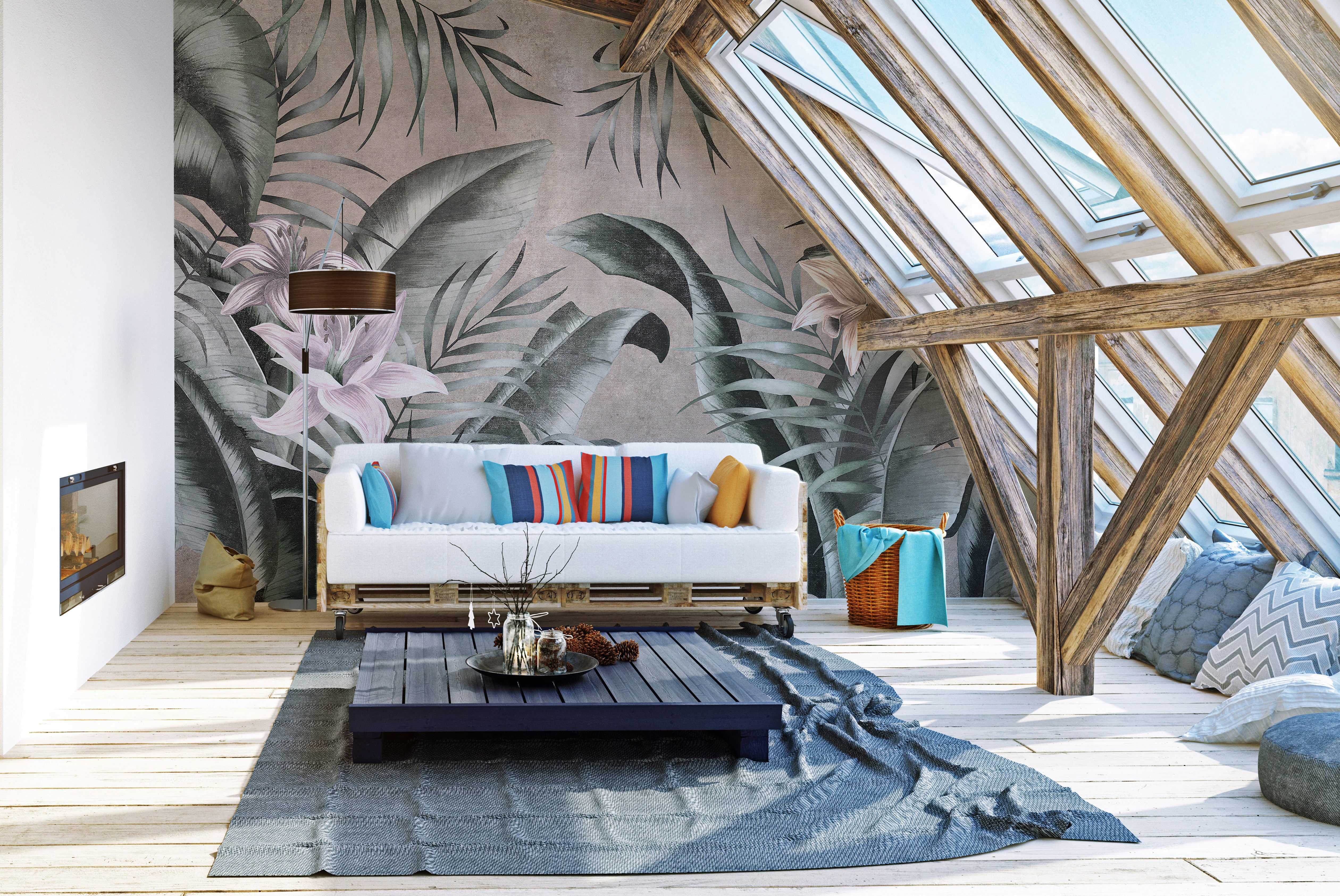 Large green leaves wallpaper mural on a neutral gray backdrop.