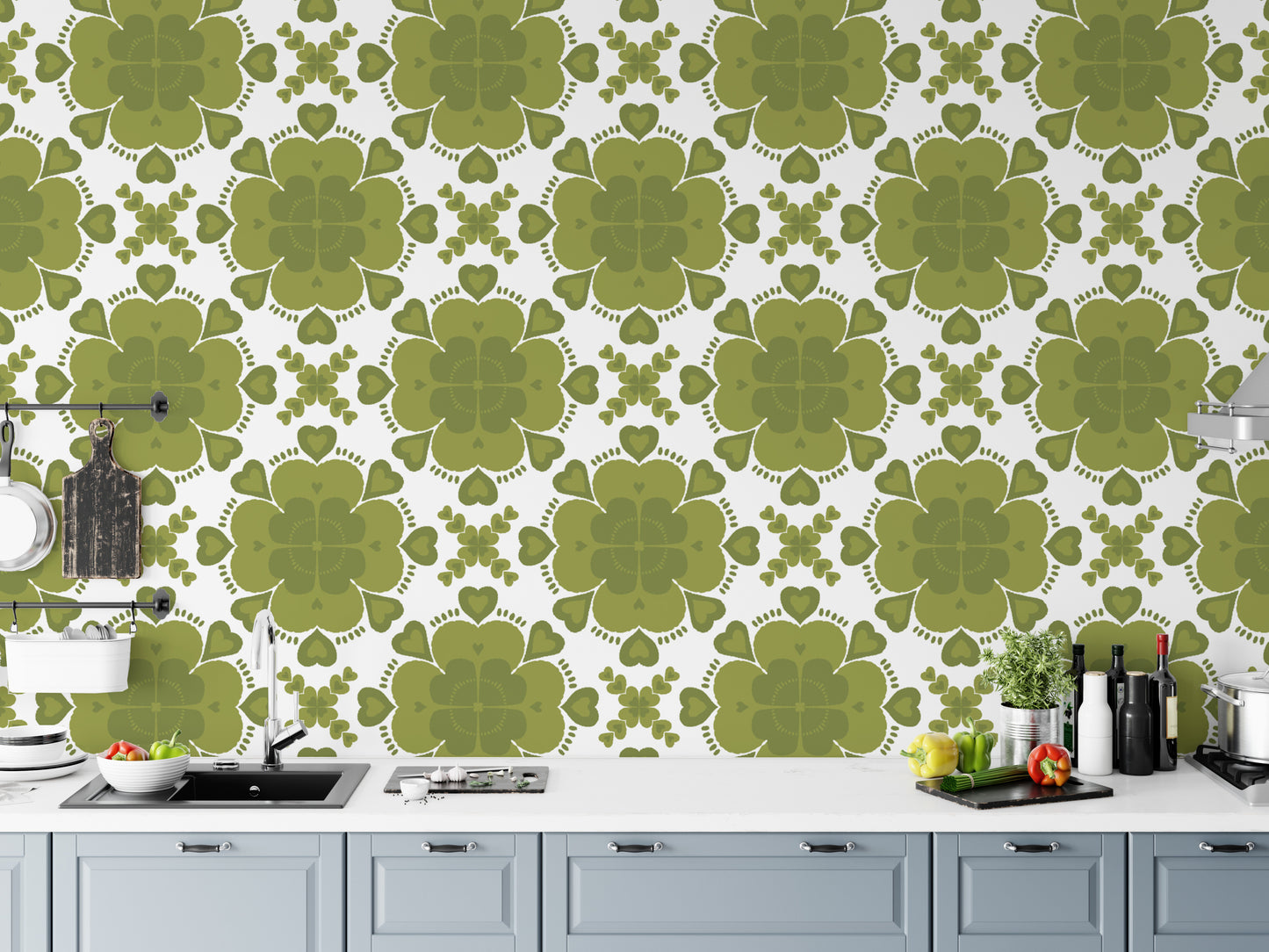 Nature-inspired green clover geometric wallpaper for serene interiors.
