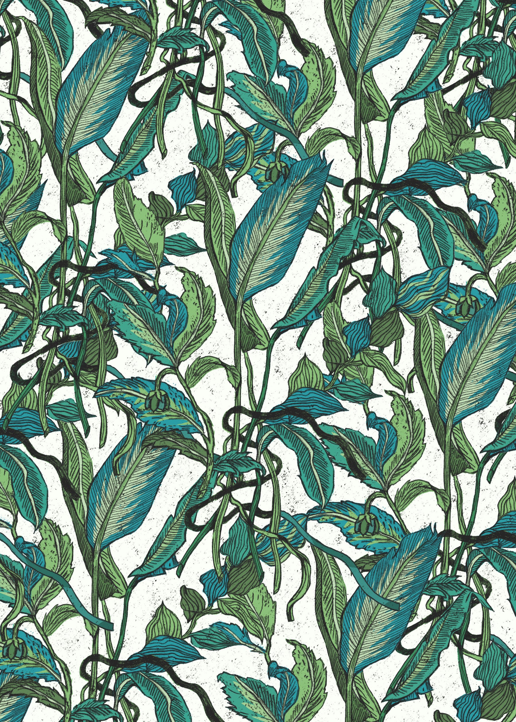 Escape into the serene embrace of 'Green Gardens,' a captivating wallpaper that brings the lush tranquility of a flourishing botanical haven to your screen. This design showcases an intricate tapestry of verdant foliage, where gracefully elongated leaves mingle with delicate, curling vines, all rendered in a refreshing palette of greens and blues. The artwork evokes the feeling of wandering through a secluded garden, teeming with life and whispering secrets. The hand-drawn style lends a timeless and artisanal touch, making it a perfect choice for adding a touch of natural elegance to any space. Let the soothing colors and organic forms of 'Green Gardens' transform your digital environment into a peaceful retreat, inspiring calm and creativity throughout your day.