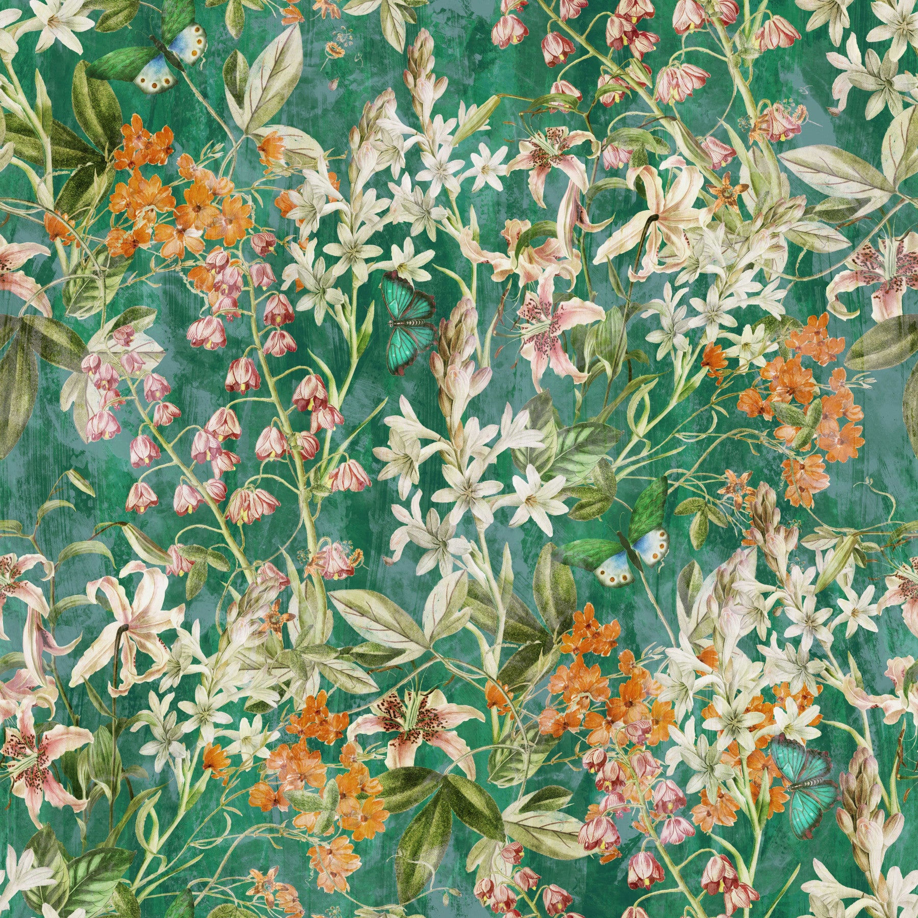 Transform your home into a lush garden retreat with this stunning wallpaper for walls. The design includes lilies and other spring blooms interspersed with delicate butterflies. The color scheme, with shades of green and blush, evokes a serene and calming atmosphere. Place it in your living room, bedroom, or even your office to create a refreshing indoor sanctuary. It will enhance any interior with its soft hues, detailed motifs, and botanical charm.