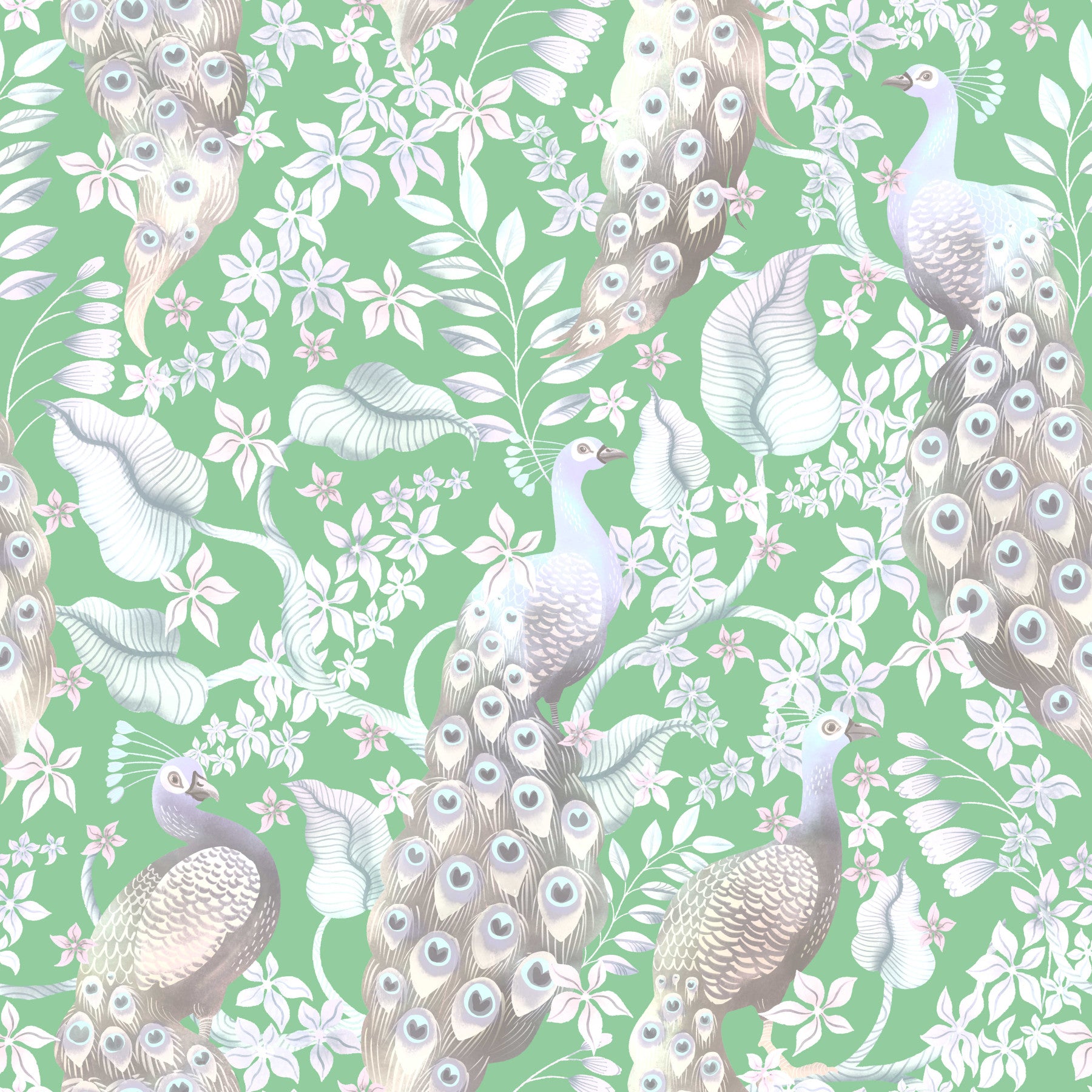 Escape to a serene 'Green Peacock Paradise' with this exquisite wallpaper. Elegant peacocks in soft, pastel hues are artfully entwined within a lush garden of delicate, white blossoms and flowing foliage against a calming mint green backdrop. The intricate details and watercolor-like textures create a sophisticated yet peaceful atmosphere, perfect for adding a touch of tranquility and exotic beauty to any space. This wallpaper evokes a sense of calm and wonder, transforming your room into a secret garden where majestic peacocks roam freely.