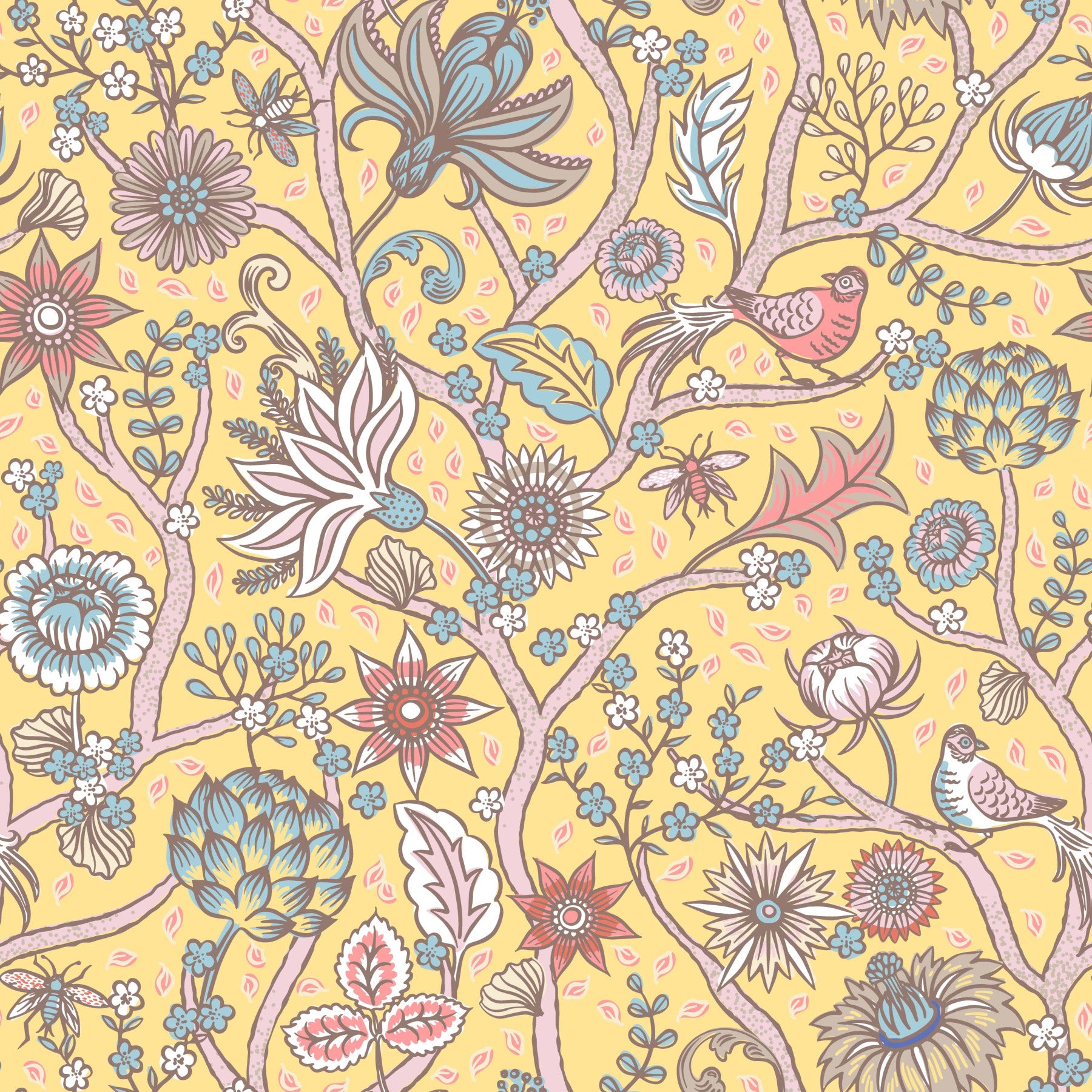 Embrace the vibrant energy of Green Tree of Life Yellow Wallpaper, a captivating wallpaper design. A whimsical, stylized tree, rendered in soft pastel greens and pinks, branches out across a sunny yellow backdrop, laden with an abundance of intricate flowers, delicate blossoms, and charming birds. The detailed floral patterns, including unique blossoms in shades of blue, pink, and cream, create a sense of lush, whimsical nature. Small, meticulously drawn insects add a touch of playful detail. This wallpaper exudes a cheerful, optimistic mood, perfect for bringing a touch of springtime elegance and joy to any space. The intricate details and soft color palette offer a harmonious blend of nature's beauty and artistic expression, making it a stunning addition to your digital collection.