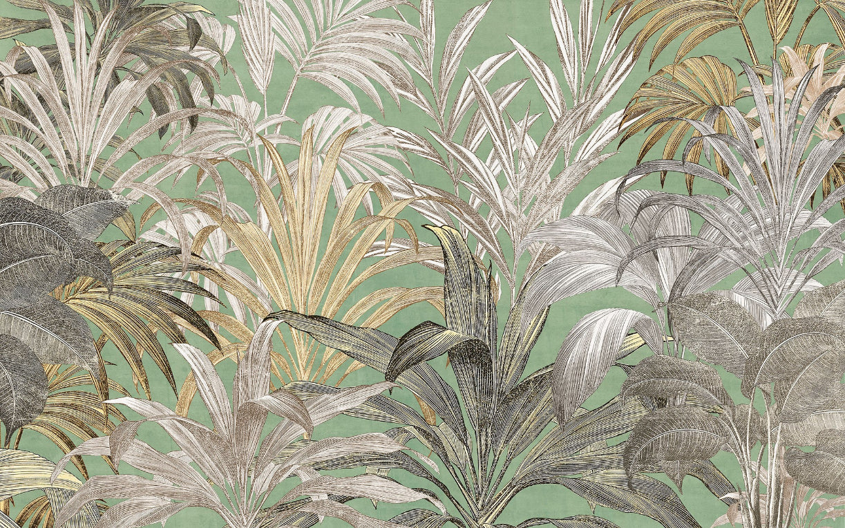 The green tropical leaf wallpaper mural brings the lush jungle beauty to your walls. This mural features intricate, hand-drawn tropical plants in rich green and gold tones and adds depth and texture to any room. The jungle foliage wallpaper design showcases layered leaves, creating a bold, vibrant backdrop perfect for living rooms, bedrooms, or offices. This green and gold botanical wallpaper's natural shades and detailed lines complement modern and traditional interiors. Let your walls reflect the wild beauty of nature with this nature-inspired tropical wallpaper, designed to refresh and energize your space.