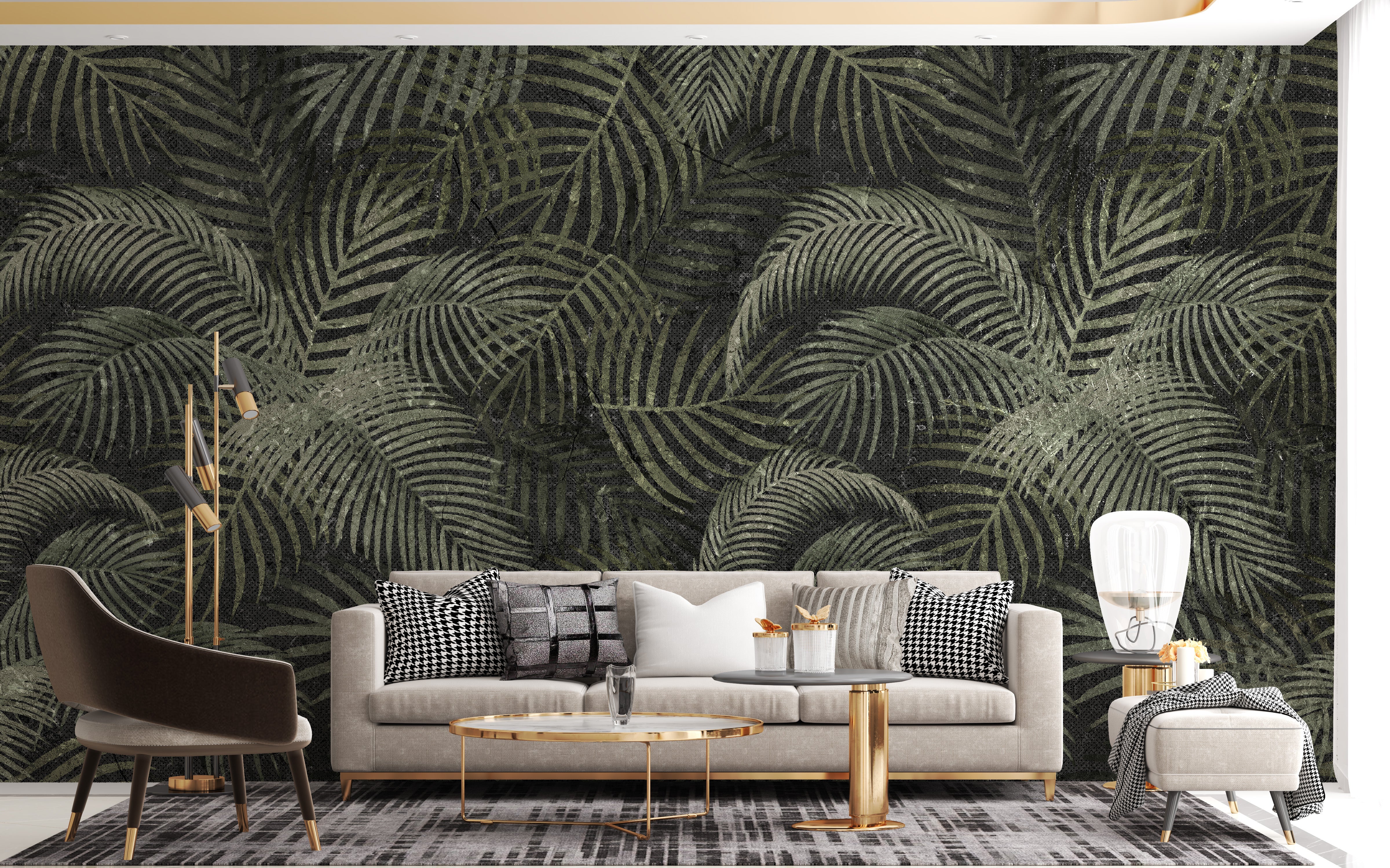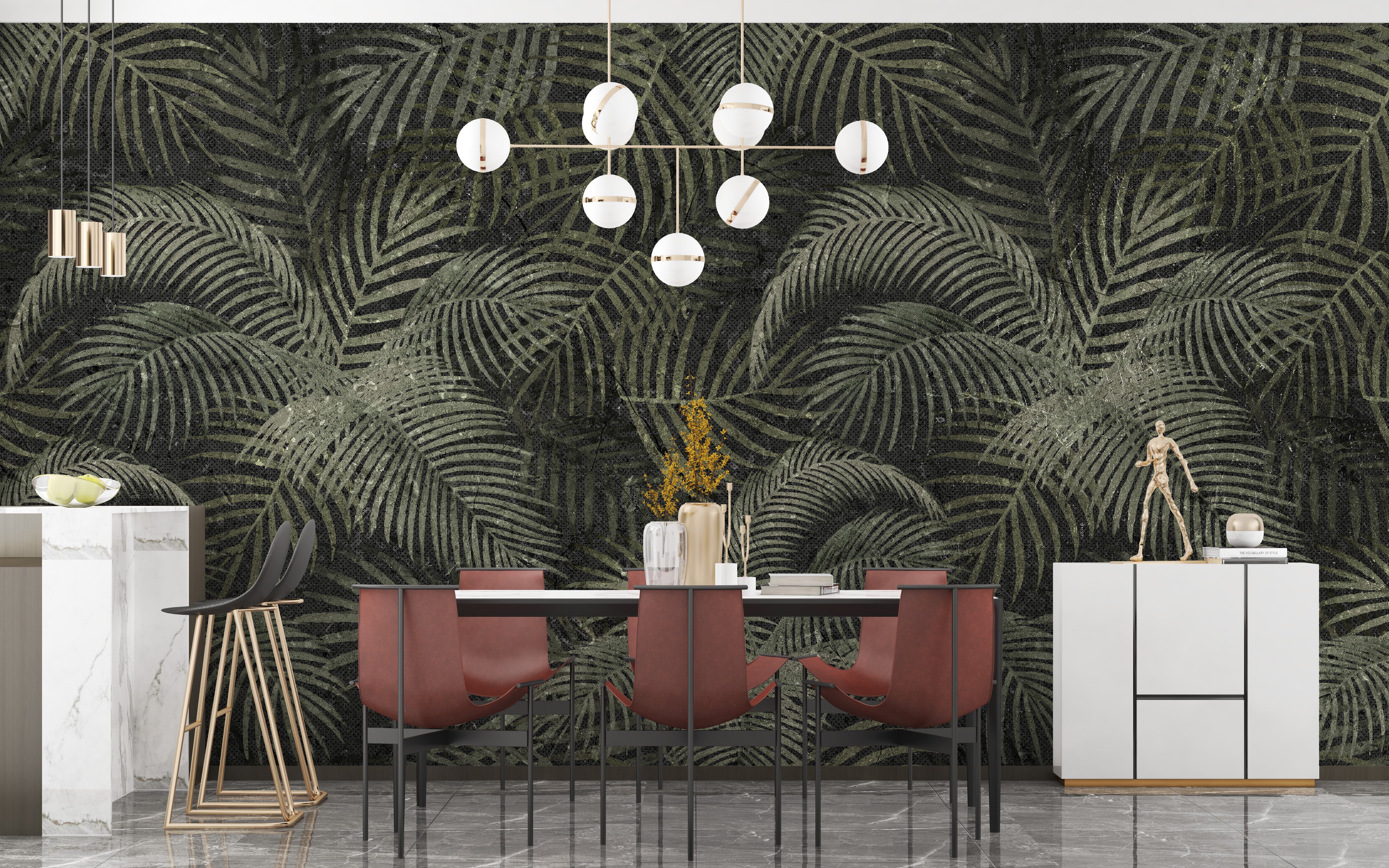 Ideal for patios and lobbies, this mural complement furniture in lighter shades, offering a striking contrast. Its mesmerizing charm and intense look bring a touch of elegance and tranquility to your interiors. Easy to apply, this tropical wallpaper mural is perfect for those seeking to add a natural, rustic touch to their living space. Revitalize your home with this captivating and unique design, and enjoy a refreshing ambiance every day.