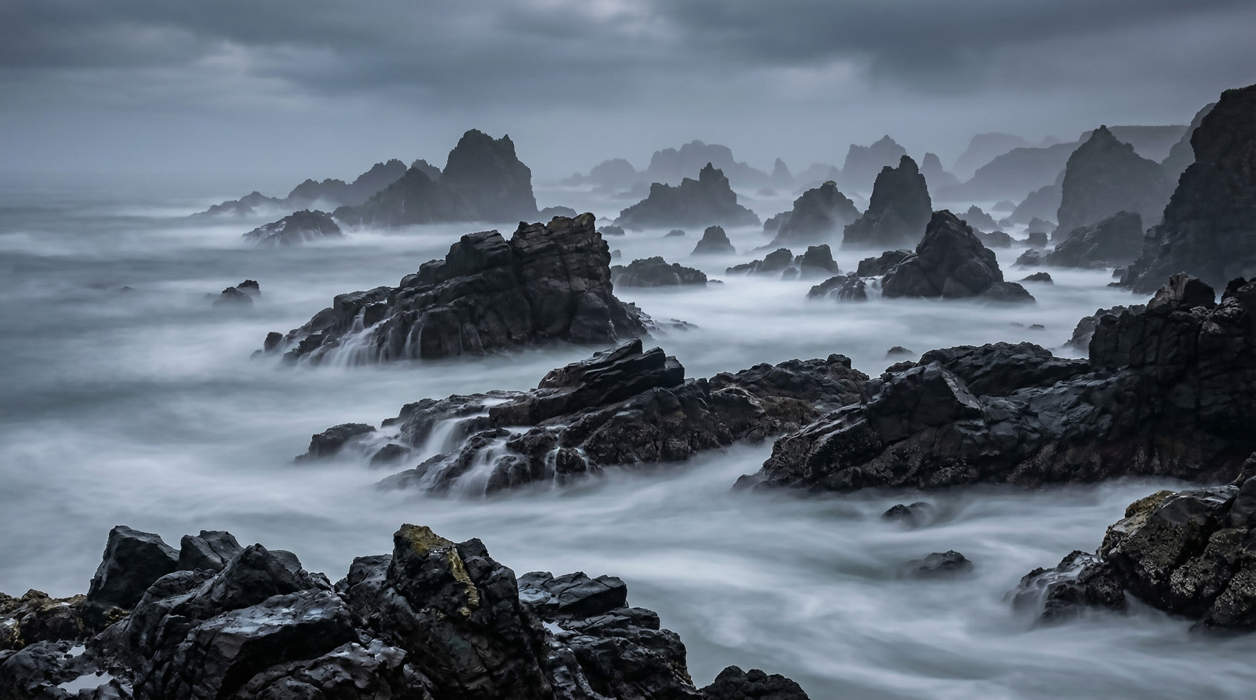 This striking wallpaper for walls captures the raw power and serene mystery of a rugged coastline. Jagged dark rock formations emerge from an ethereal, long-exposure sea, while a dramatic cloudy sky looms above. The design features a sophisticated colour palette dominated by deep greys, charcoal, and muted blues, highlighted by soft, misty whites. This atmospheric landscape photography creates a tranquil yet powerful focal point in any room. It transforms living rooms, bedrooms, or studies, infusing spaces with a contemplative and profound ambience. Install this design to expand the visual depth of a hallway or to create a serene backdrop in a modern dining room. Its dramatic beauty enhances contemporary and minimalist interiors.