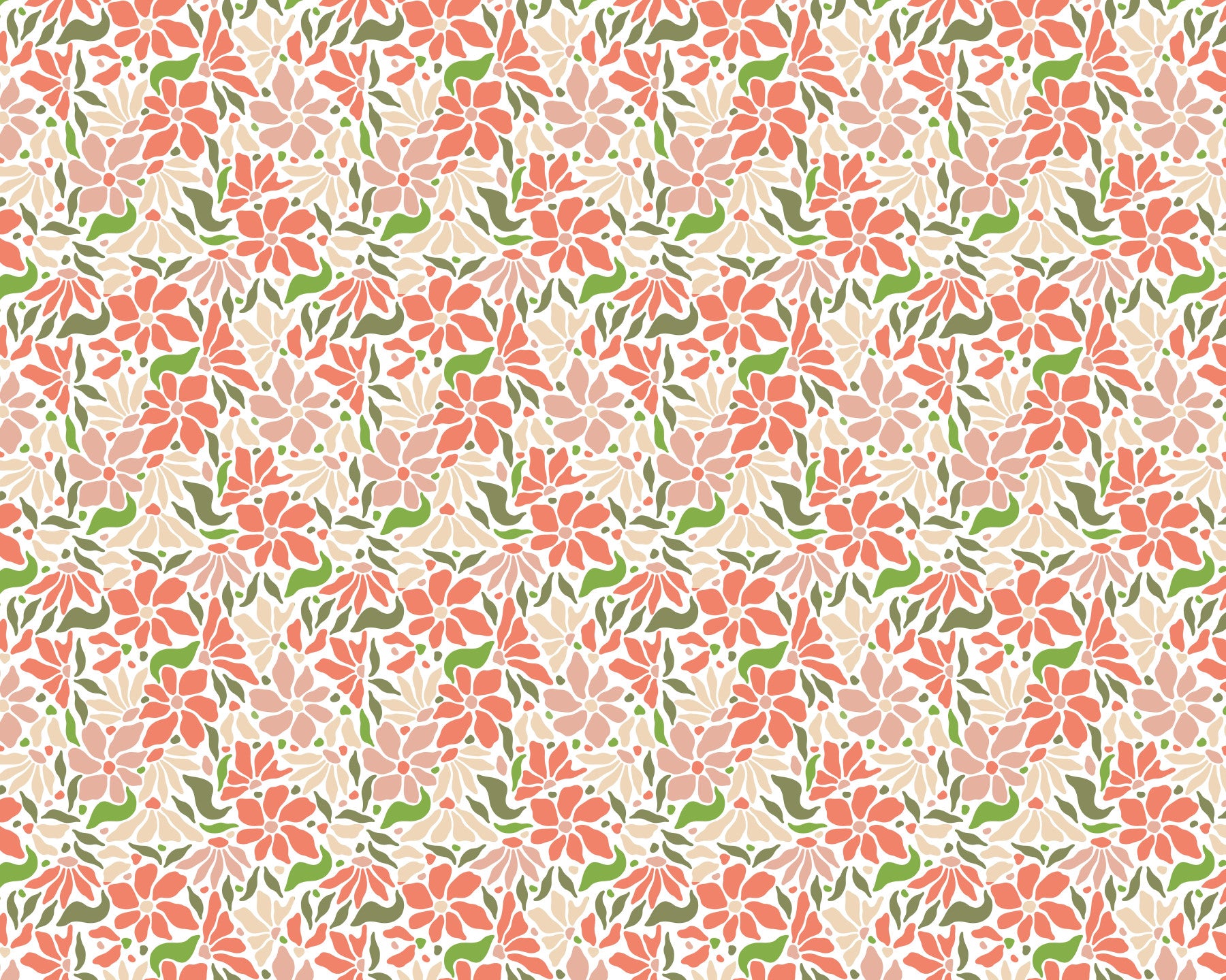 Embrace the retro vibe with Groovy Flowers Coral Green. This wallpaper bursts with a vibrant tapestry of coral and blush-toned flowers, playfully interspersed with olive-green leaves. The stylized floral design evokes a sense of carefree 70s charm, offering a bright and optimistic aesthetic. Perfect for adding a touch of vintage coolness to any digital device, this wallpaper is a delightful blend of color and pattern, sure to lift your mood and bring a joyful energy to your screen. The seamless repeat ensures a consistent and captivating visual experience.