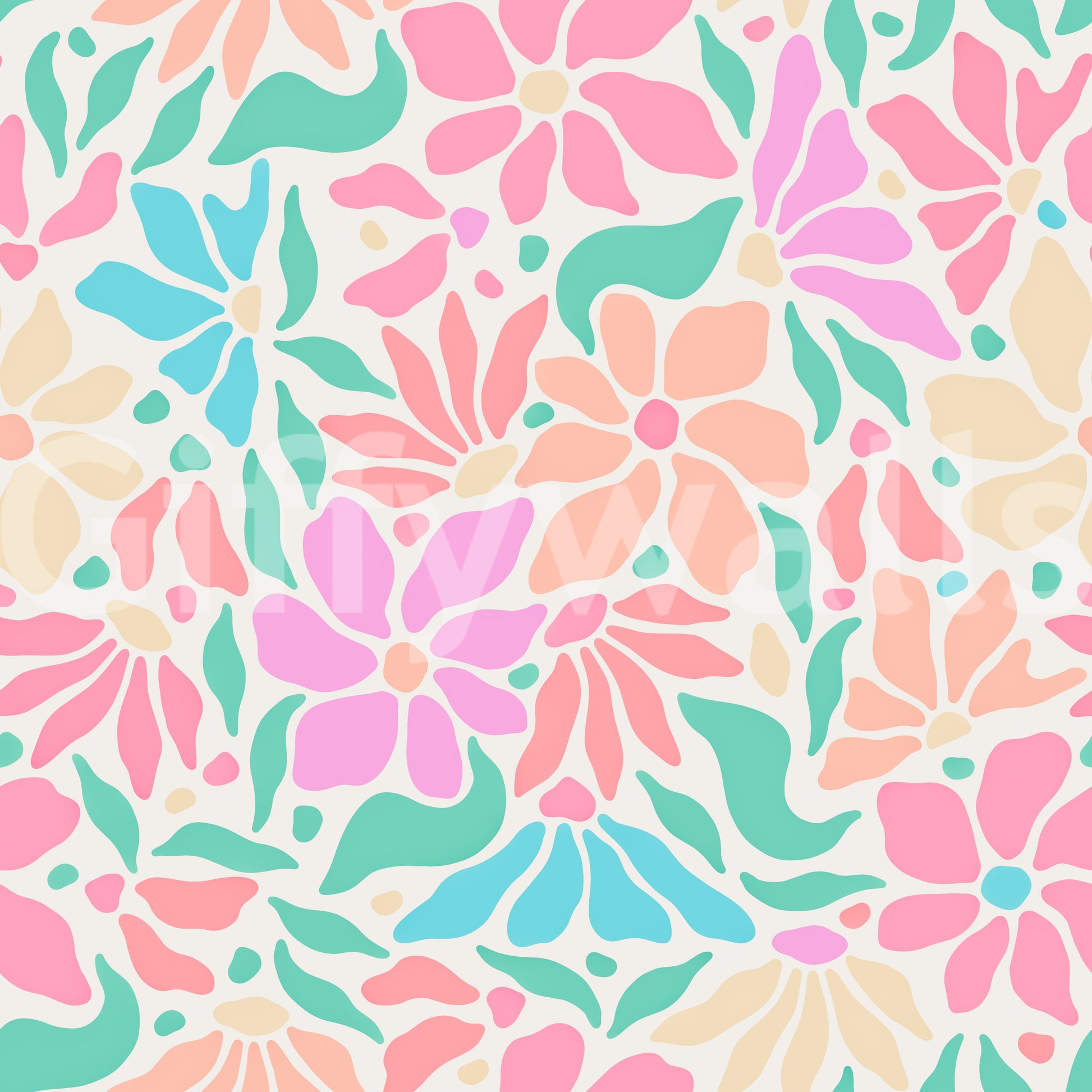 Dive into a vibrant world of 'Groovy Flowers,' a wallpaper design bursting with organic, free-flowing forms. Pastel pink, coral, mint green, and soft blue flower shapes dance across a creamy off-white background, creating a playful and uplifting mood. The stylized blossoms are reminiscent of 70s aesthetics, reflecting a retro-chic vibe. This seamless pattern offers a calming yet energetic backdrop, perfect for adding a touch of whimsical charm to any room.