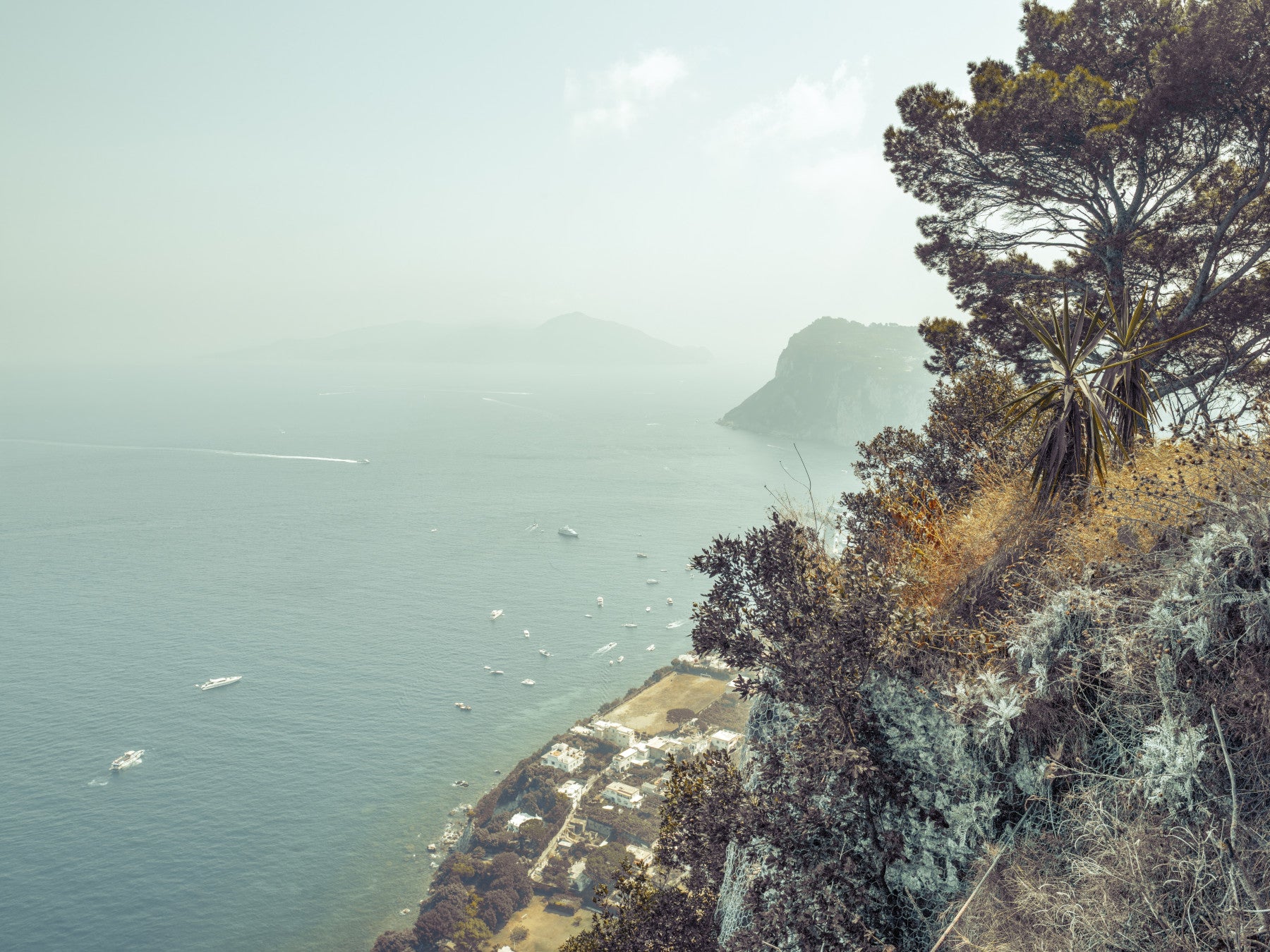 Adorn your home with the scenic beauty of our Gulf of Naples Wall Mural. This captivating mural wallpaper captures a breathtaking high-angle vista of the Gulf of Naples, showcasing the stunning coastline, the expanse of the Mediterranean Sea dotted with boats, and distant, misty islands under a soft, hazy sky. Lush vegetation clings to the foreground cliffs, adding a touch of natural texture. It's an ideal wallpaper for walls to introduce unique character and a profound sense of tranquil coastal scenery and the allure of the Italian Riviera to any room. Its panoramic view and serene atmosphere offer a compelling backdrop, ensuring your home feels both expansive and beautifully connected to the captivating landscapes of Southern Italy.