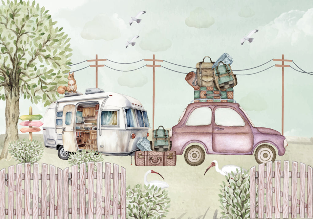Embark on a quaint voyage with the gypsy caravan capers Mural, the quintessential addition to any child's bedroom. This kids room wallpaper invites a playful narrative, with its picturesque landscape of rolling hills and a whimsical caravan ensemble. Each brushstroke tells a tale of adventure, perfect for sparking young imaginations. Vivid hues and artful details make storytelling a breeze, turning bedtime into an awaited journey through dreamy meadows. The delightful presence of friendly storks adds a touch of enchantment, creating a scene where stories unfold and daydreams are born. Wrap your little one's quarters in the warmth of this pastoral panorama, and watch their wonder take flight amidst these lovingly crafted wall whispers.