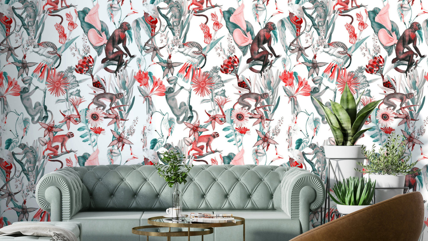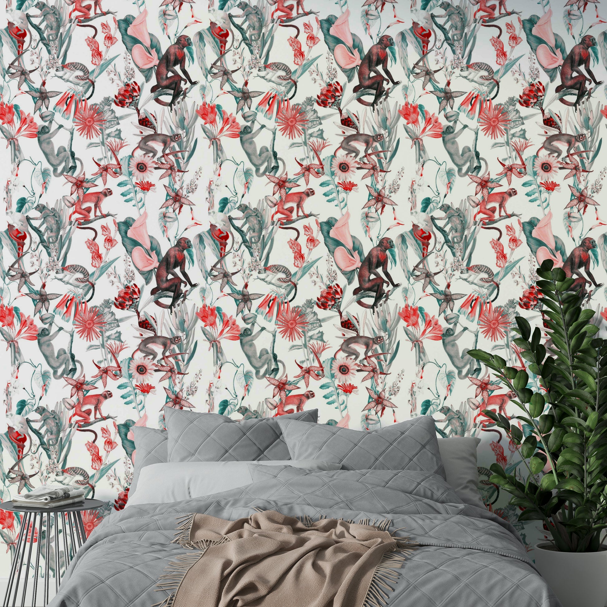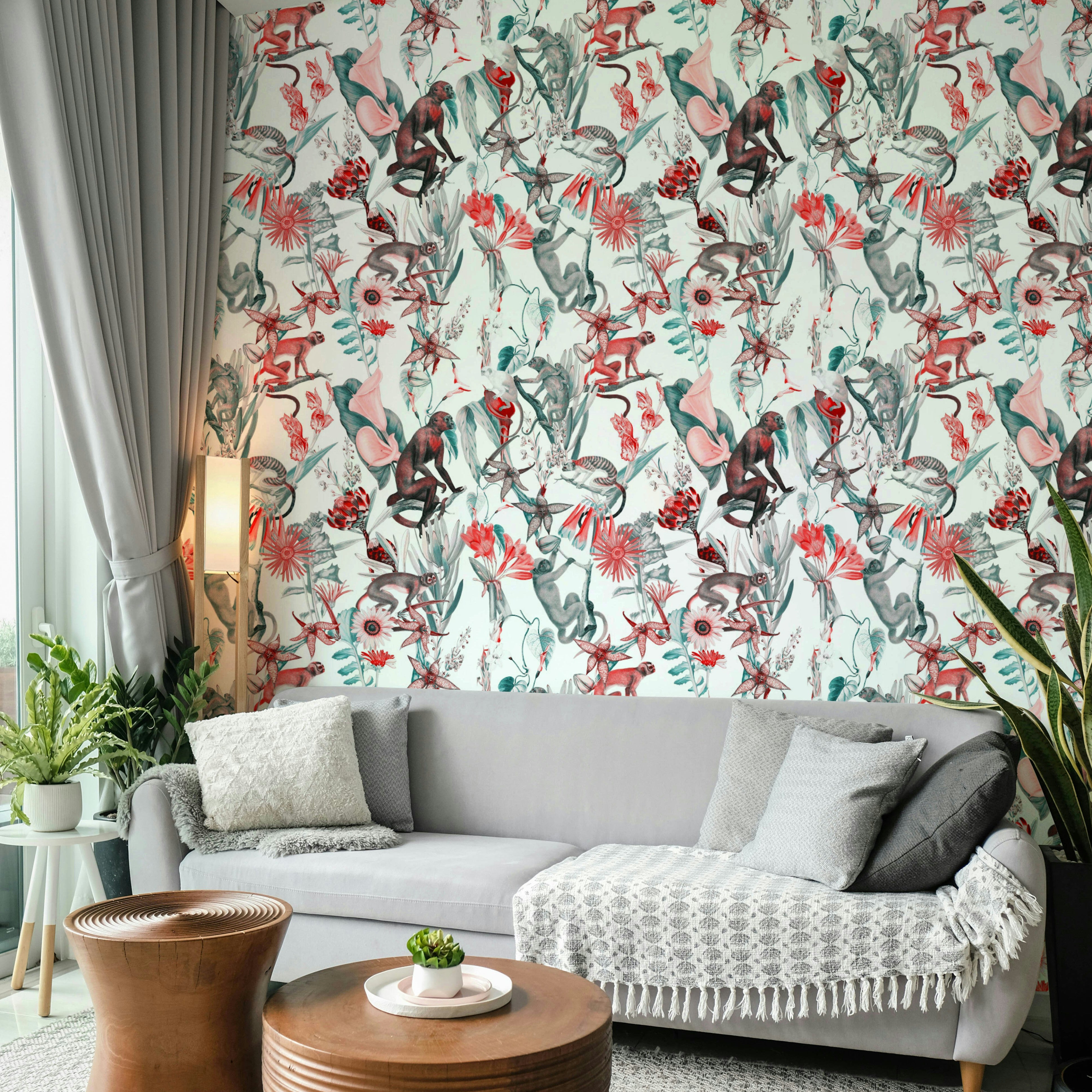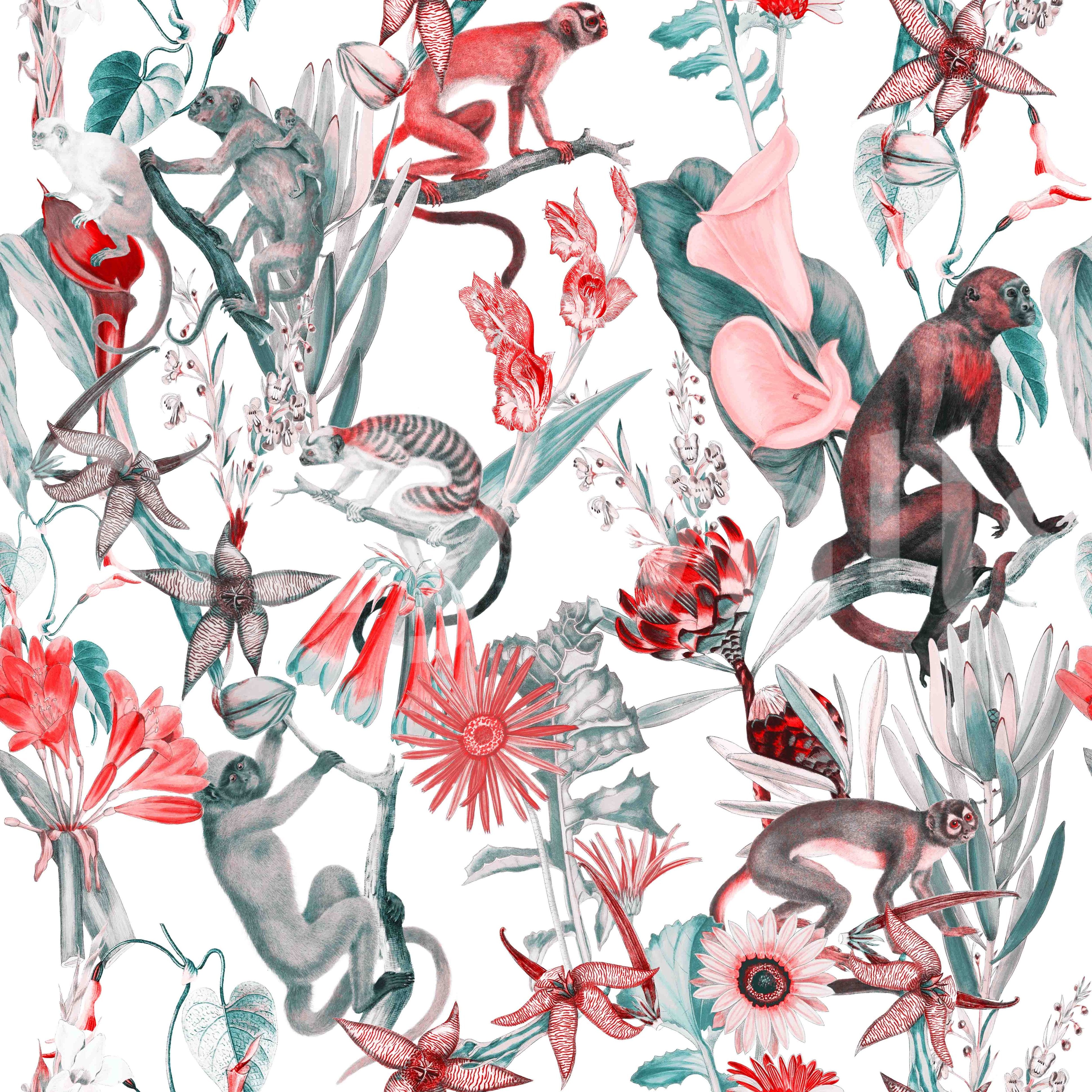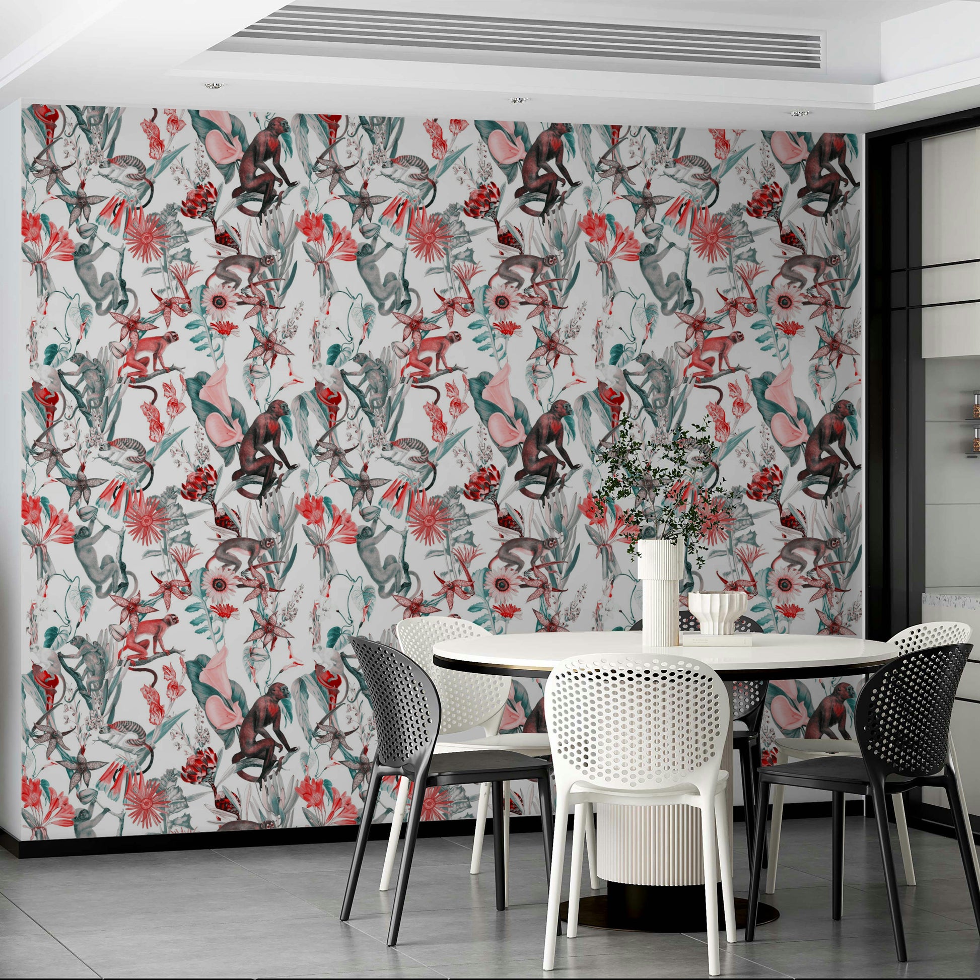 Embrace the carefree spirit of 'Hakuna' with this vibrant wallpaper. Lush flora in hues of muted teal and radiant red provide a backdrop for playful monkeys swinging and lounging amidst the foliage. The design evokes a sense of tranquility and whimsy, a reminder to let go of worries and appreciate the simple joys of life. The detailed botanical illustrations combined with the charming primate figures create a captivating visual experience, perfect for adding a touch of exotic serenity to any space. Let this wallpaper transport you to a world where 'Hakuna Matata' reigns supreme.