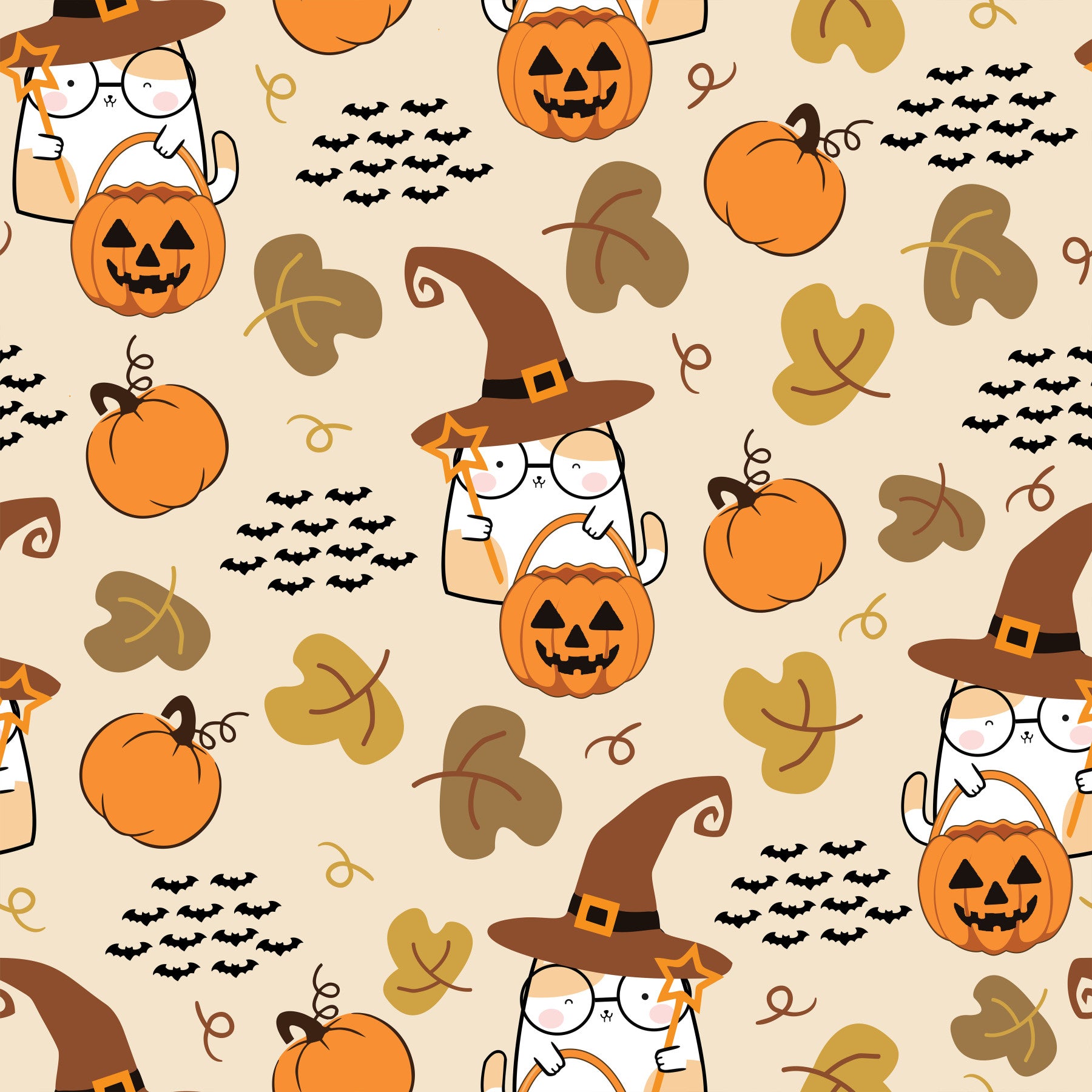 Cute Halloween Wallpaper with Cartoon Cats & Pumpkins.