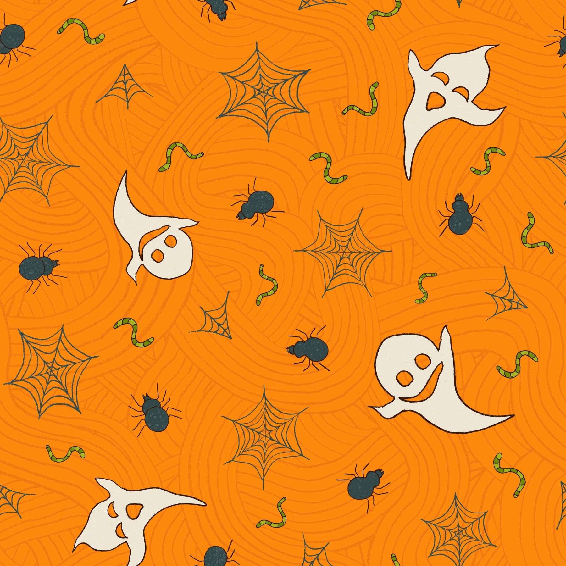 Get into the Halloween spirit with this fun and festive wallpaper for walls. The whimsical design features cheerful ghosts, spiderwebs, and cute spiders set against a bold orange backdrop. This playful pattern is perfect for children's bedrooms, play areas, or even a fun-themed bathroom. The design enlivens rooms with a playful Halloween spirit. Its cartoon style adds a touch of fantasy and works with any interior.