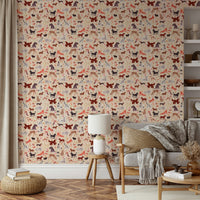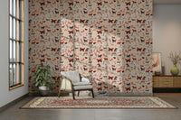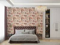 A delightful wallpaper featuring a charming collection of hand-drawn dogs. Each pup, rendered in a whimsical watercolor style against a soft beige and striped background, exudes happiness and playful energy. From playful Dachshunds to elegant Afghan Hounds, a diverse array of breeds frolic amidst scattered flowers and playful bones, creating a cheerful and vibrant scene perfect for dog lovers.