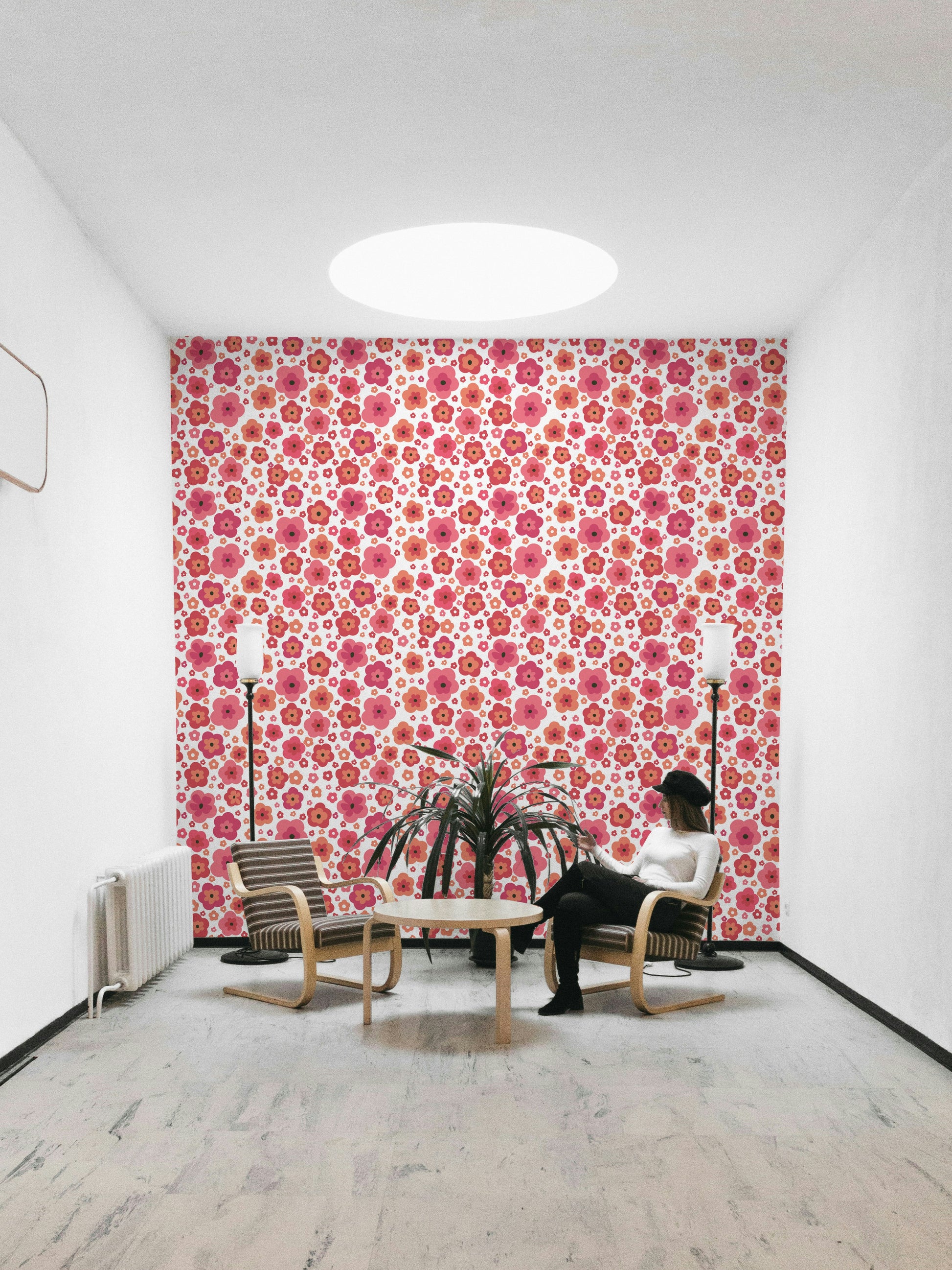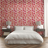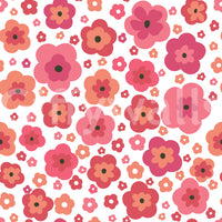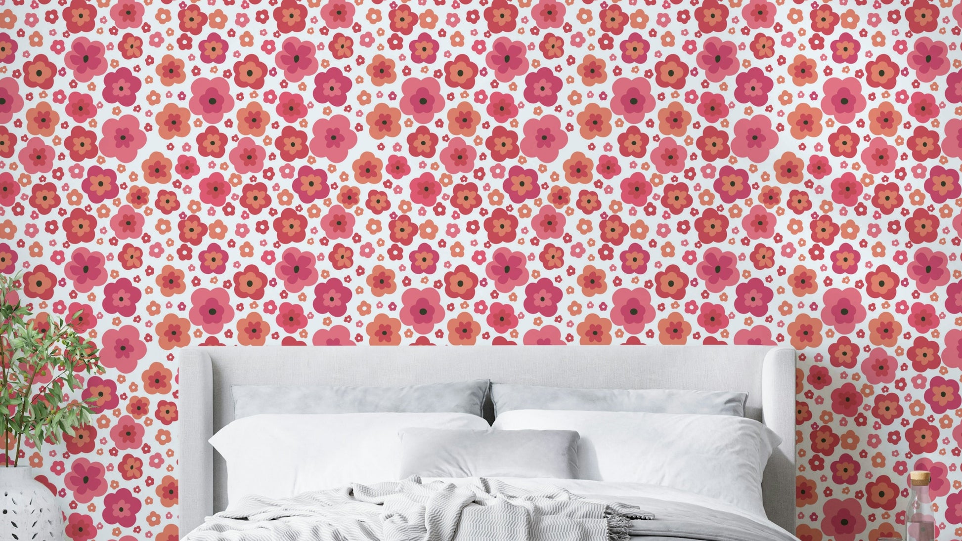 This wallpaper showcases a delightful retro-inspired floral pattern. A variety of pink and coral flowers in various sizes create a playful, yet sophisticated aesthetic. The hand-drawn style adds a touch of whimsical charm, making it perfect for adding a touch of vintage style to any room. The simple yet vibrant design makes it incredibly versatile, suitable for bedrooms, living rooms, or even kitchens. The bold colors and the carefree energy of the flowers produce a cheerful and optimistic mood.