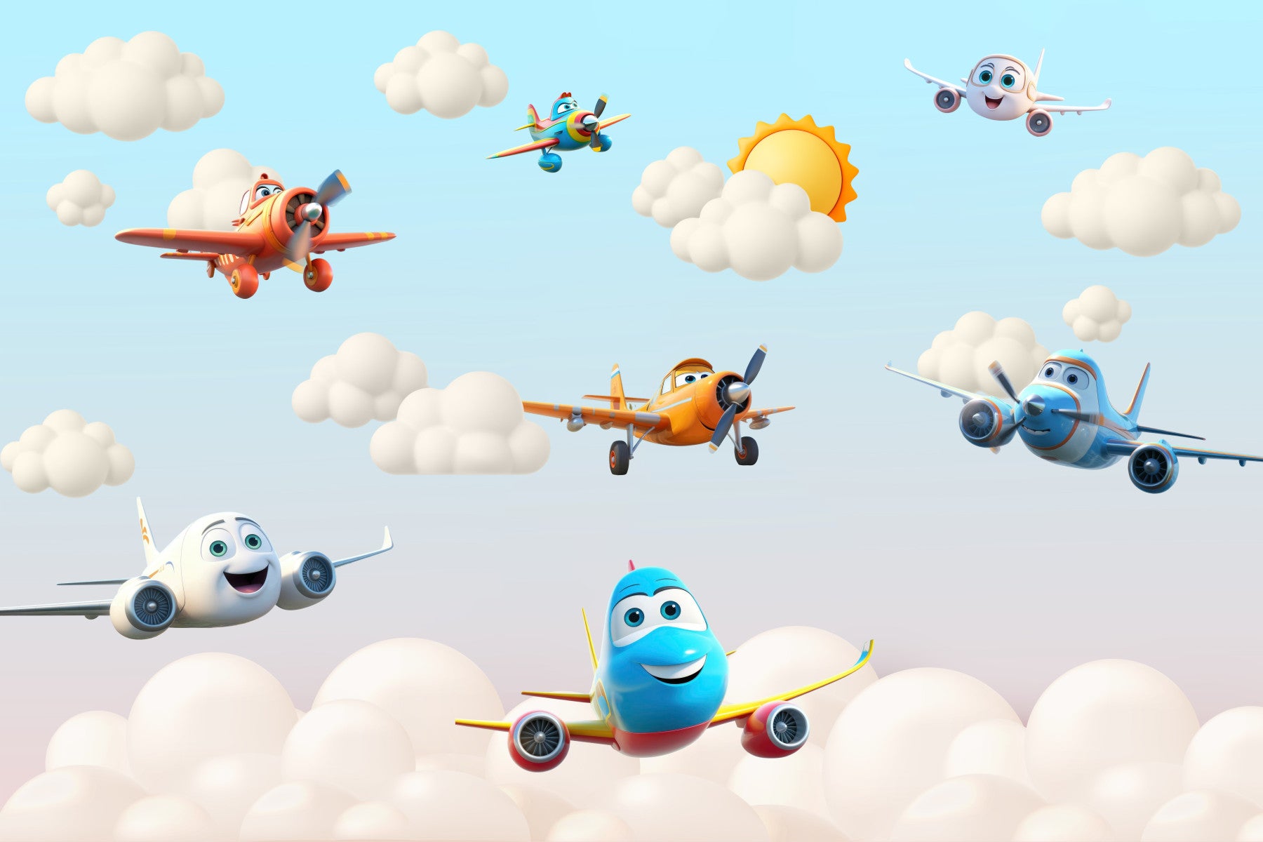 Invite smiles with this adorable wallpaper for walls. Happy cartoon airplanes dance among soft clouds, accompanied by a friendly sun. The design bursts with lively colors like sky blue, sunny yellow, and vibrant orange. Perfect for a kids' room or playroom, this cheerful wallpaper brings an uplifting vibe. It also complements modern interiors with its simple yet engaging design and creates a joyful scene.