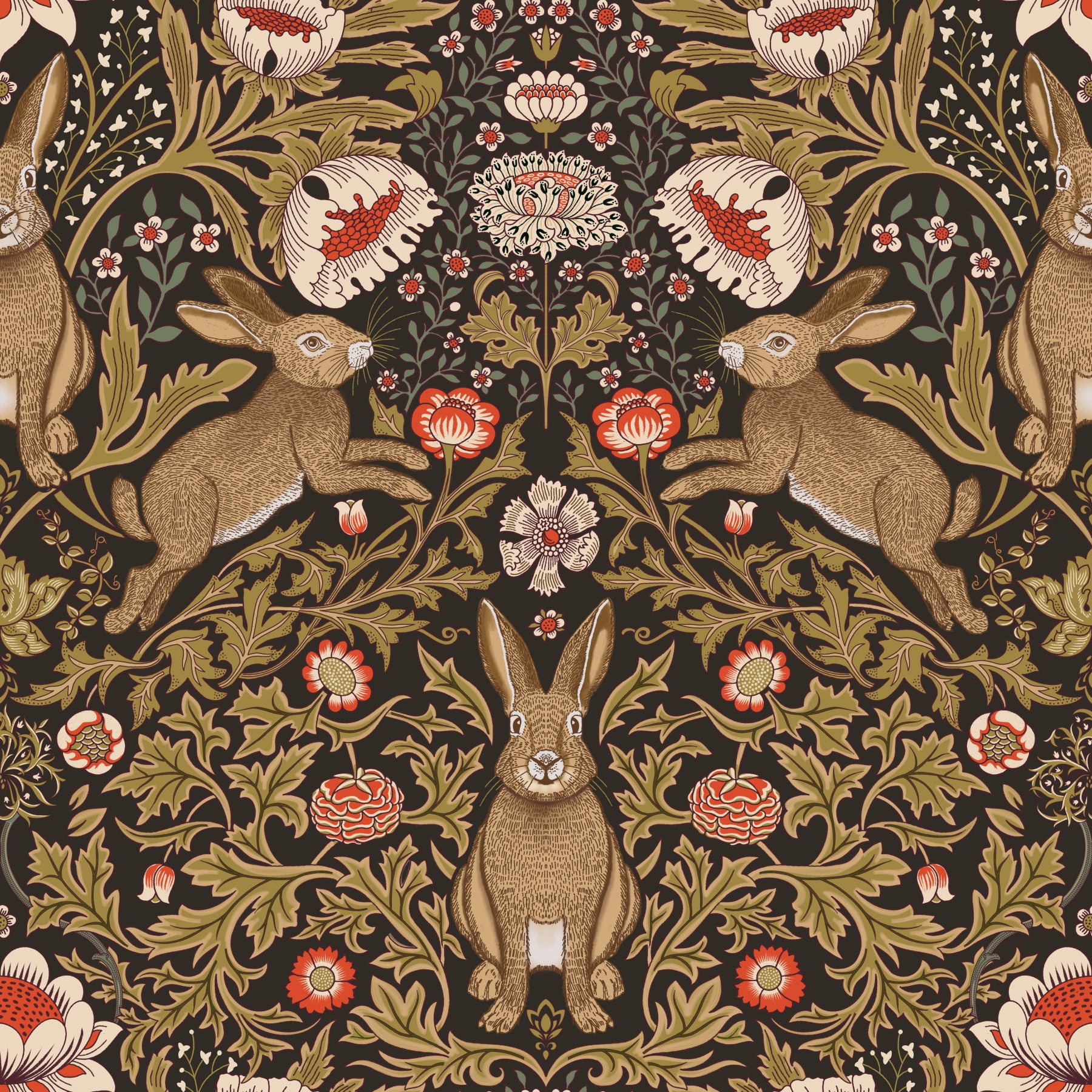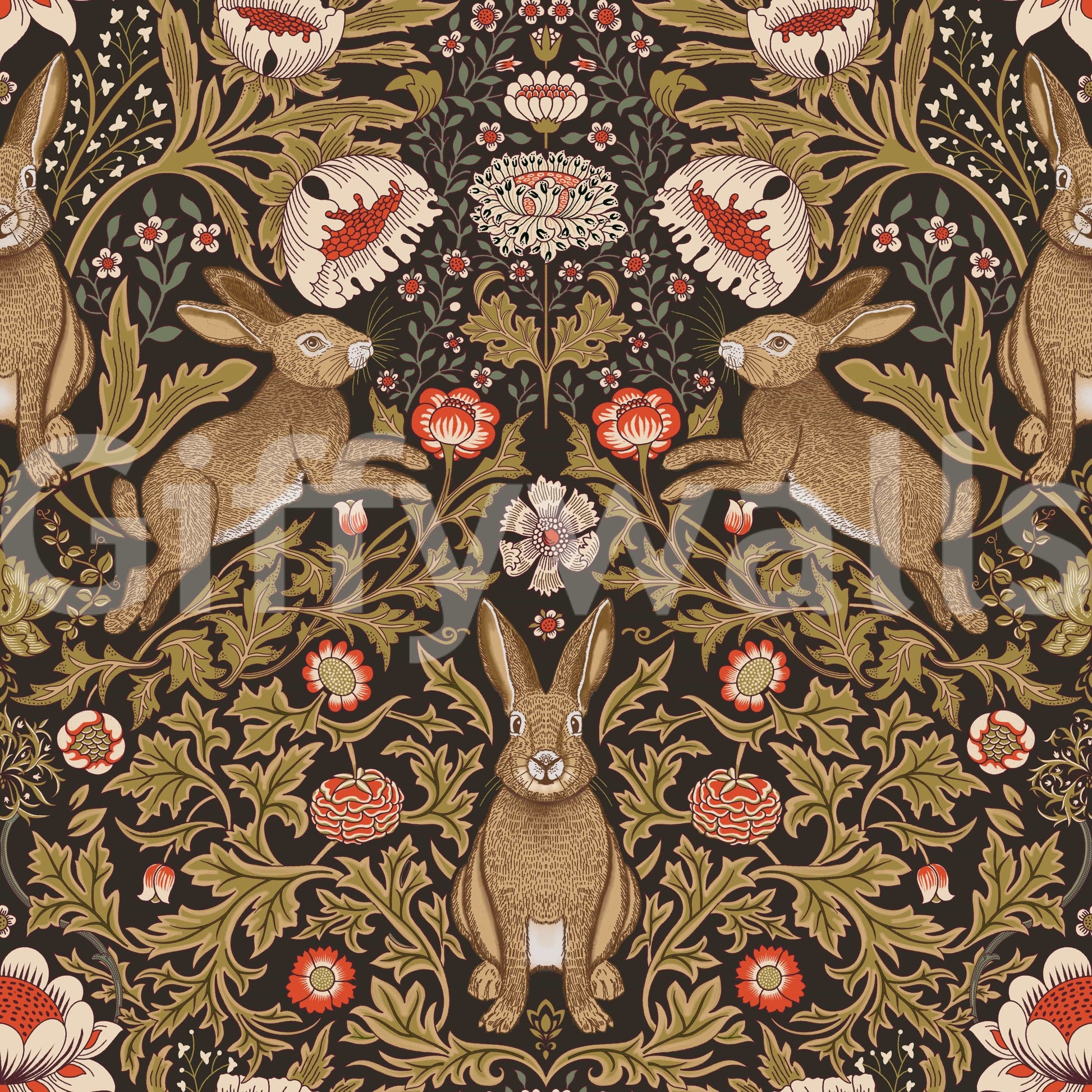 Bring a touch of classic countryside charm into your home with this beautifully intricate wallpaper. Featuring detailed rabbits among swirling foliage and stylized flowers, it creates a sophisticated yet cosy feel. The muted tones of brown, cream, and red offer warmth to any space. This wallpaper for walls transforms living rooms, bedrooms, or hallways into spaces with timeless appeal, perfectly complementing both modern and traditional interiors.