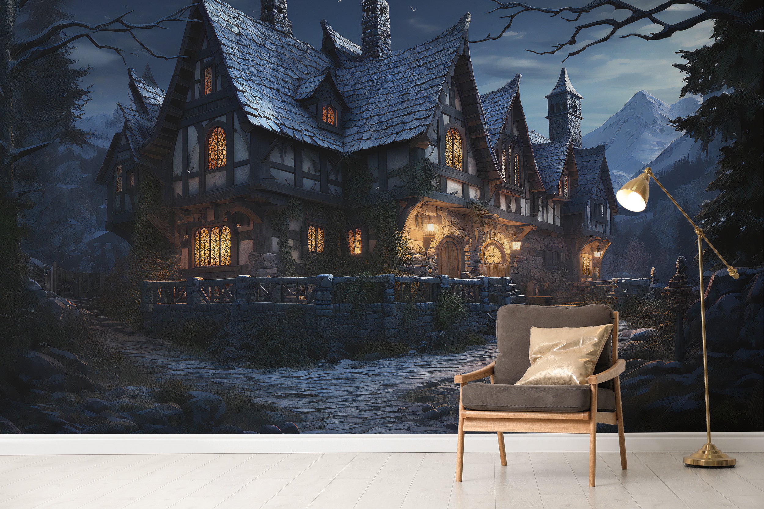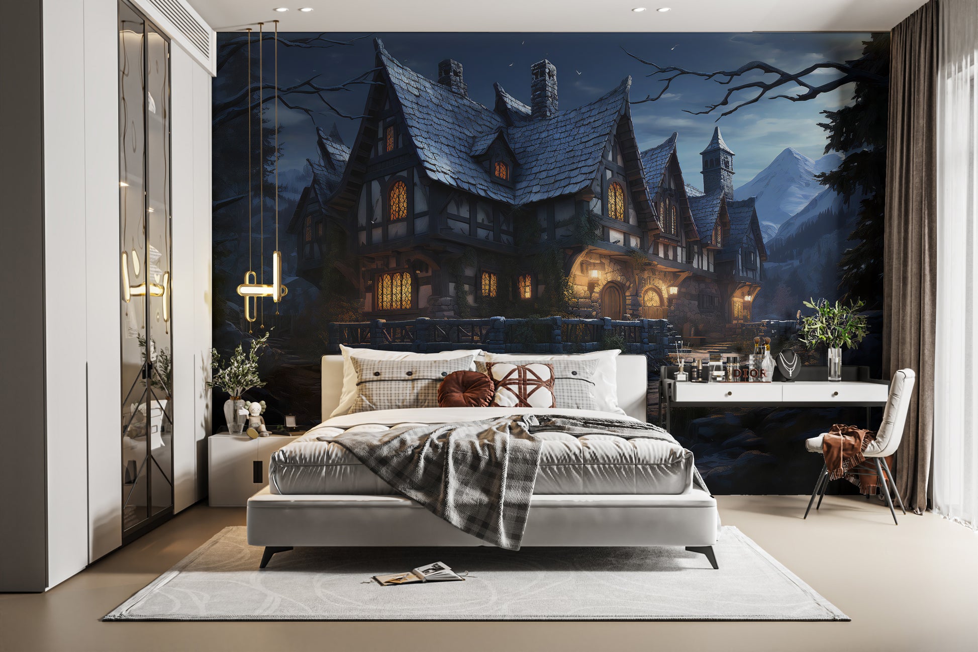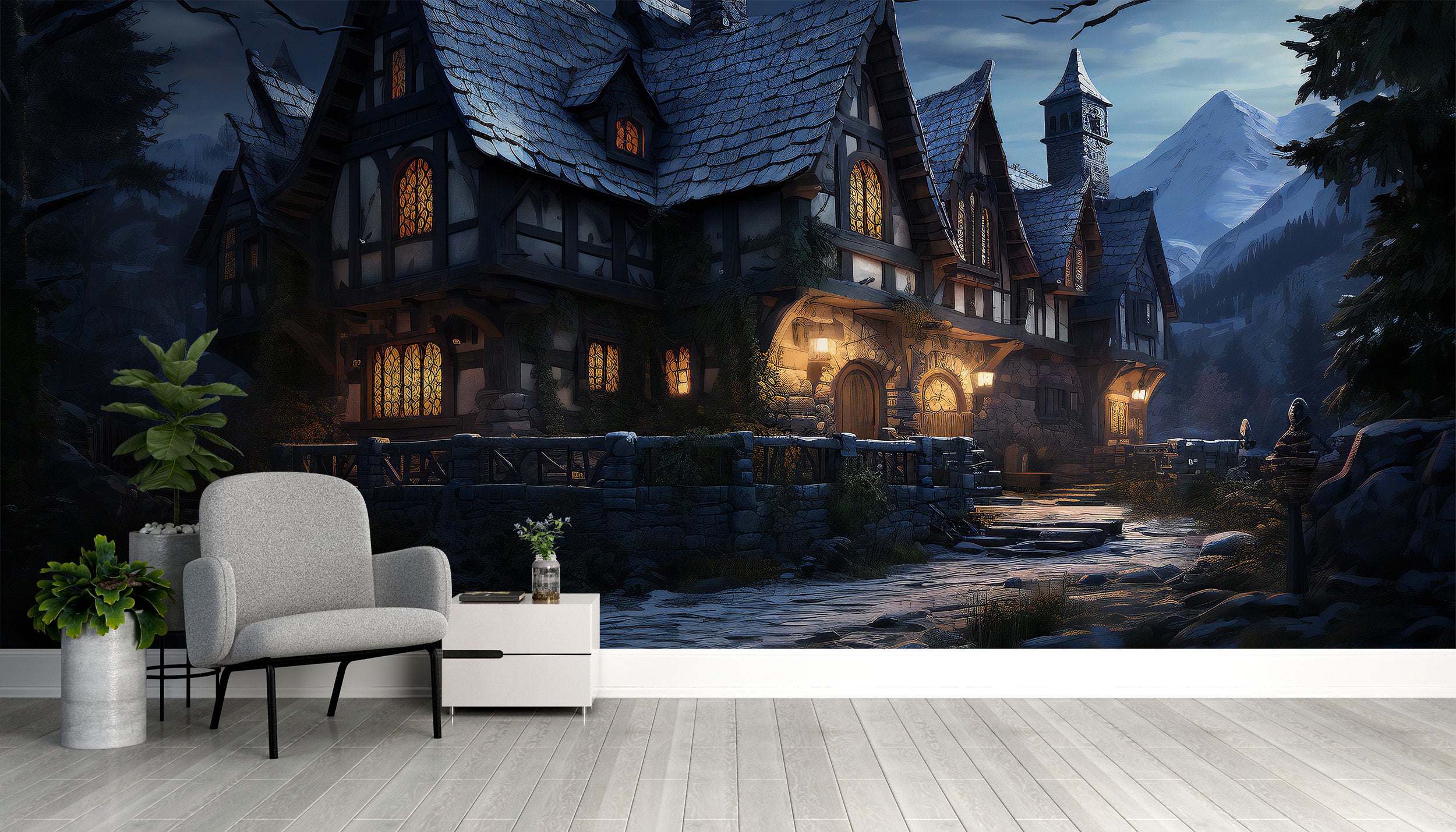 Haunted Cottage in Mountains Mural — Take your room to another level and mix fantasy with a Halloween theme wallpaper scene. With a haunted cottage nestled within mountains that are jagged and rough, all hung in moonlit repose against your walls the mural is mystery embodied. This fantasy wallpaper brings a je ne sais quoi to the room that will impress every guest you see. This mural is excellent for a seasonal spruce up, or something that looks fantastic all year round on your wall. Exclusive Collection: Discover our unique wallpaper designs now!