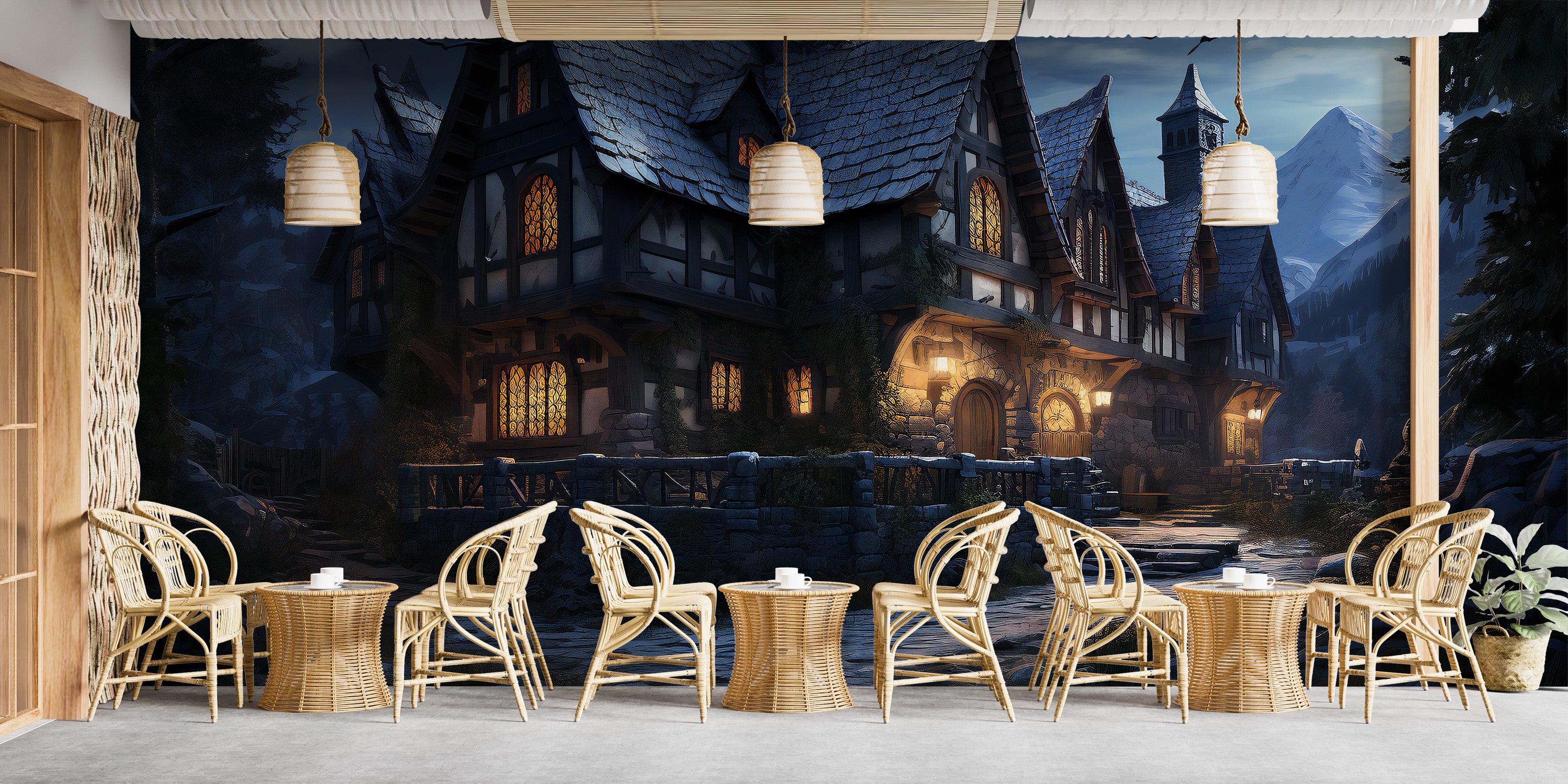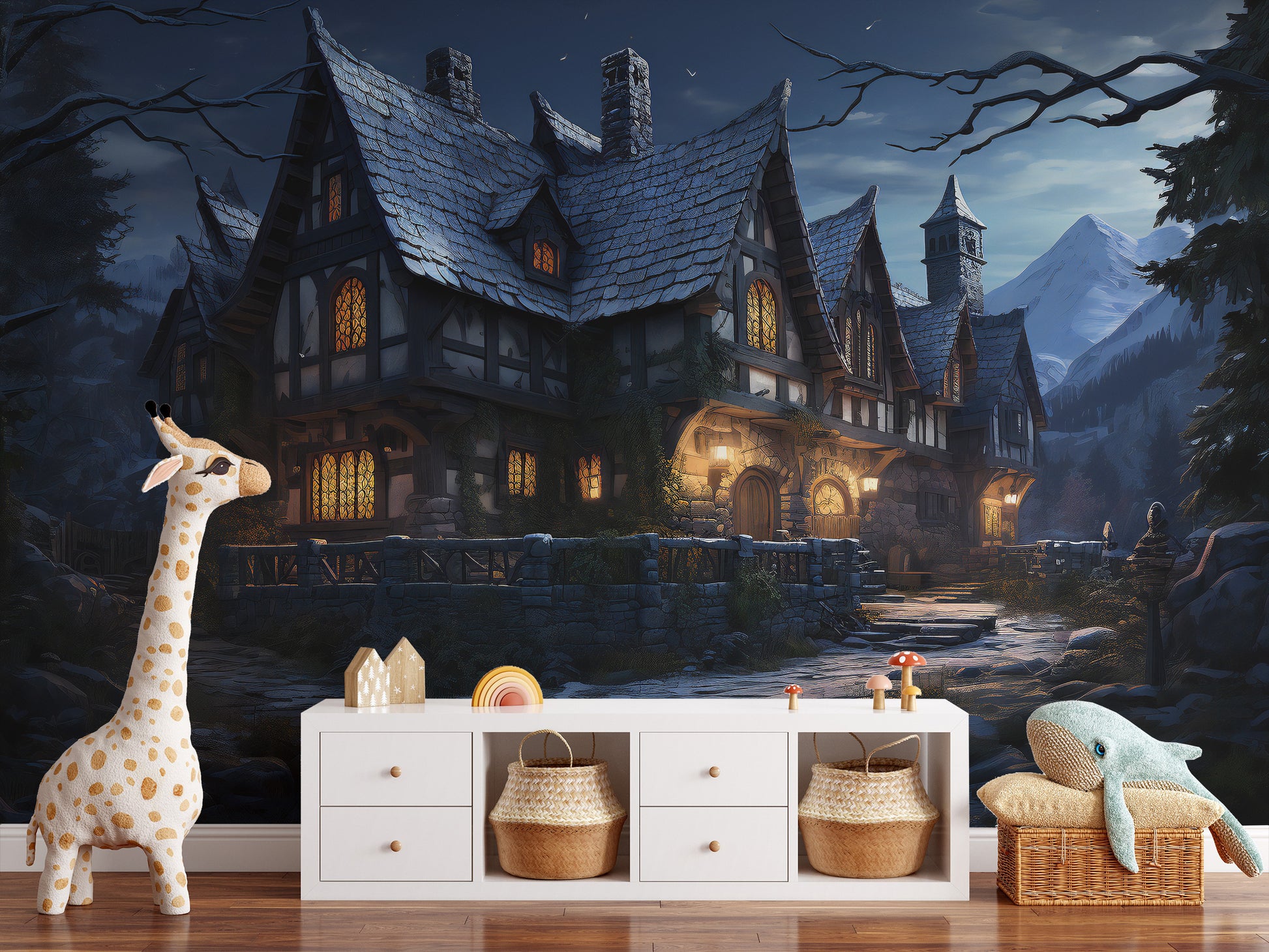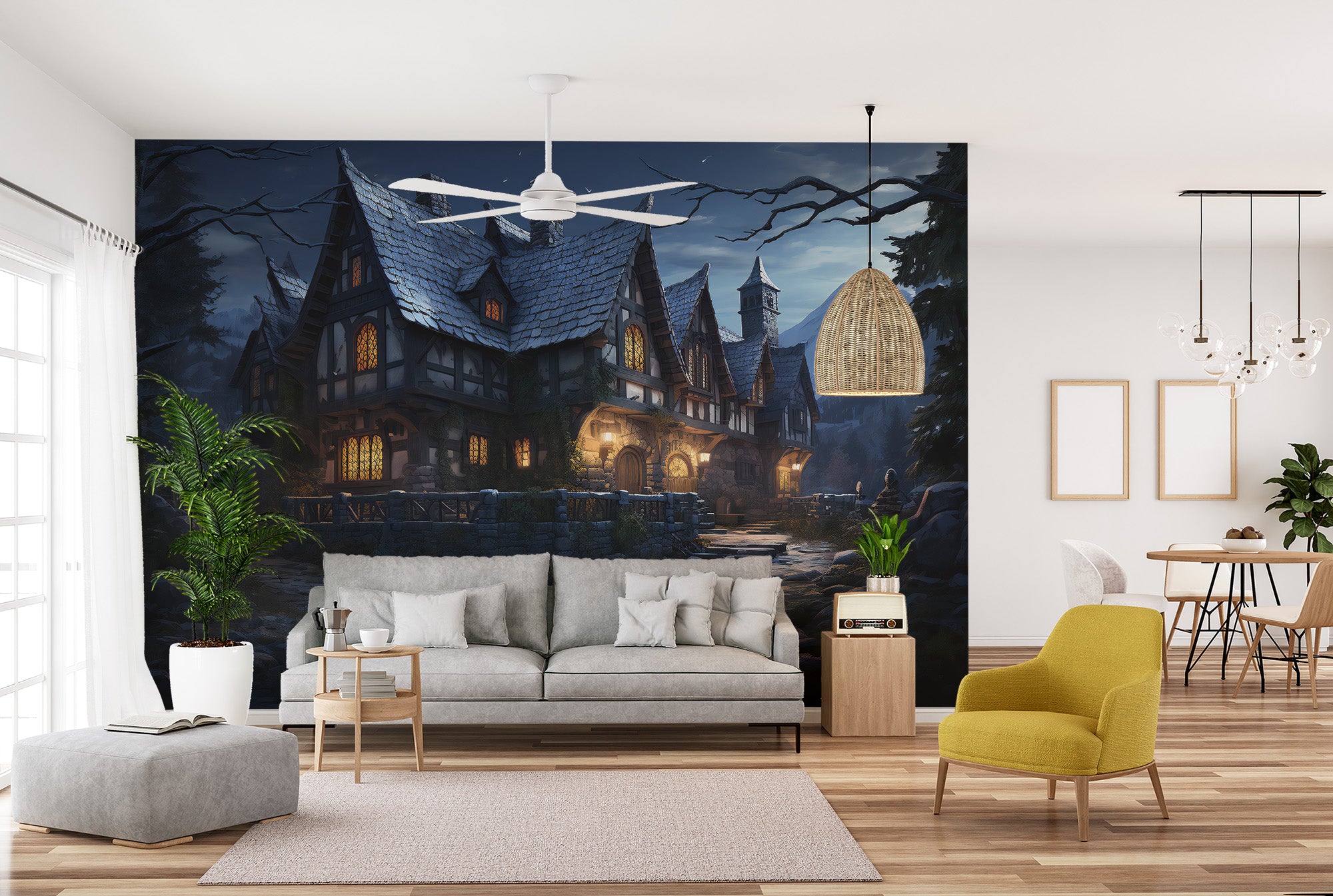 Haunted Cottage in Mountains Mural — Take your room to another level and mix fantasy with a Halloween theme wallpaper scene. With a haunted cottage nestled within mountains that are jagged and rough, all hung in moonlit repose against your walls the mural is mystery embodied. This fantasy wallpaper brings a je ne sais quoi to the room that will impress every guest you see. This mural is excellent for a seasonal spruce up, or something that looks fantastic all year round on your wall. Exclusive Collection: Discover our unique wallpaper designs now!