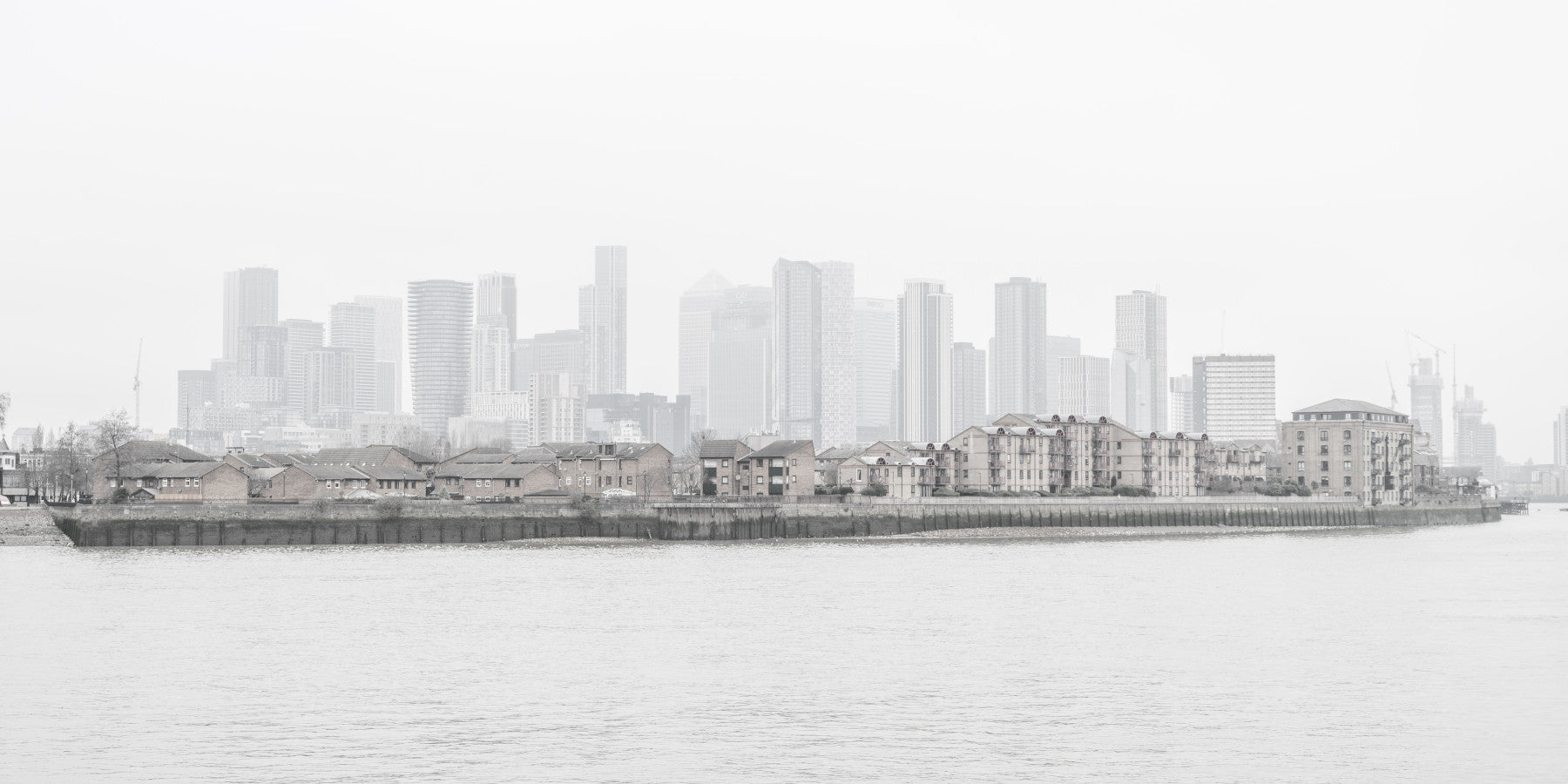 Greenwich Skyline over River Thames. Immerse yourself in the quiet beauty of a hazy urban scene. This wallpaper evokes a sense of calm with its soft, muted tones and distant cityscape. The gentle shades of grey and the water’s surface merge seamlessly. This wallpaper for walls enhances any room by adding subtle depth and creating an atmosphere of tranquility. Perfect for a study or bedroom, it provides a backdrop that complements the interior without overpowering the space.