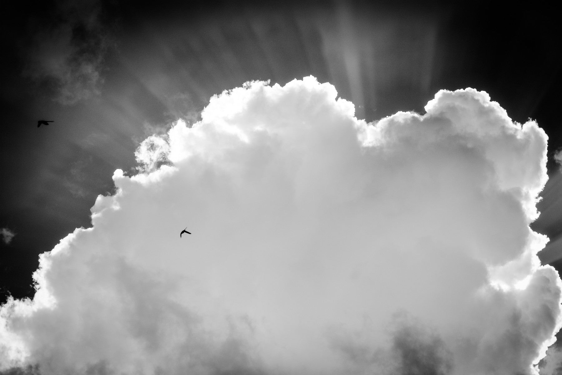 Escape into the boundless serenity of Heavenly a monochromatic wallpaper that captures the ethereal beauty of the sky. A majestic, towering cloud dominates the frame, its soft, billowing edges sharply defined against a contrasting backdrop of darker skies. Streaks of light pierce through the darkness, evoking a sense of divine presence and peace. The monochrome palette enhances the drama and emphasizes the stark contrast between light and shadow. Two silhouetted birds soar freely across the scene, reinforcing the feeling of liberation and infinite space. Bring a touch of the celestial into your digital world with this inspiring and captivating piece of art, perfect for those seeking solace and inspiration.