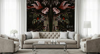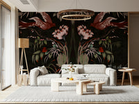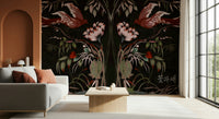 Evoke the serene beauty of Korea's Joseon dynasty with 'Heaven's Birds.' This wallpaper offers a modern interpretation of traditional Korean art, featuring elegant birds in flight amidst stylized flora. The rich, dark backdrop enhances the delicate details of the blossoms and the birds' meticulously rendered plumage. Inspired by 'Hwajodo' paintings, the symbolic harmony between nature and grace is captured. The mirrored design lends a sense of balance and tranquillity, creating a focal point that draws the eye and adds sophistication to any space. Introduce a touch of historical artistry into your contemporary lifestyle with this design, perfectly embodying the timeless appeal of Korean aesthetics. Experience the calming presence of these celestial creatures, transforming your walls into a canvas of cultural richness and artistic expression. Perfect for those seeking a blend of tradition and modern elegance, 'Heaven's Birds' is more than just a wallpaper; it's a statement of refined taste.