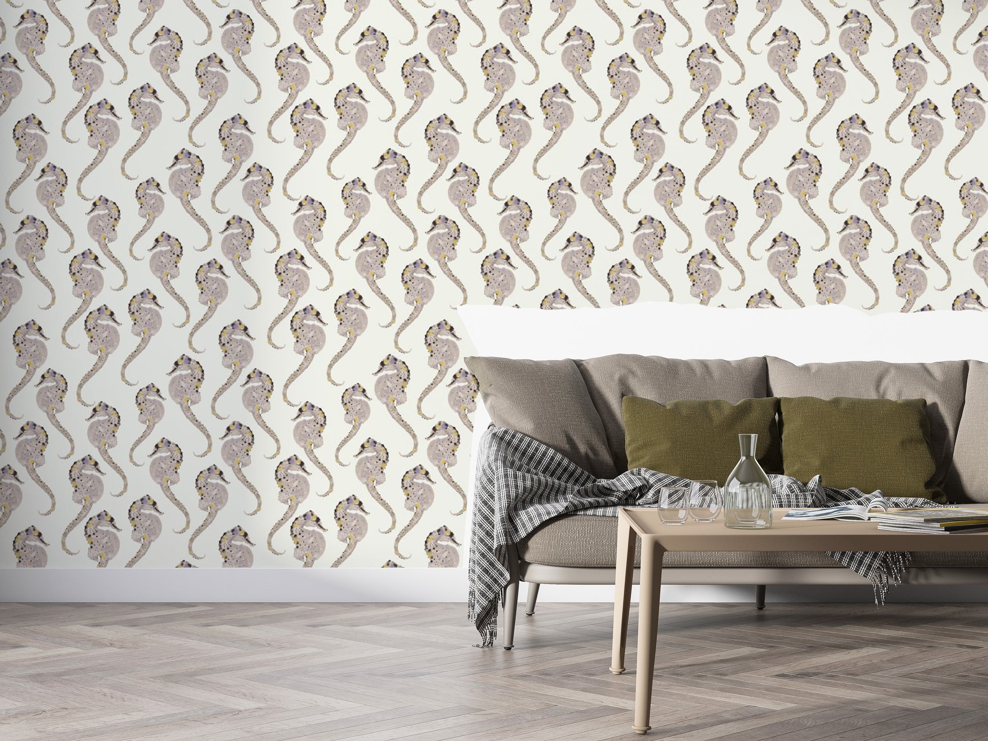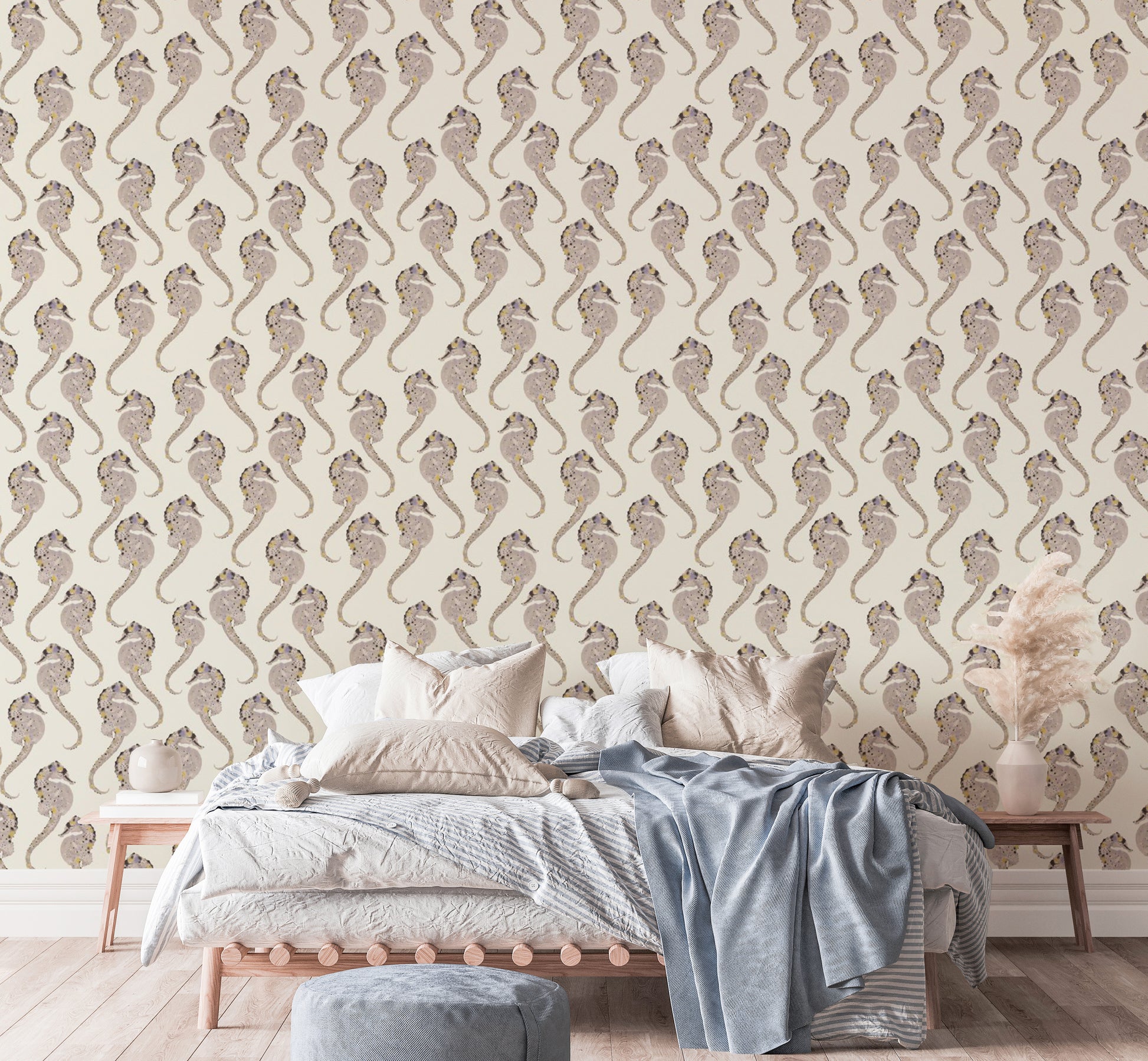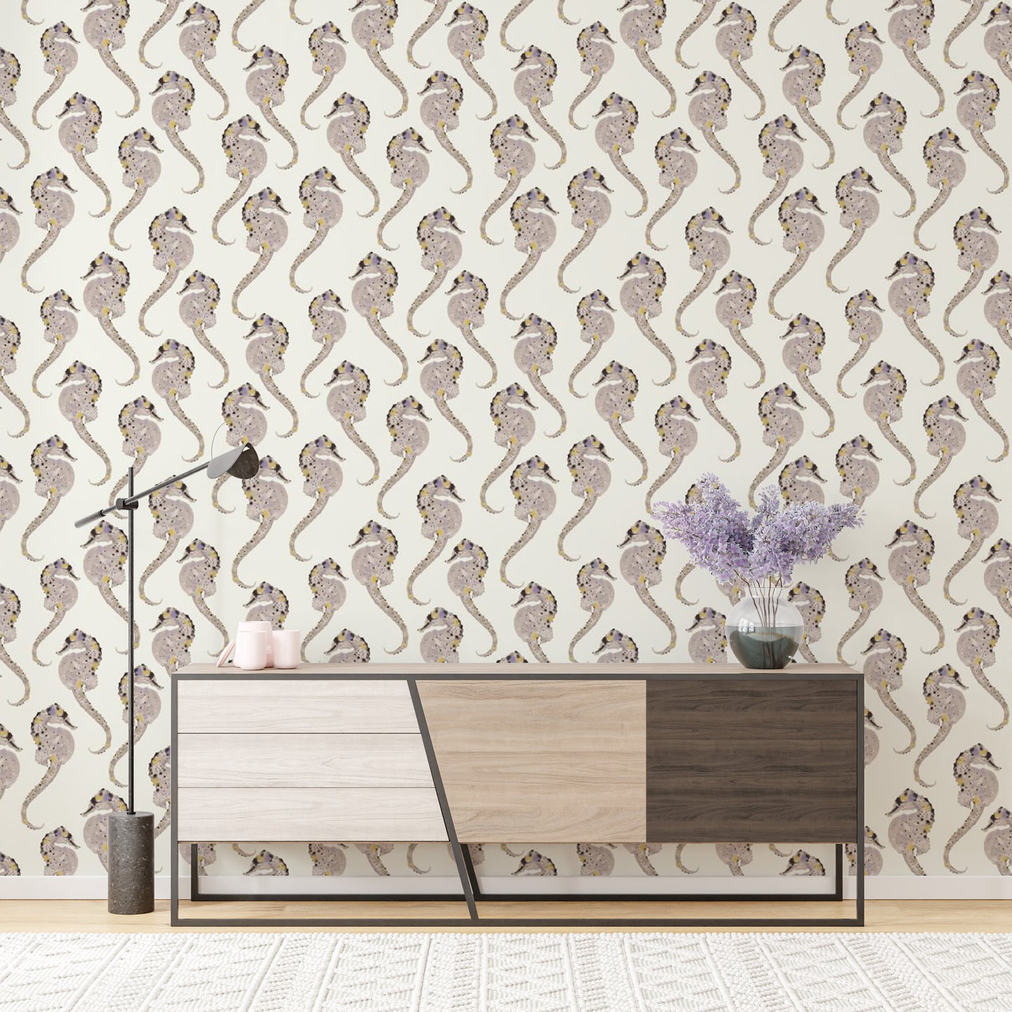 Add a touch of coastal charm to your home with the Hippocampus wallpaper, a perfect blend of style and serenity. Featuring delicate seahorse patterns, this ocean-themed design exudes a sense of tranquility and whimsy. Ideal for those who love marine life wall decor or want to infuse their space with a nautical wallpaper vibe, its subtle colors blend effortlessly with various styles. Whether you're styling a beachside retreat or simply dreaming of the sea, this Hippocampus wall art brings a refreshing, underwater feel to any room.
