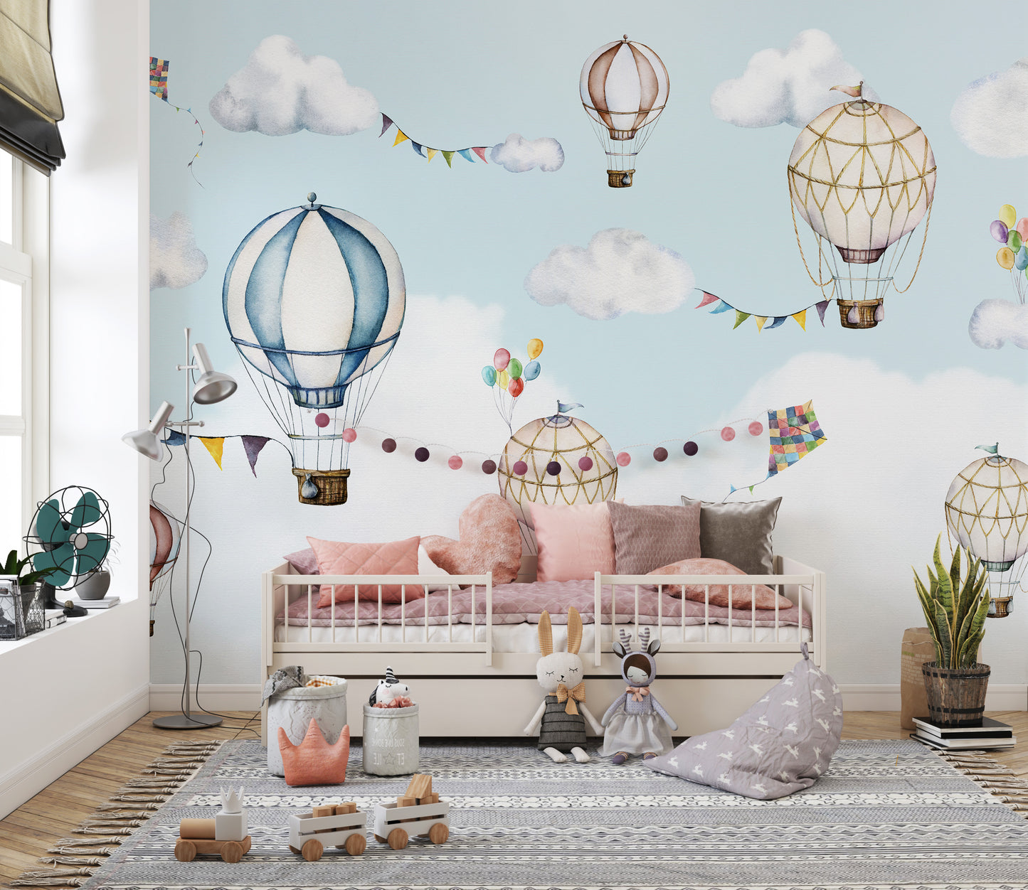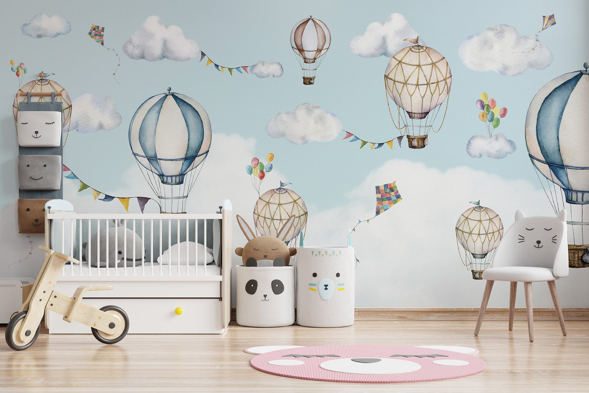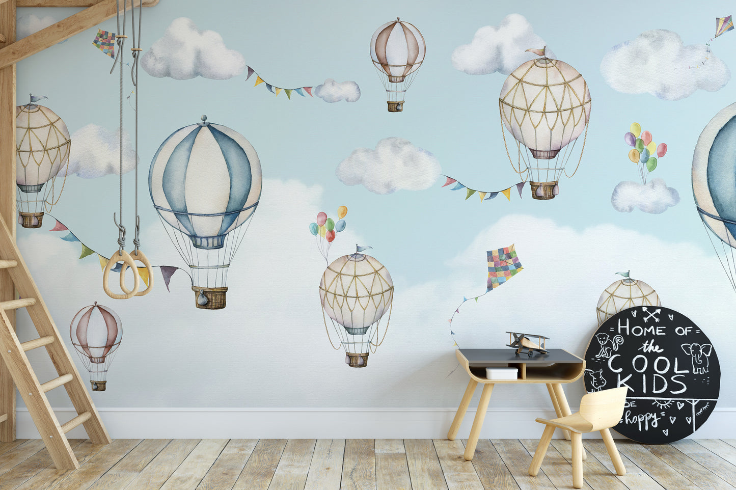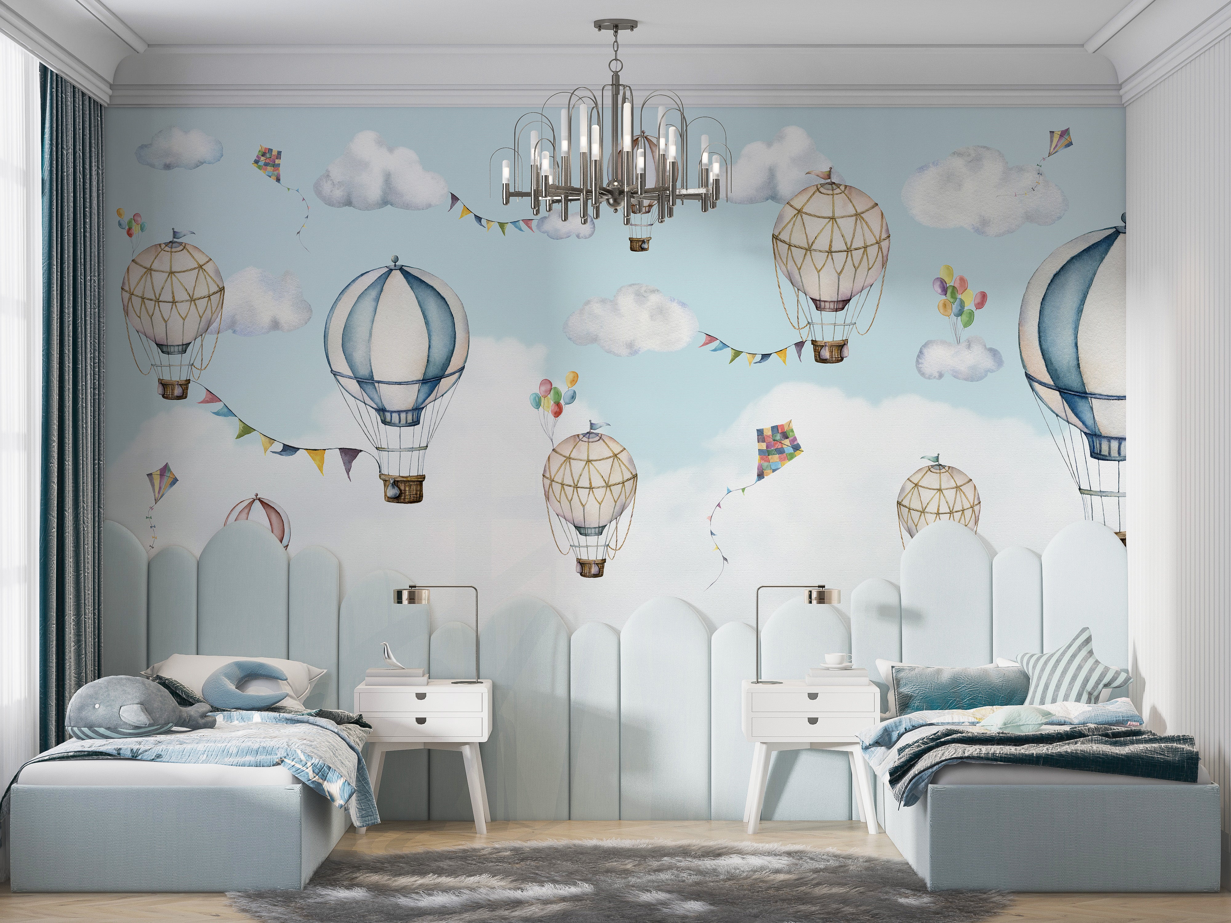 Airy mural featuring hot air balloons and colorful kites