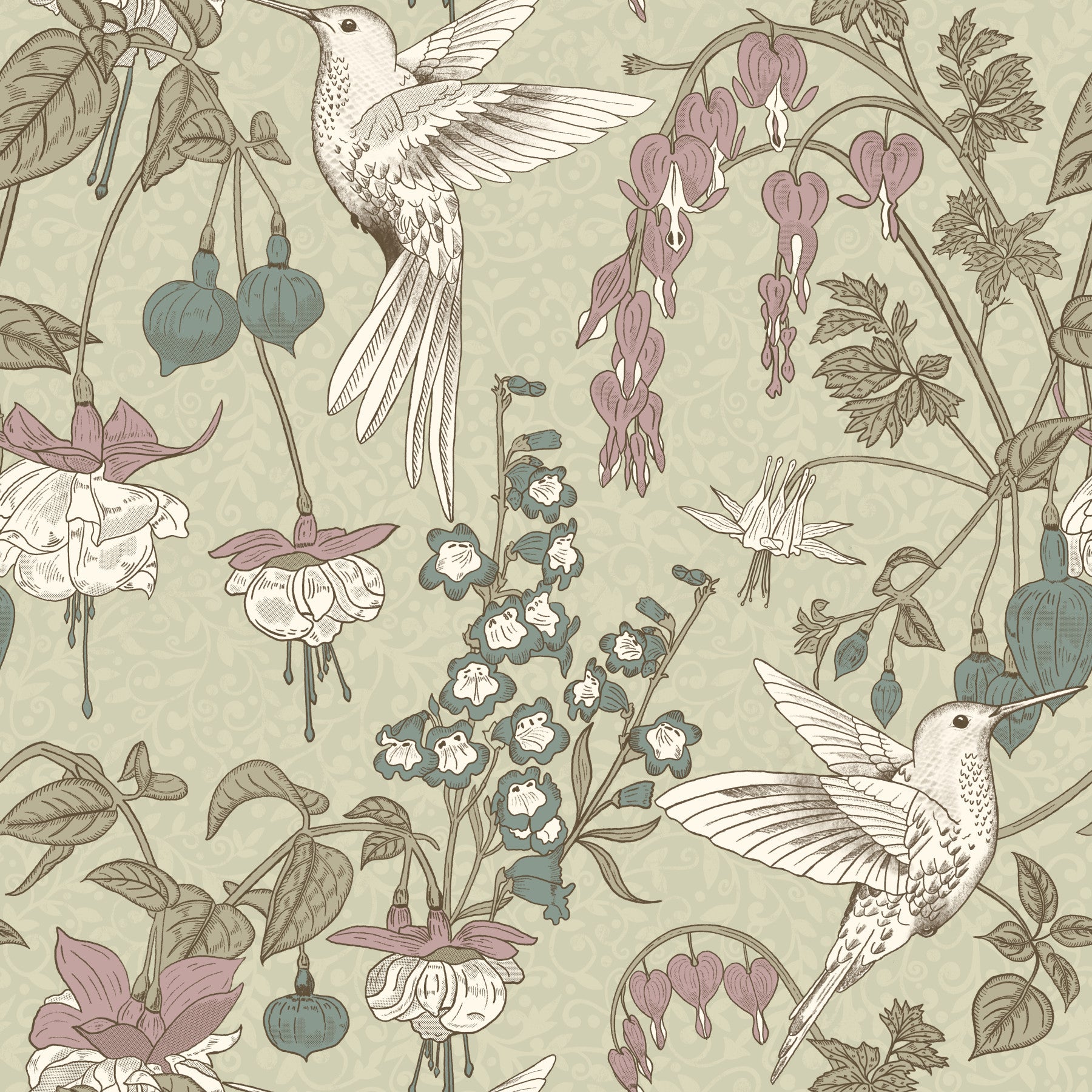 Bring nature inside with this detailed floral wallpaper. Observe hummingbirds dance among blossoms and heart-shaped blooms in a repeating pattern. The soft sage green background and muted colours create a tranquil mood. Perfect wallpaper for walls in bedrooms, living rooms, or dining rooms. This stylish print complements traditional and cottage-style interiors, adding a touch of botanical charm.