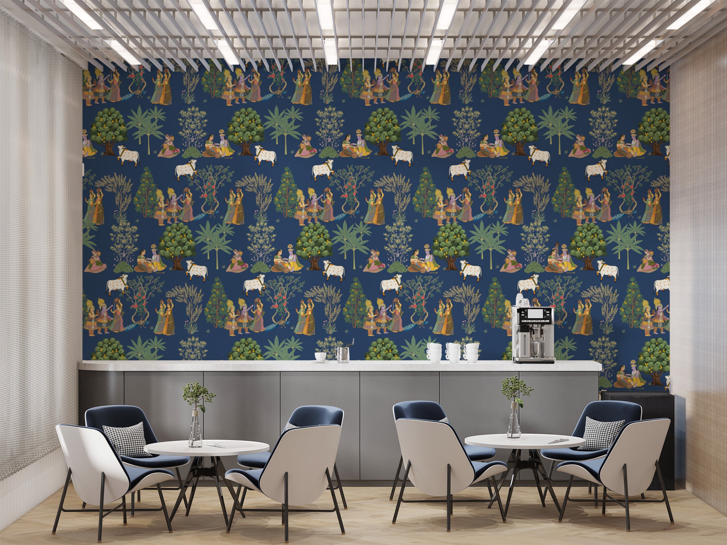 Experience the elegance of the Indian folk art wall mural inspired by Mughal art wallpaper and cultural heritage wallpaper designs. The rich patterns, traditional figures, and nature-inspired elements create a timeless aesthetic. Featuring intricate details and vibrant colors, this vintage Indian pattern wallpaper blends history with modern interiors. Crafted precisely, it showcases traditional motifs, lush greenery, and graceful figures. Ethnic decorative mural designs bring an authentic touch to interiors. The deep blue background enhances the fine details, making every element stand out. Perfect for adding a regal touch, this royal Mughal design wallpaper reflects India's artistic legacy.