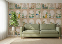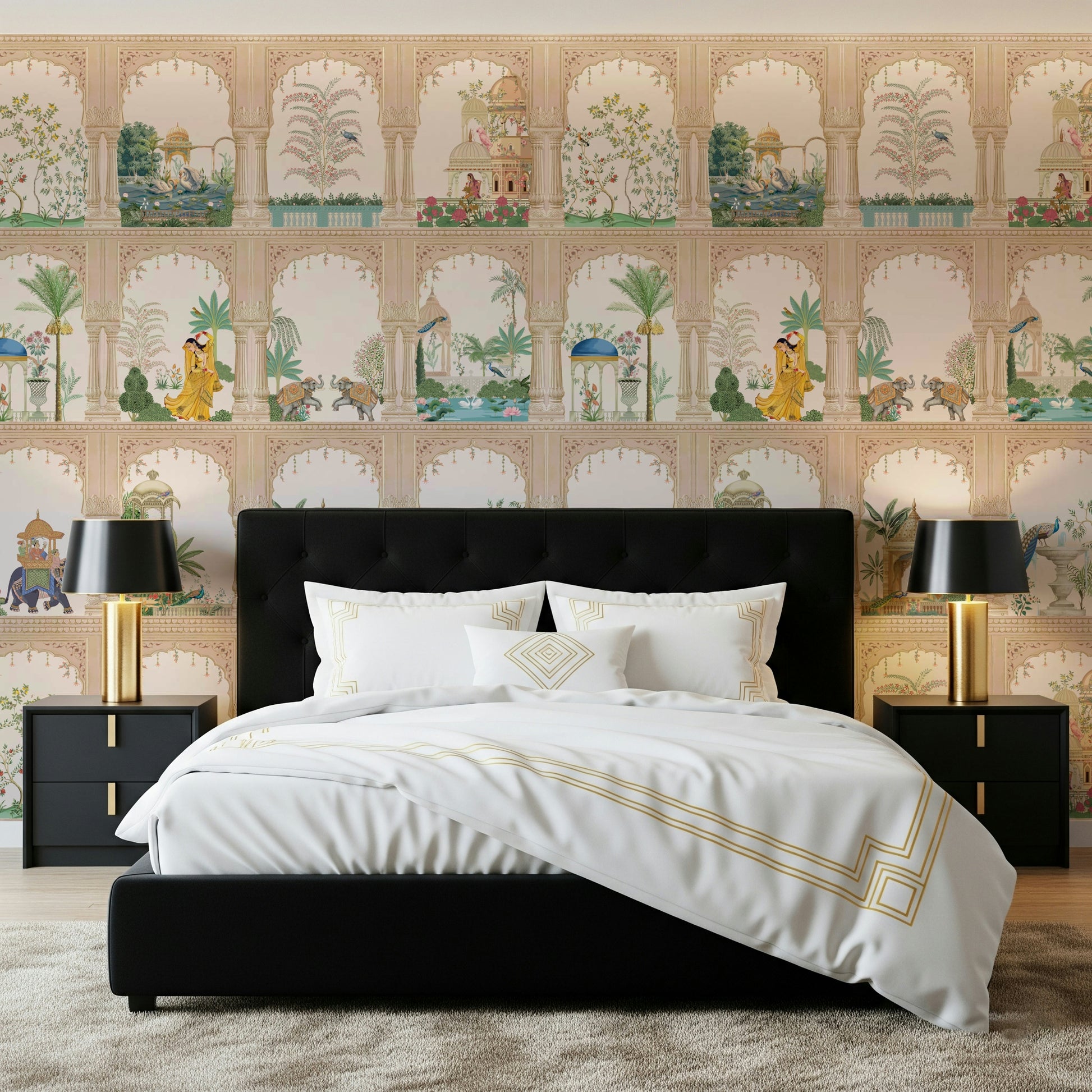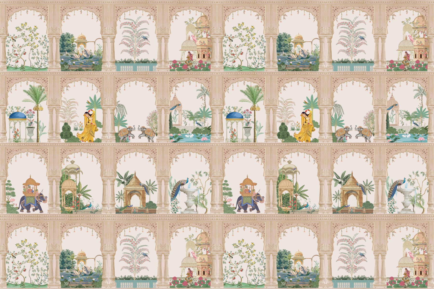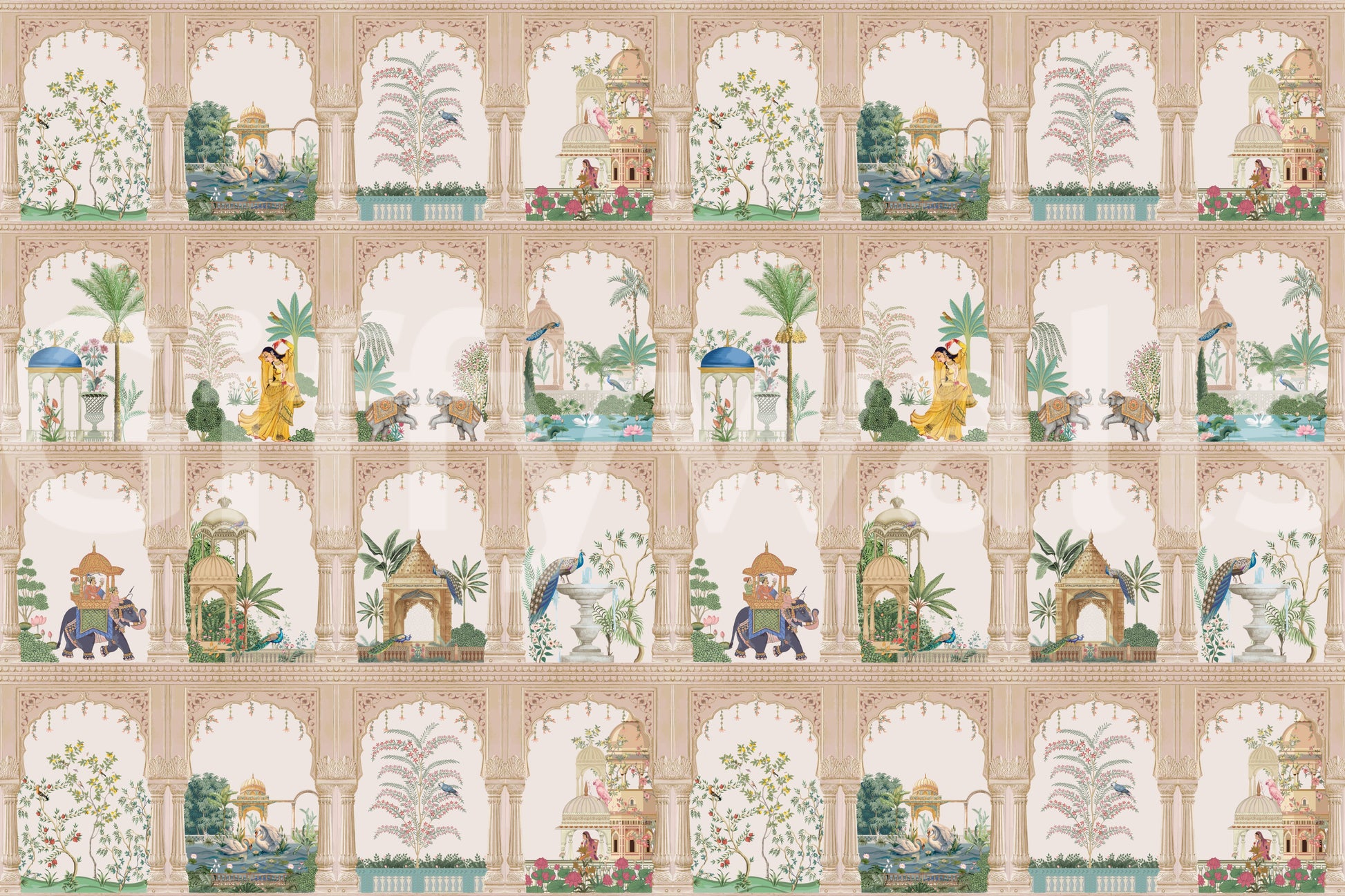 Elevate your interior with this stunning wallpaper for walls, showcasing a romanticised Indian palace view. Repeated arches reveal glimpses of lush gardens, elephants, and figures. The design uses a muted colour palette with hints of yellow, green, and soft pink, making it suitable for various rooms. This wallpaper brings a serene and historic feel. Use it in a bedroom, living room, or dining room to evoke a sense of global elegance. The architectural details provide a sophisticated backdrop, enhancing any interior space.