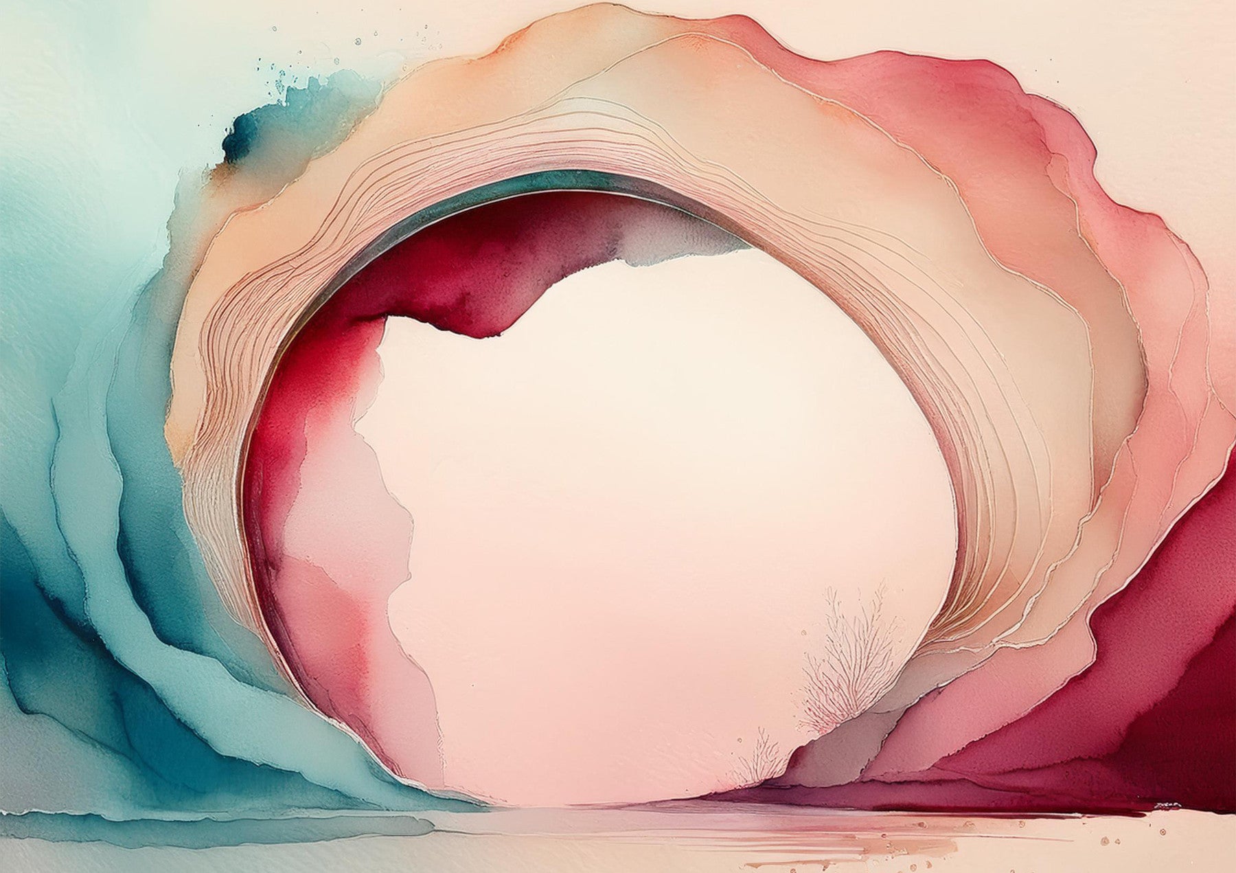 Inspired by coastal sunsets and tranquil ocean waves, this wallpaper features an abstract interpretation of a serene landscape. The artist's skillful use of watercolor paints creates a beautiful blend of soft blush pinks, deep reds, and cool teals, mimicking the colors of a sunset reflected on water. Delicate lines add texture and depth, while the open central space invites the eye to wander. This piece brings a calming, meditative atmosphere to any room, creating a tranquil escape.