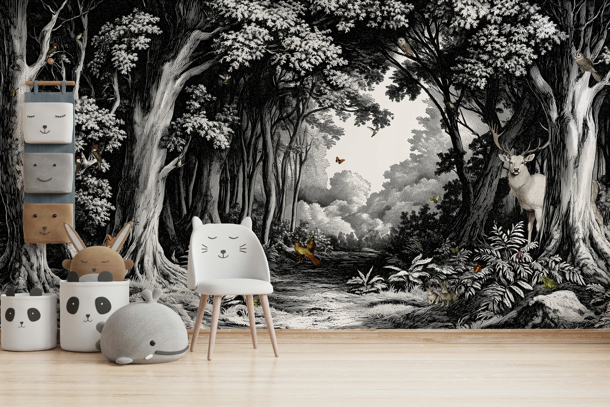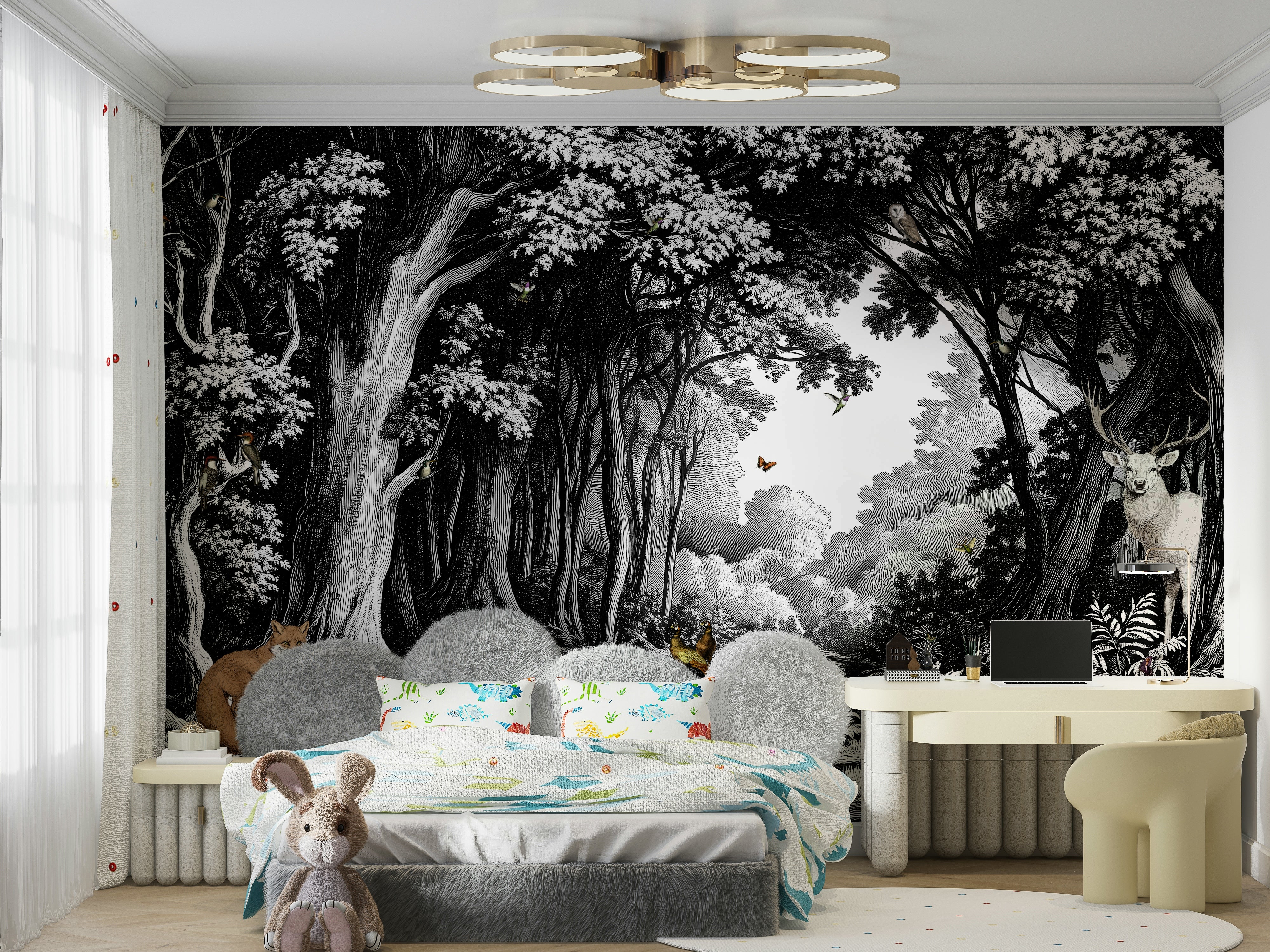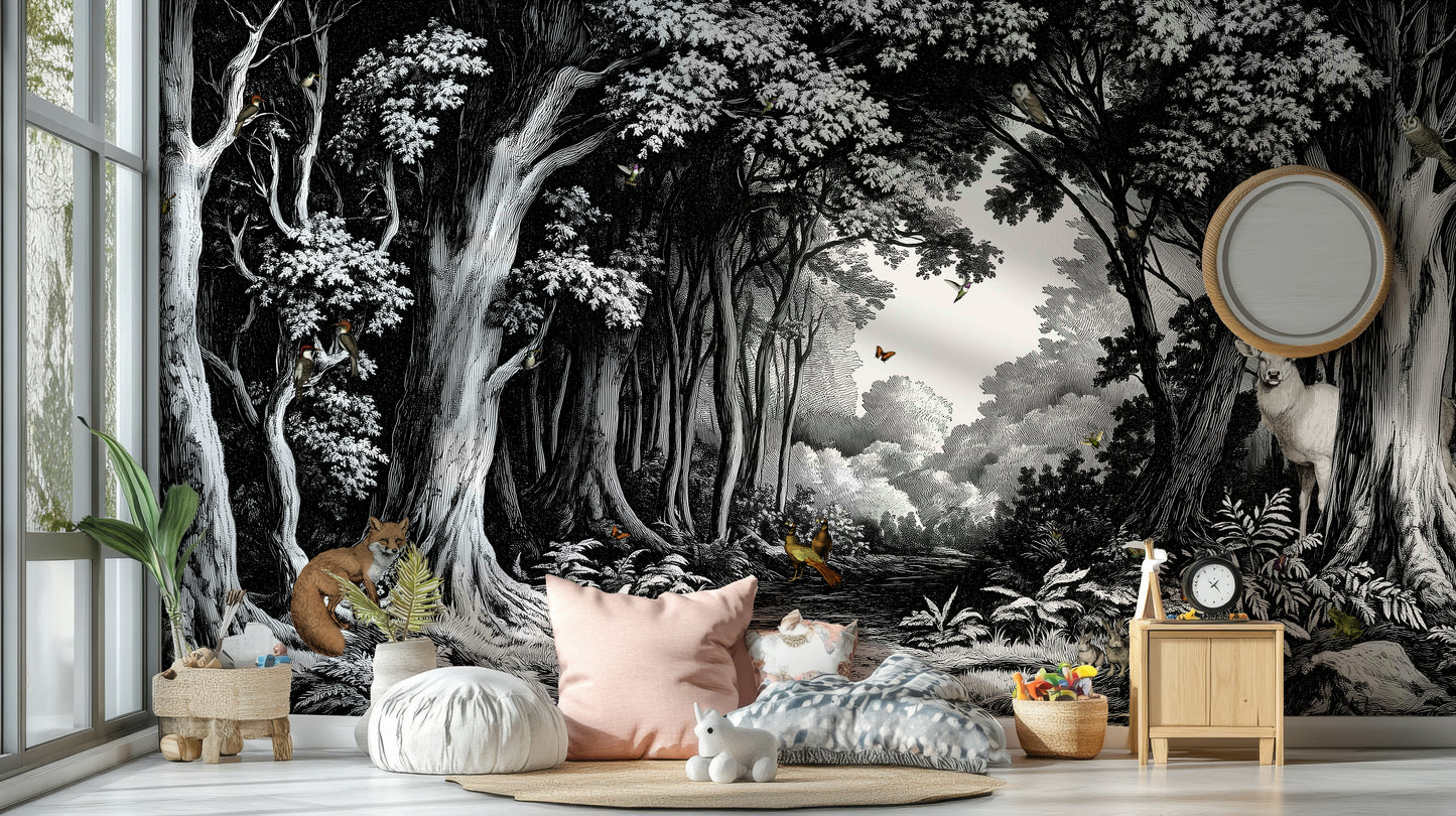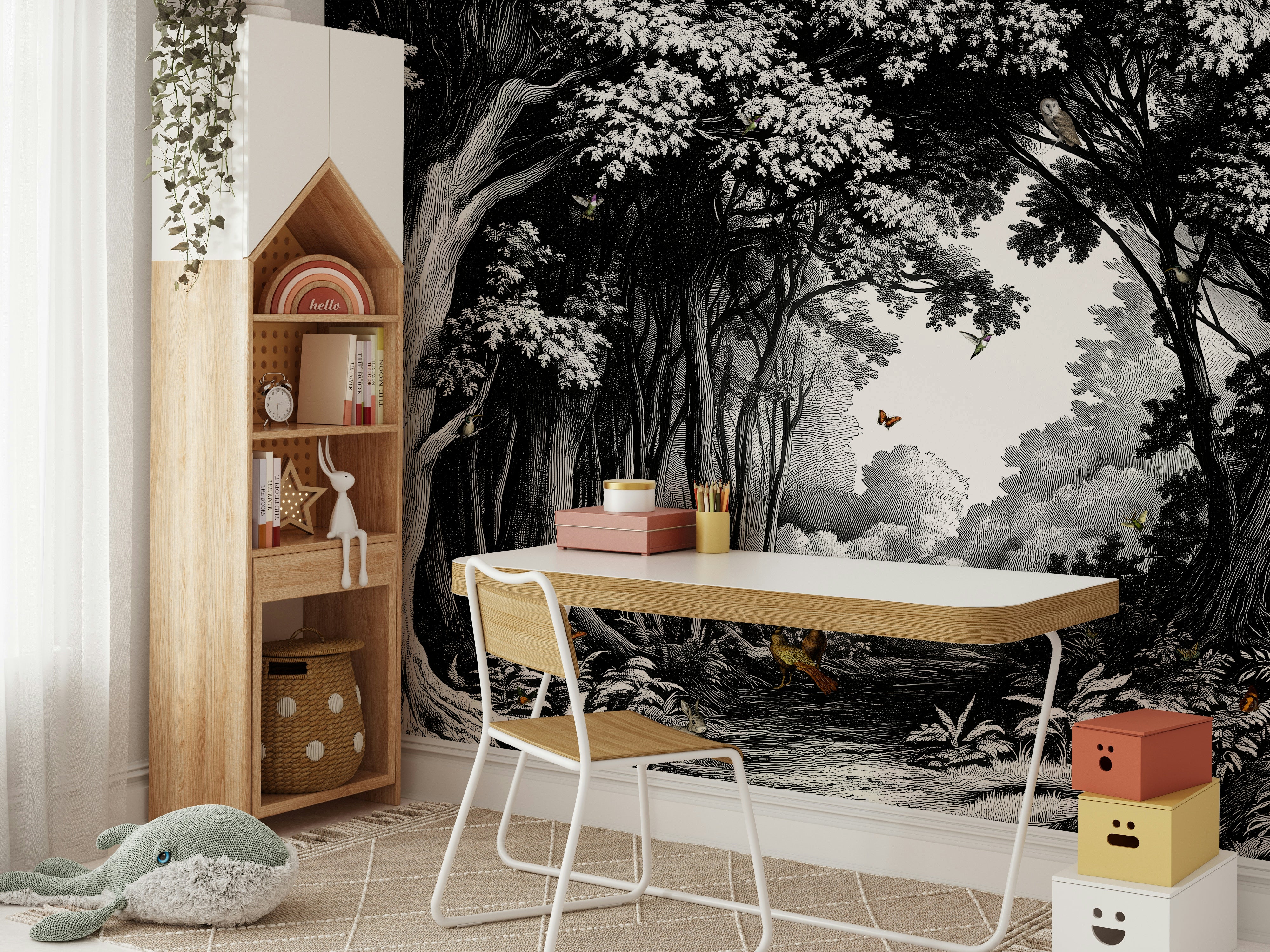 Enter a magical world filled with forest animals, birds and butterflies all illustrated in the style of a 19th century picture book. Like having the doorway to a fairy tale world on your wall, this elaborate mural offers endless hours of fantasy and wonder as you discover all the delightful hand coloured creatures hidden in the black and white forest depths. From a majestic white stag to a charming fox, adorable hedgehog, cheeky toads, subtle birds and fluttery butterflies, this sophisticated wall mural will tickle the imagination of children and adults alike. Great for creating an immersive world, fill your wall with Into the Forest and create cozy living spaces with a hint of timeless storytelling.