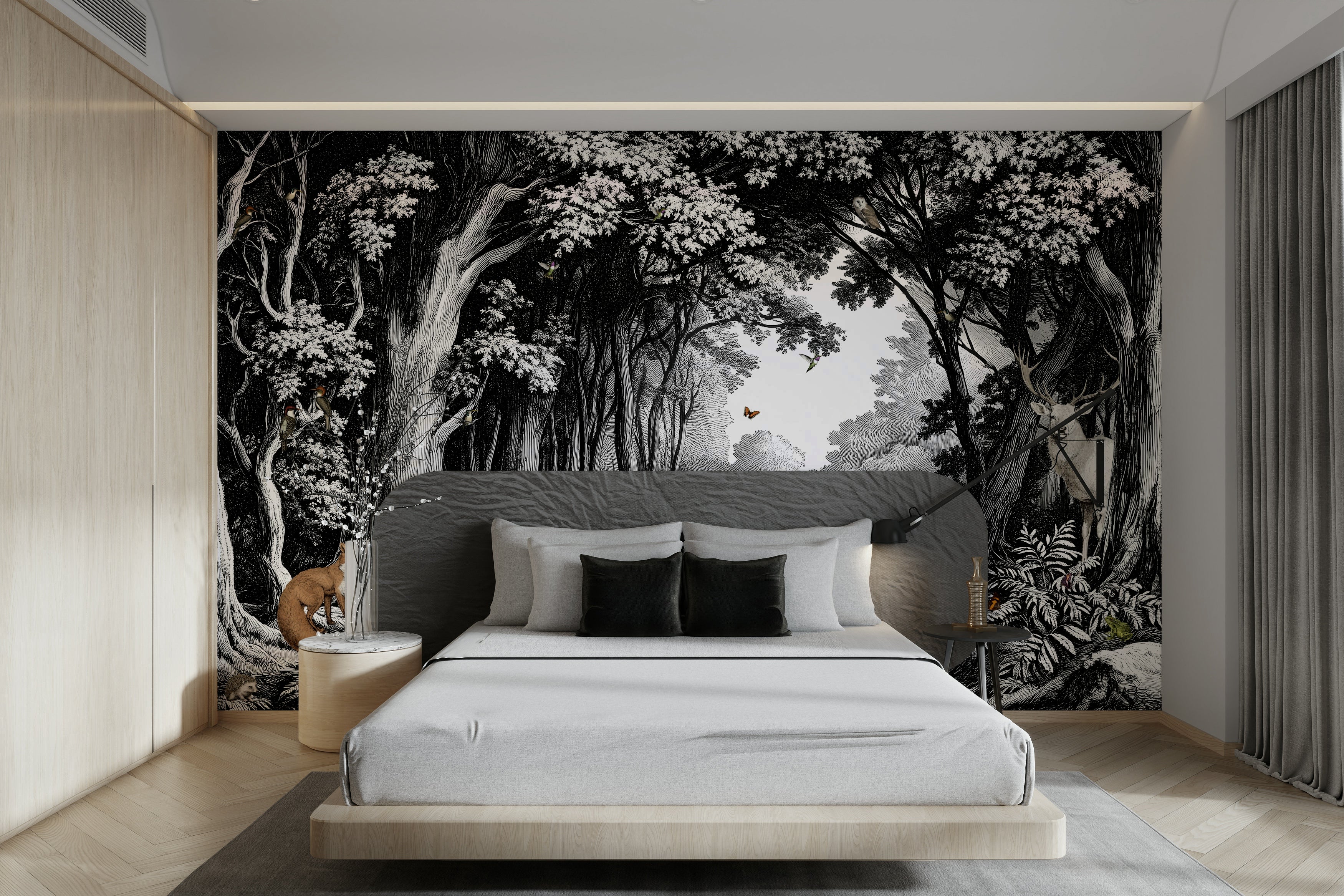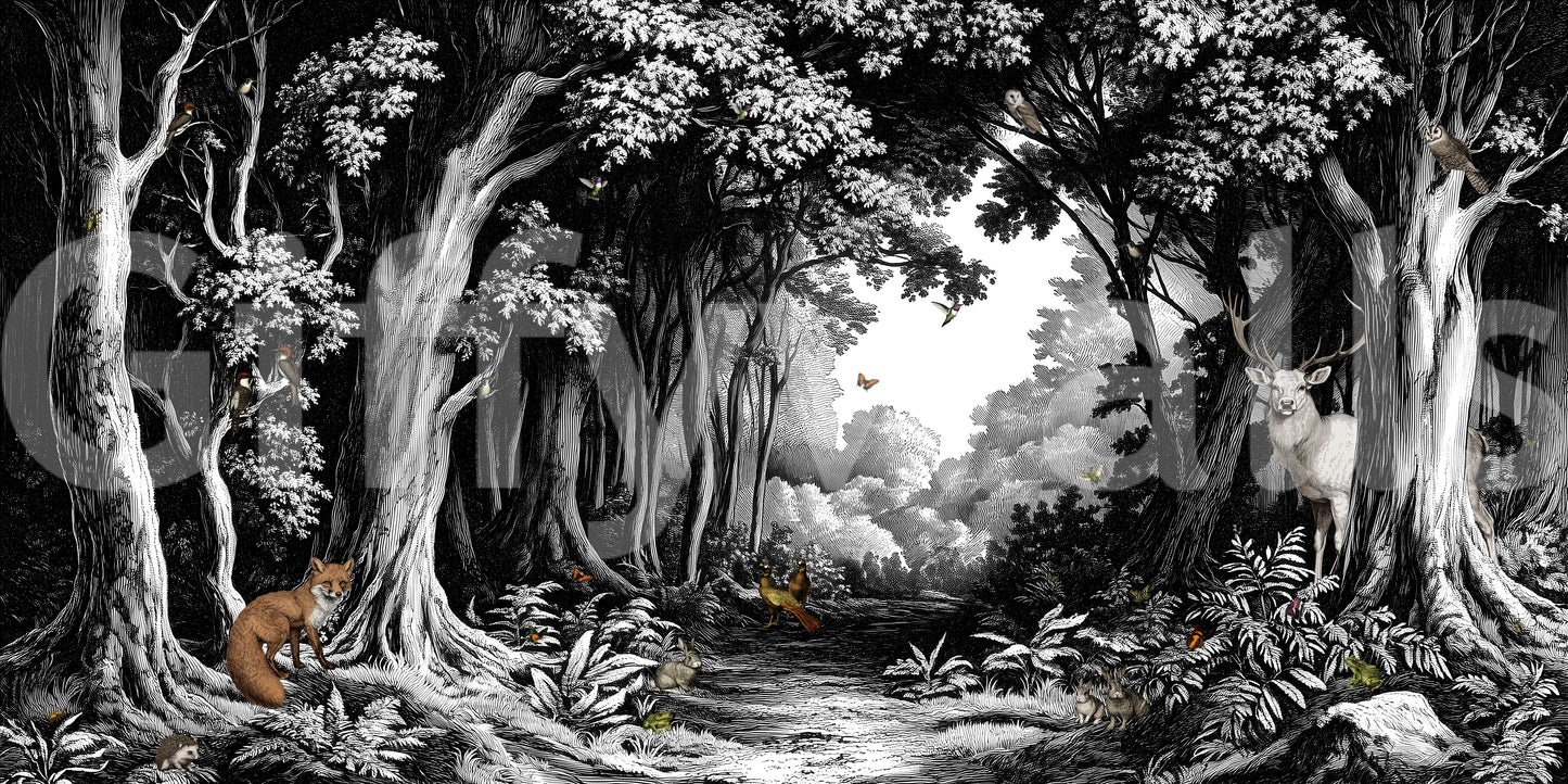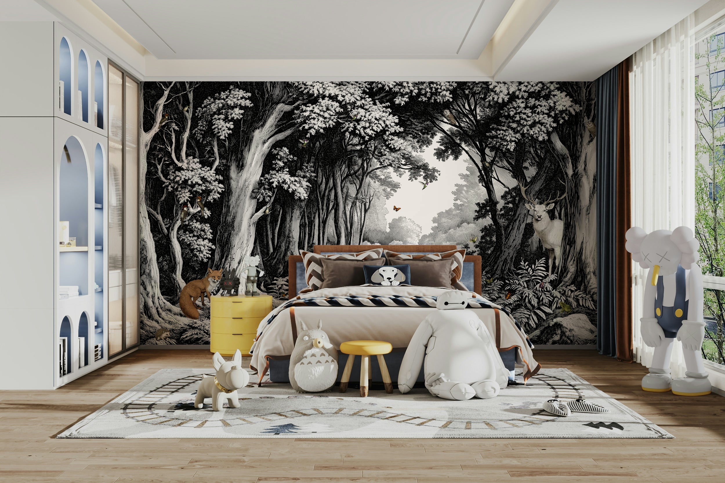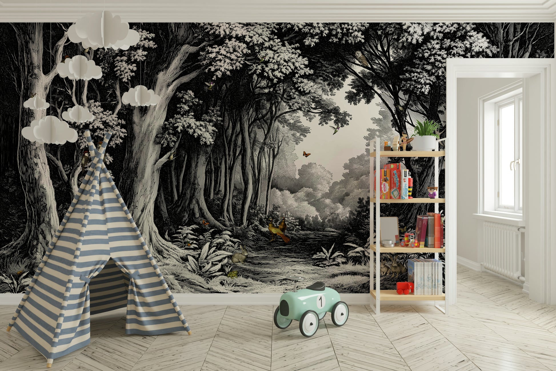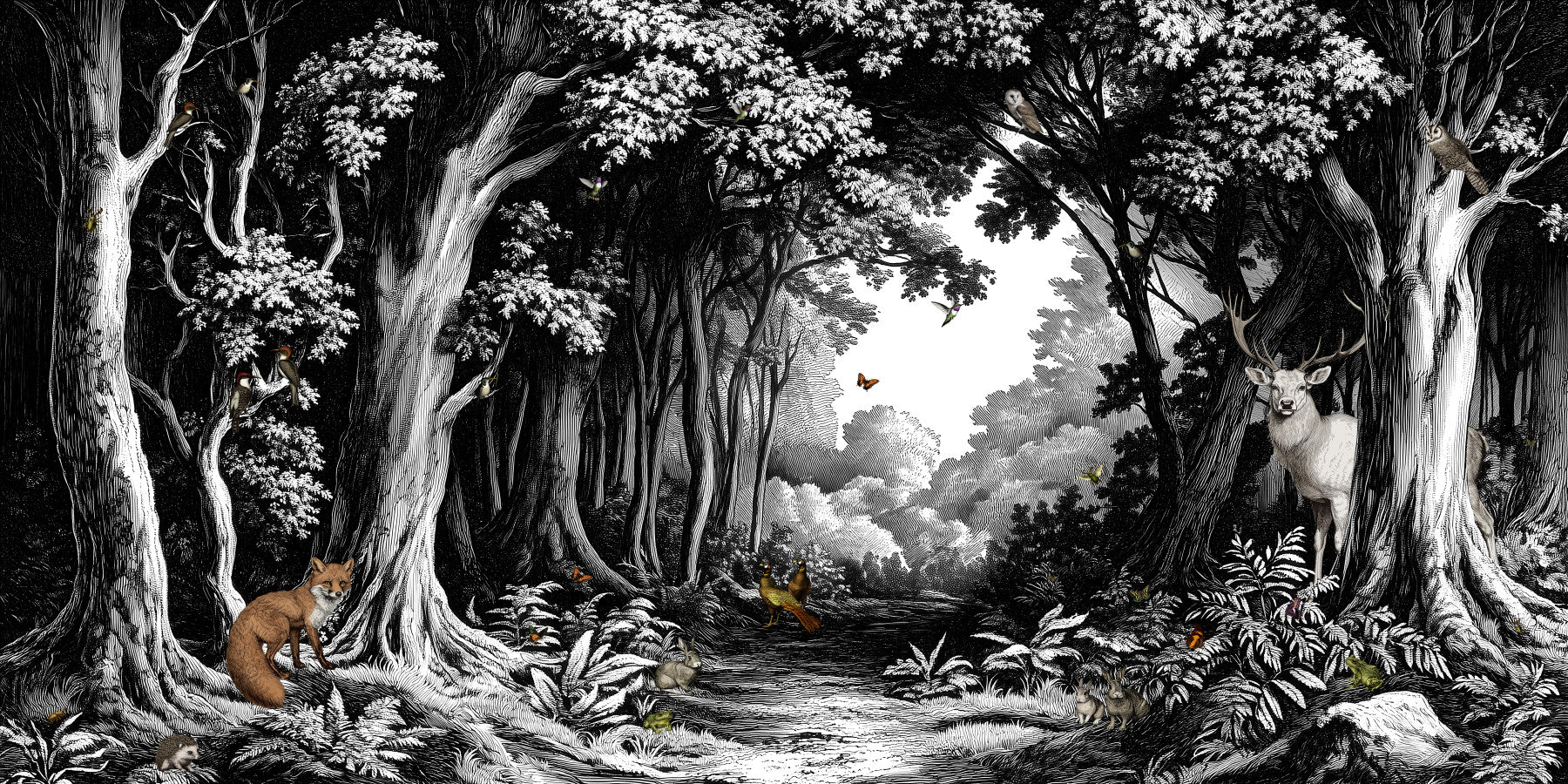 Enter a magical world filled with forest animals, birds and butterflies all illustrated in the style of a 19th century picture book. Like having the doorway to a fairy tale world on your wall, this elaborate mural offers endless hours of fantasy and wonder as you discover all the delightful hand coloured creatures hidden in the black and white forest depths. From a majestic white stag to a charming fox, adorable hedgehog, cheeky toads, subtle birds and fluttery butterflies, this sophisticated wall mural will tickle the imagination of children and adults alike. Great for creating an immersive world, fill your wall with Into the Forest and create cozy living spaces with a hint of timeless storytelling.