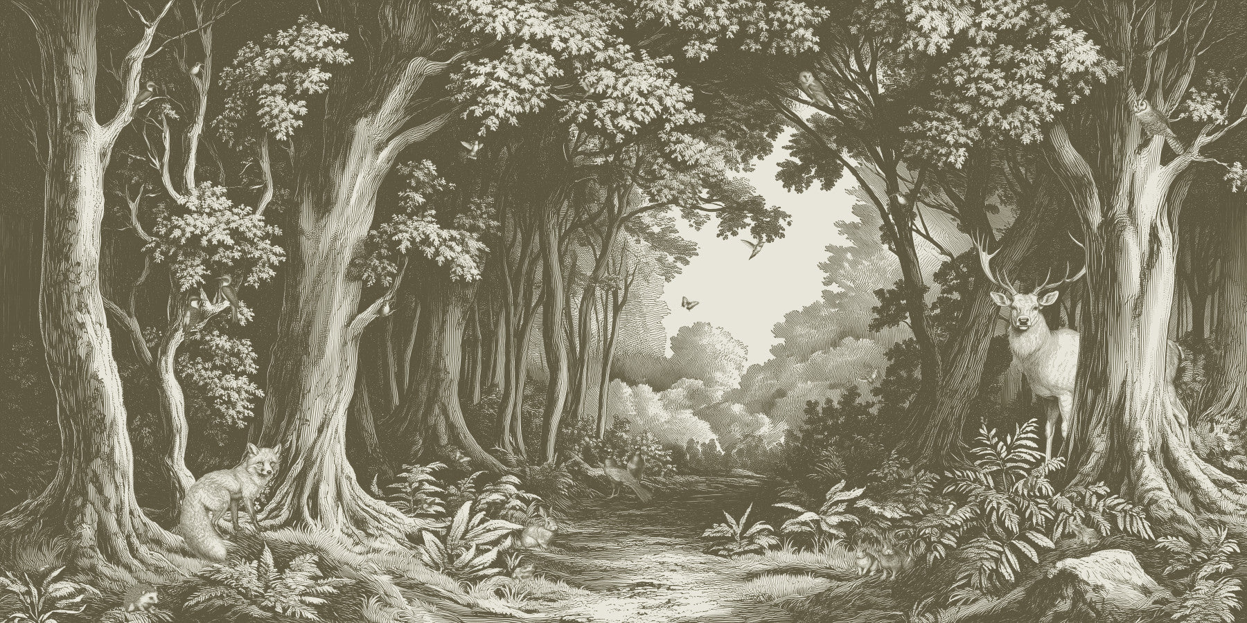 Enter a magical world filled with forest animals, birds and butterflies all illustrated in the style of a 19th century picture book. Like having the doorway to a fairy tale world on your wall, this elaborate, olive green and ivory mural offers endless hours of fantasy and wonder as you discover all the delightful creatures hidden in the forest depths. From a majestic white stag to a charming fox, adorable hedgehog, cheeky toads, subtle birds and fluttery butterflies, this sophisticated tapestry-like wall mural will tickle the imagination of children and adults alike. Great for creating an immersive world, fill your wall with Into the Forest and create cozy living spaces with a hint of timeless storytelling.