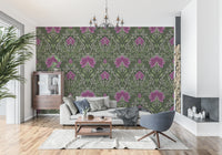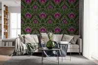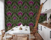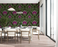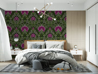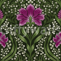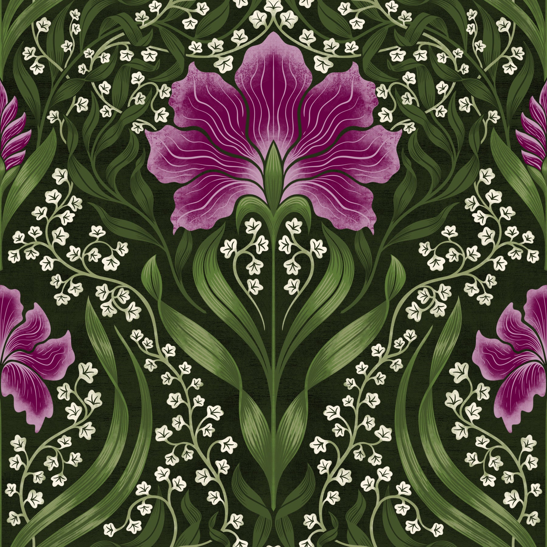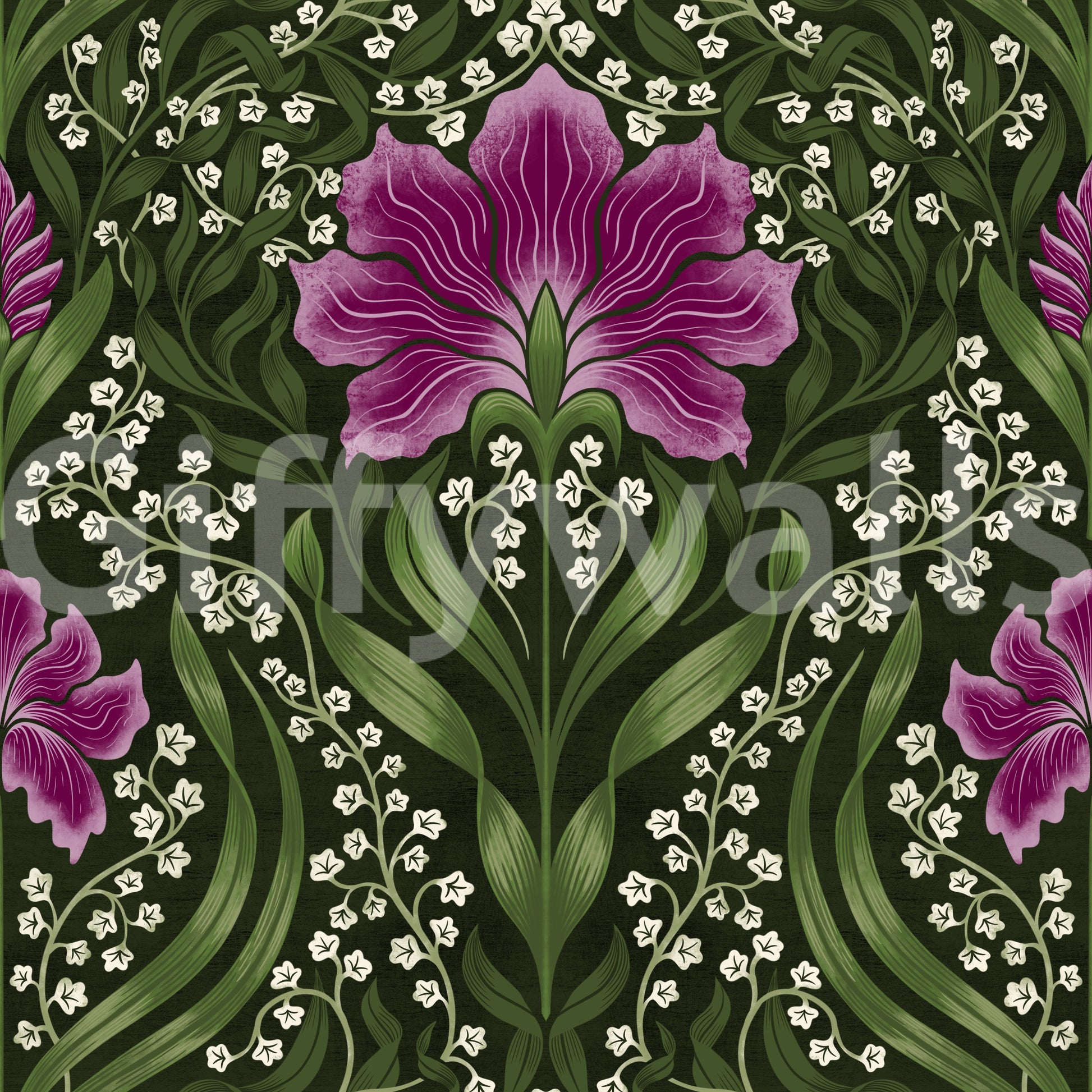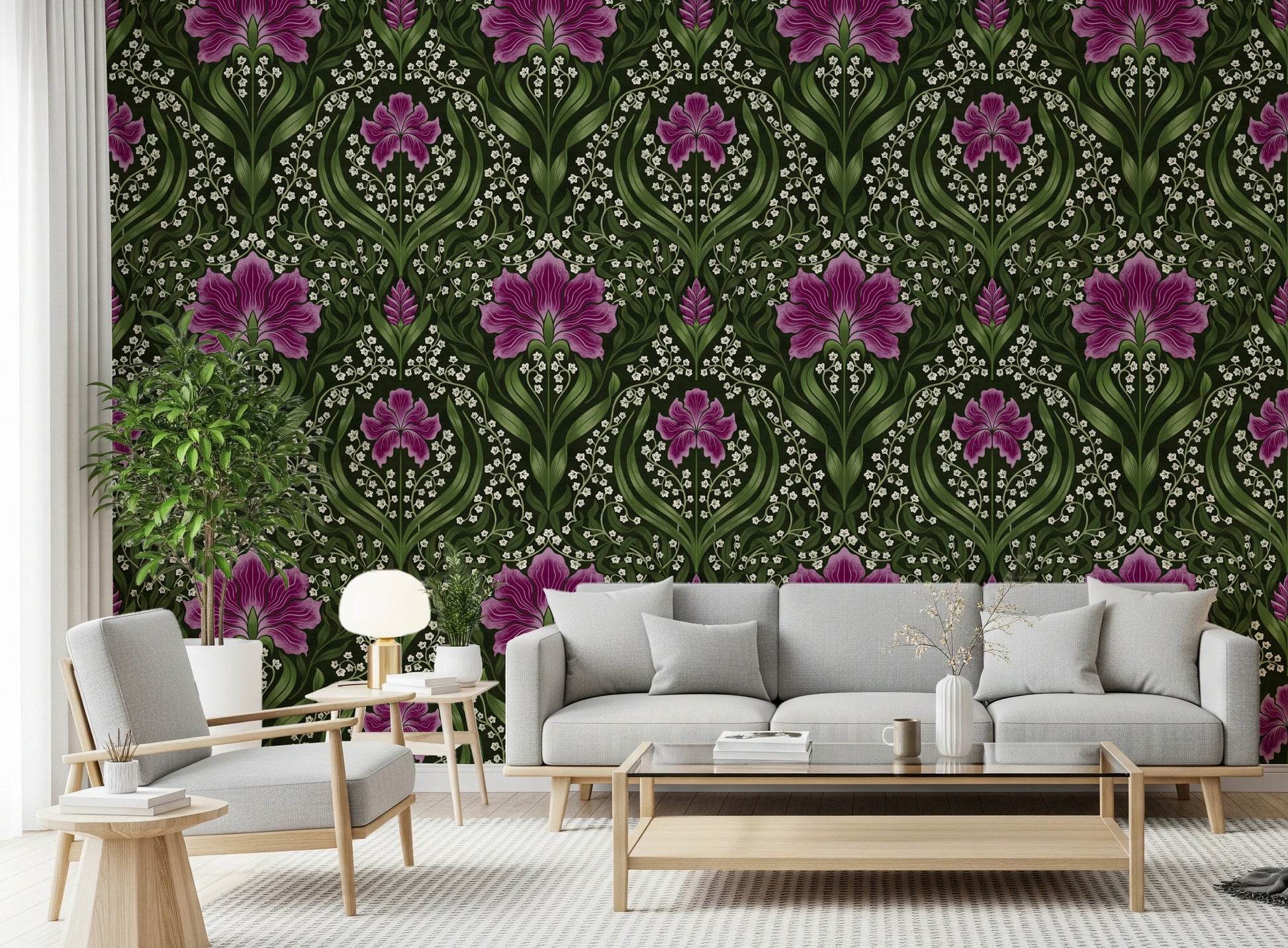 Embrace the opulence of the "Intricate Floral Damask - Purple" wall décor, where timeless elegance meets a modern sensibility. This design showcases a captivating symmetrical arrangement of lush, stylised flora against a subtly textured, deep green background. The rich purple blossoms, meticulously detailed with delicate striations, command attention, while the interspersed sprigs of dainty white flowers create a harmonious balance. Evoking a sense of refined luxury and artistic sophistication, this pattern transforms any space into a haven of beauty. Its intricate details and calming colour palette establish an ambiance that is both stately and serene, offering a captivating focal point for your interior design.