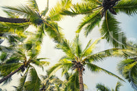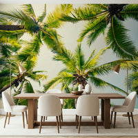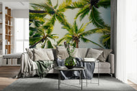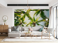 Elevate your interior with this vibrant island scene. This design captures the essence of a tropical paradise, featuring lush green palm fronds reaching towards a clear sky. The lively greens and calming blues infuse any room with a refreshing and relaxing vibe. Consider this wallpaper for walls in a sunroom, living room, or bedroom. Its design complements interiors with a bohemian, coastal, or tropical aesthetic, making it a wonderful choice for creating a stylish and inviting space. Embrace the tranquility and beauty of a tropical island.