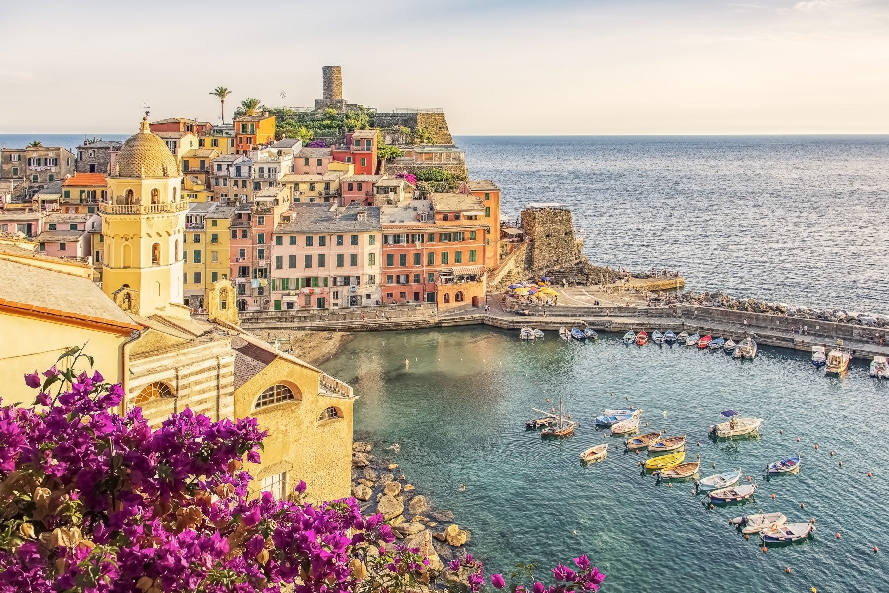 Escape to the sunny shores of Italy with this picturesque wallpaper. The colourful buildings cascade down to a tranquil harbour filled with charming boats. The vibrant pink bougainvillea adds a touch of romance to the scene. The gentle sea and soft sunlight create a calming ambiance, perfect for a bedroom or study. Use this wallpaper for walls to transform a space into a peaceful retreat. The design complements interiors with its warm palette and detailed architecture, transporting you to the Italian Riviera.