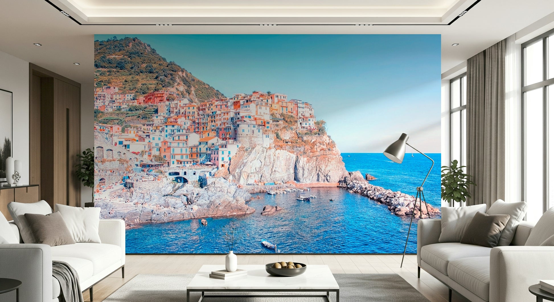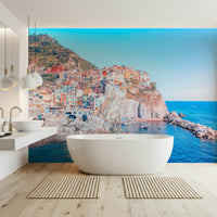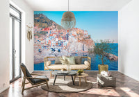 This wallpaper brings a serene touch of Italian coastal life to your home. A picturesque village atop rugged cliffs meets the azure sea in a scene of peaceful beauty. Pastel buildings offer a contrast to the vibrant water and sky. Use this wallpaper for walls to create a relaxing focal point in your living room, bedroom, or entryway. The design enhances interiors with a touch of global charm and a calming colour palette. Imagine escaping to this seaside vista every day within your home.
