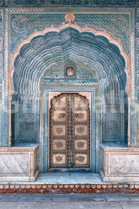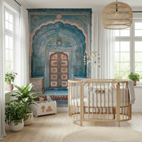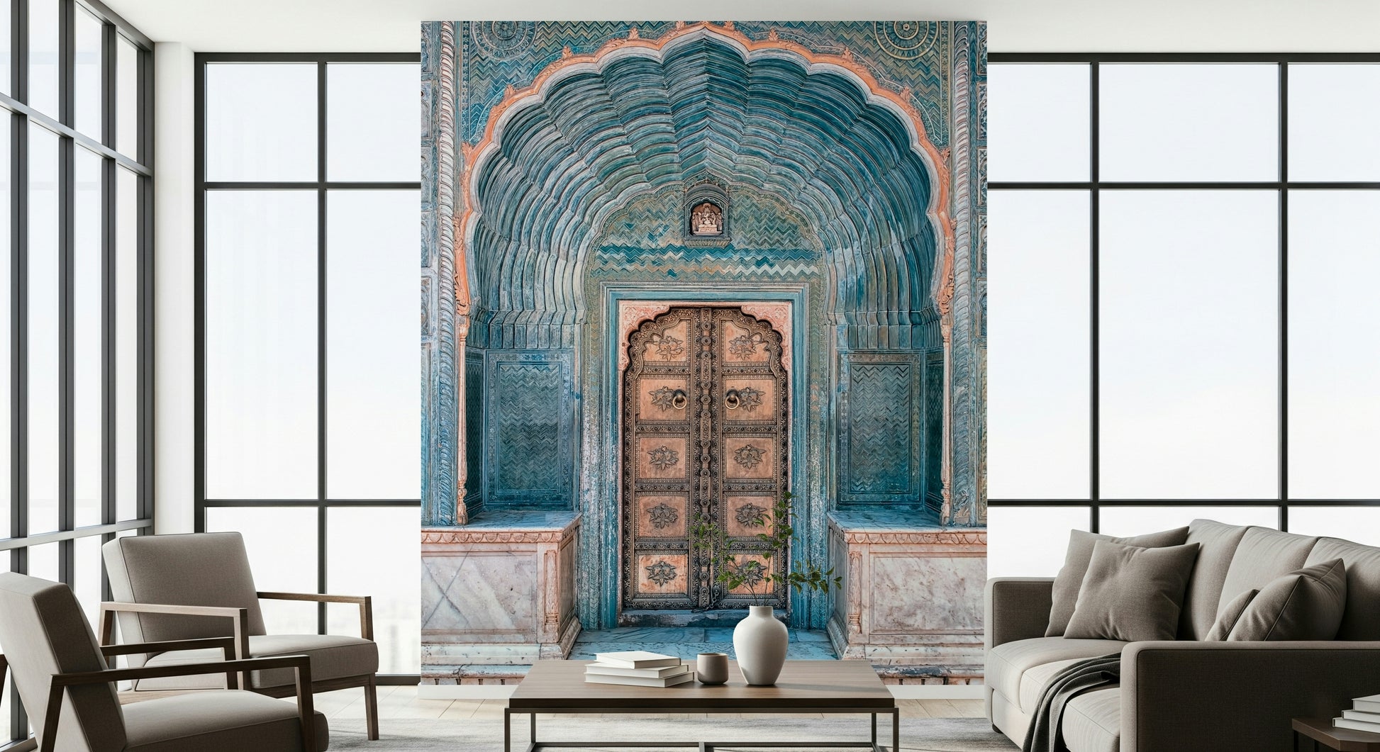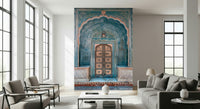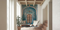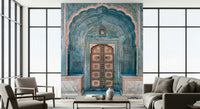 Discover the grandeur of Indian architecture with this stunning wallpaper for walls. The intricate carvings and the arched doorway create a majestic focal point. It features cool blues and warm beige tones. This design brings a touch of exotic charm to any room, including living rooms, bedrooms, or even hallways. The textures and geometric patterns bring depth and visual interest, making it an ideal choice for adding a unique, sophisticated ambiance to your home. It is perfect for those who appreciate historical charm.
