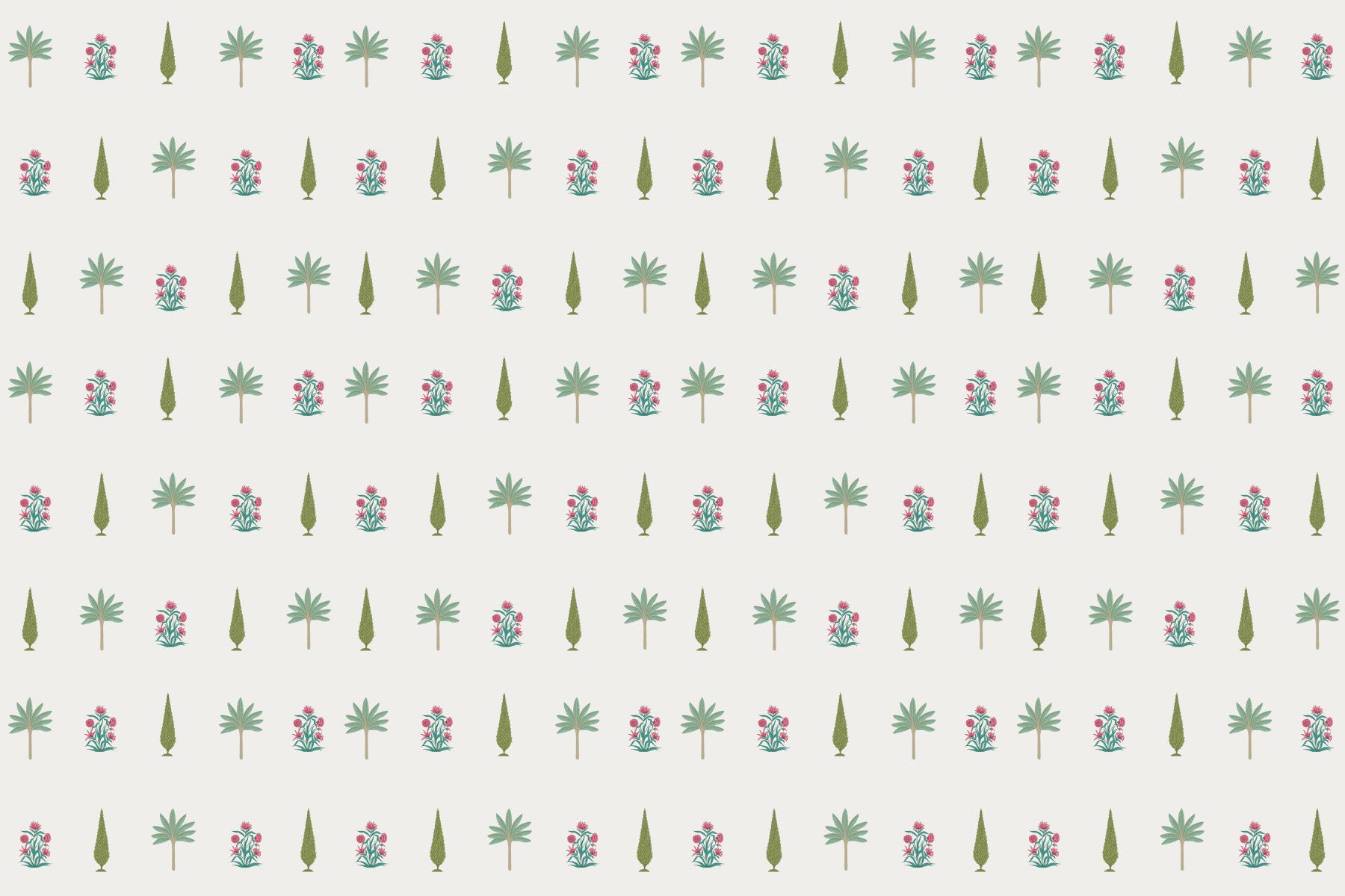 Evoke the serene charm of Rajasthan with the 'Jaipuri Pattern' wallpaper. Inspired by the traditional block printing techniques of Jaipur, this design features a delicate and repeating motif of stylized palm trees, elegant cypress trees, and lush floral clusters. The gentle color palette of soft greens and muted pinks against a cream backdrop creates a soothing and sophisticated ambiance, perfect for adding a touch of understated elegance to any room. Bring the timeless beauty of Indian artistry into your home with this refined and calming wallpaper, ideal for creating a peaceful and inviting atmosphere in bedrooms, living rooms, or studies. Let the 'Jaipuri Pattern' transport you to the tranquil gardens of a majestic palace.