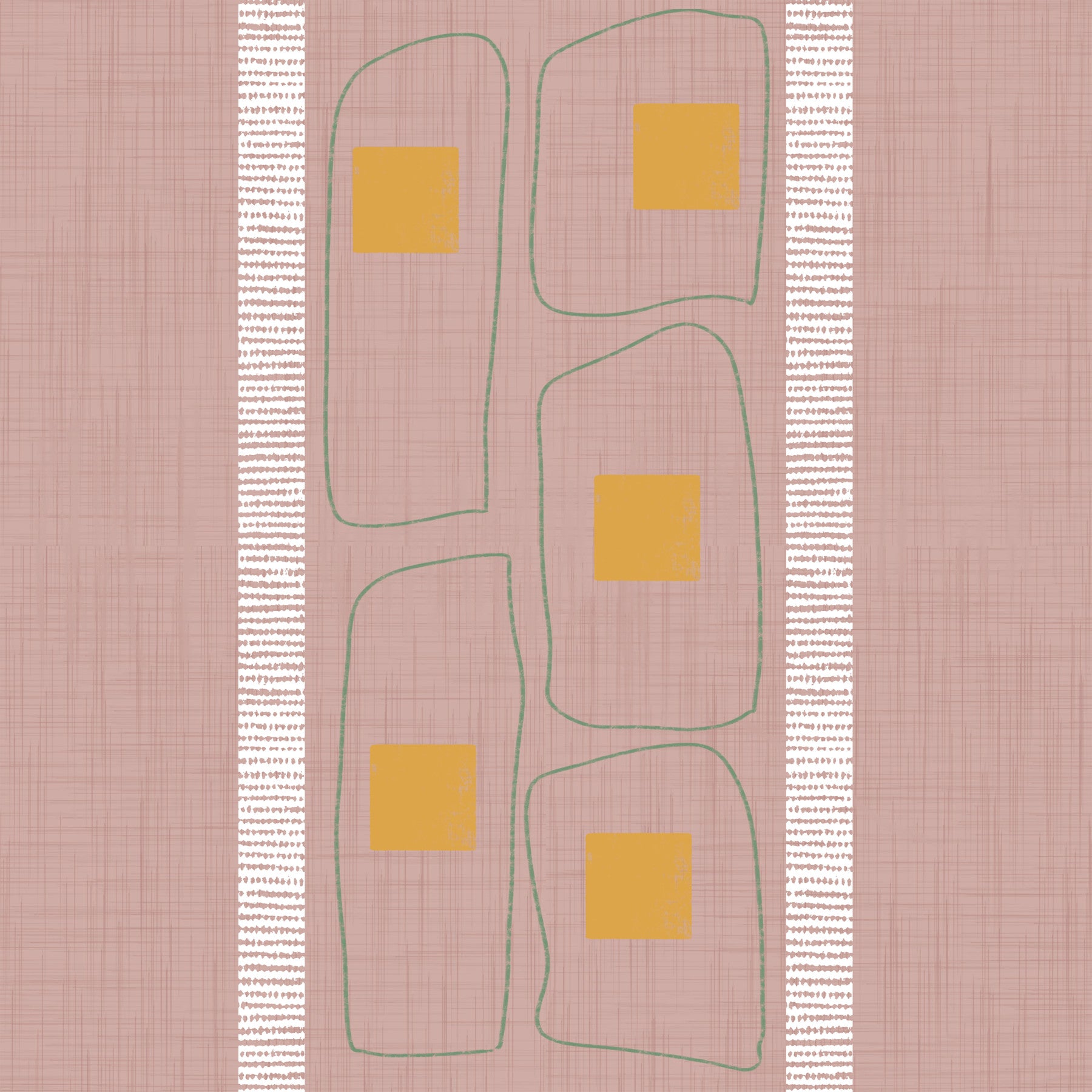 Embrace serenity with this 'Japandi Frame Lines Mauve' wallpaper. A calming mauve backdrop is adorned with minimalist, hand-drawn green lines forming abstract frames. Subtle textured squares in a warm mustard yellow add a touch of warmth and visual interest, perfectly complementing the soft, muted palette. The delicate white dotted lines on either side add a subtle textural element, reflecting the clean, understated elegance of Japandi design. This wallpaper evokes a feeling of tranquil sophistication, ideal for creating a peaceful and stylish atmosphere in any space.