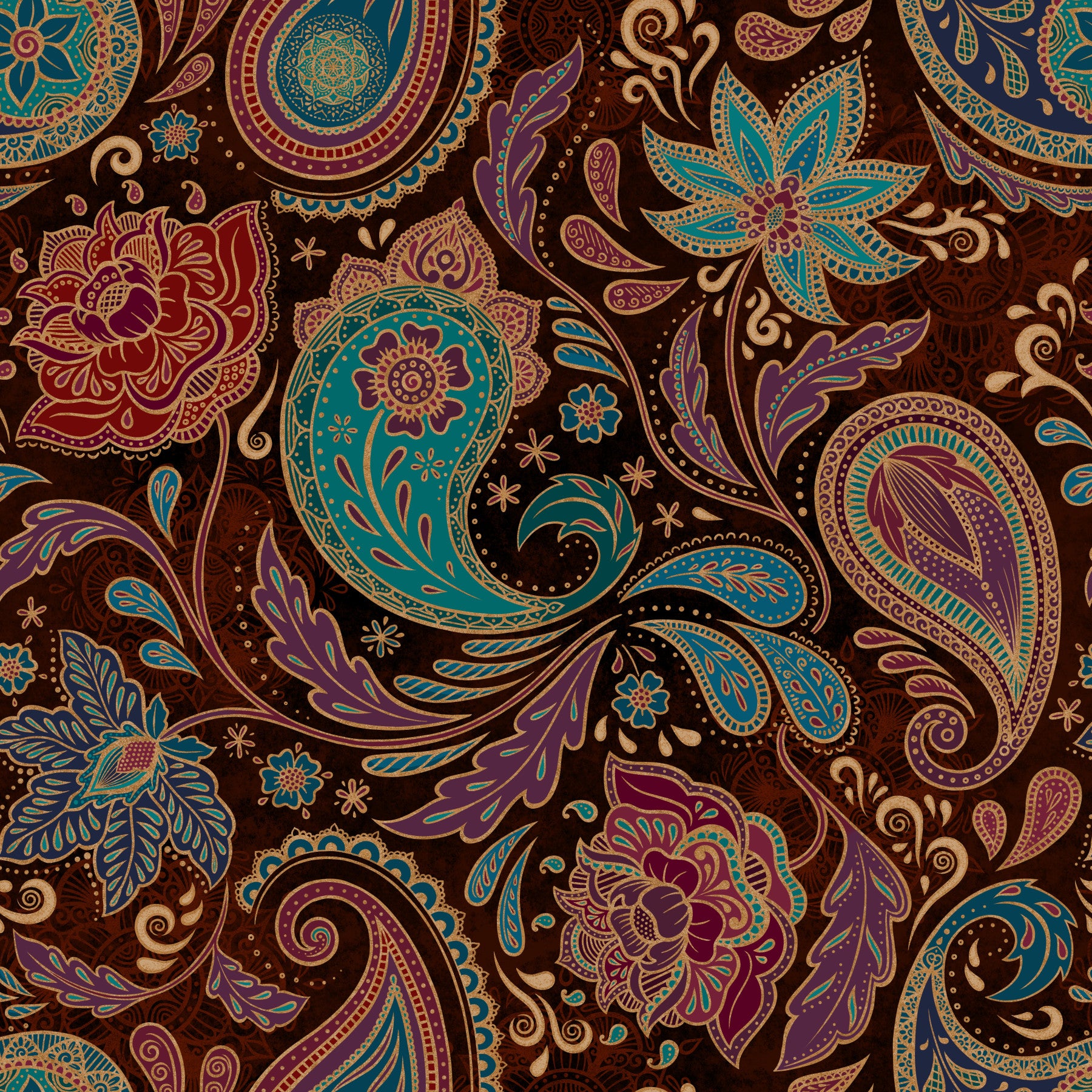 Immerse yourself in the rich tapestry of 'Jewel-toned Boho Paisley - Ruby', a captivating wallpaper design that seamlessly blends bohemian freedom with opulent jewel tones. Intricate paisley motifs, rendered in deep ruby reds, calming teals, vibrant purples, and touches of gold, dance across a textured, deep brown background. This pattern evokes a sense of worldly charm and artistic flair, making it the perfect statement piece for any space seeking a touch of exotic elegance. The meticulously detailed designs are outlined with delicate golden accents, enhancing the visual richness and creating a luminous effect. Let this alluring wallpaper transform your walls into a gallery of bohemian artistry, infusing your home with warmth, character, and a hint of rebellious sophistication. Embrace the harmonious blend of colours and patterns, and embark on a visual journey with this unique and enchanting design.