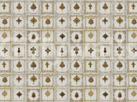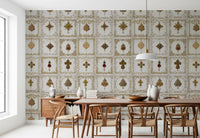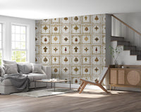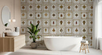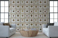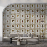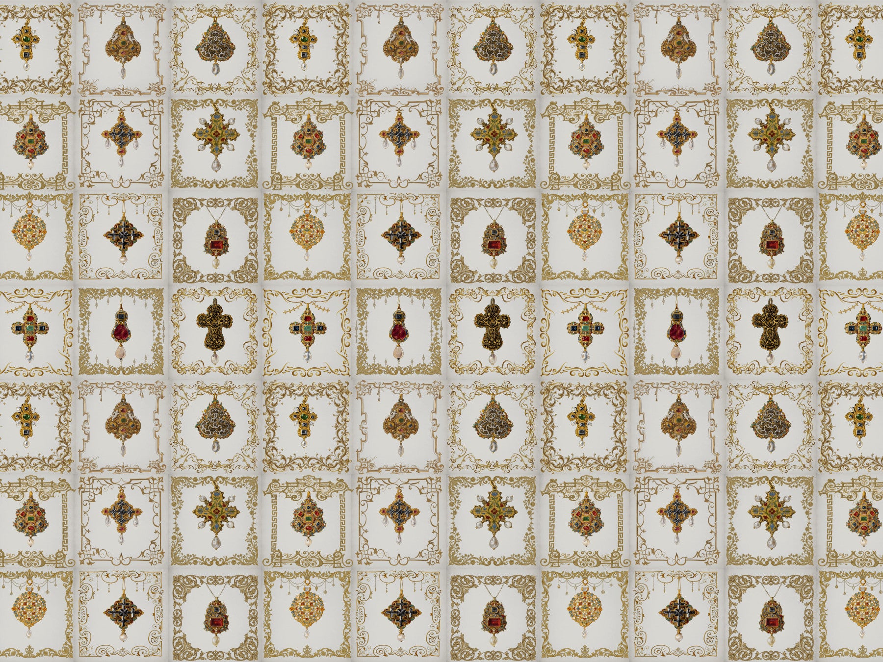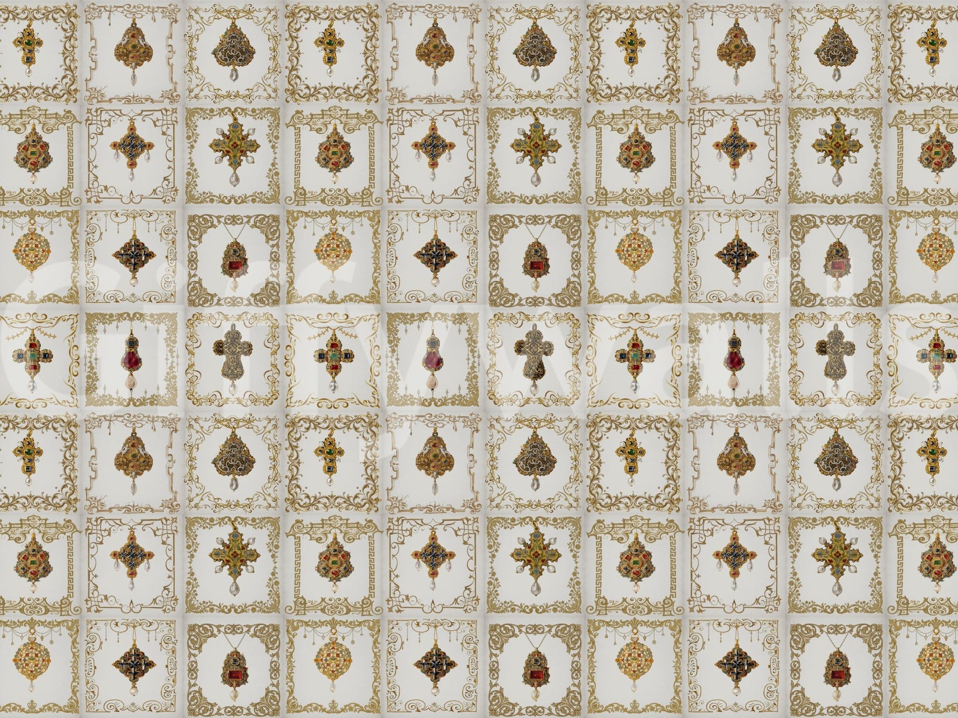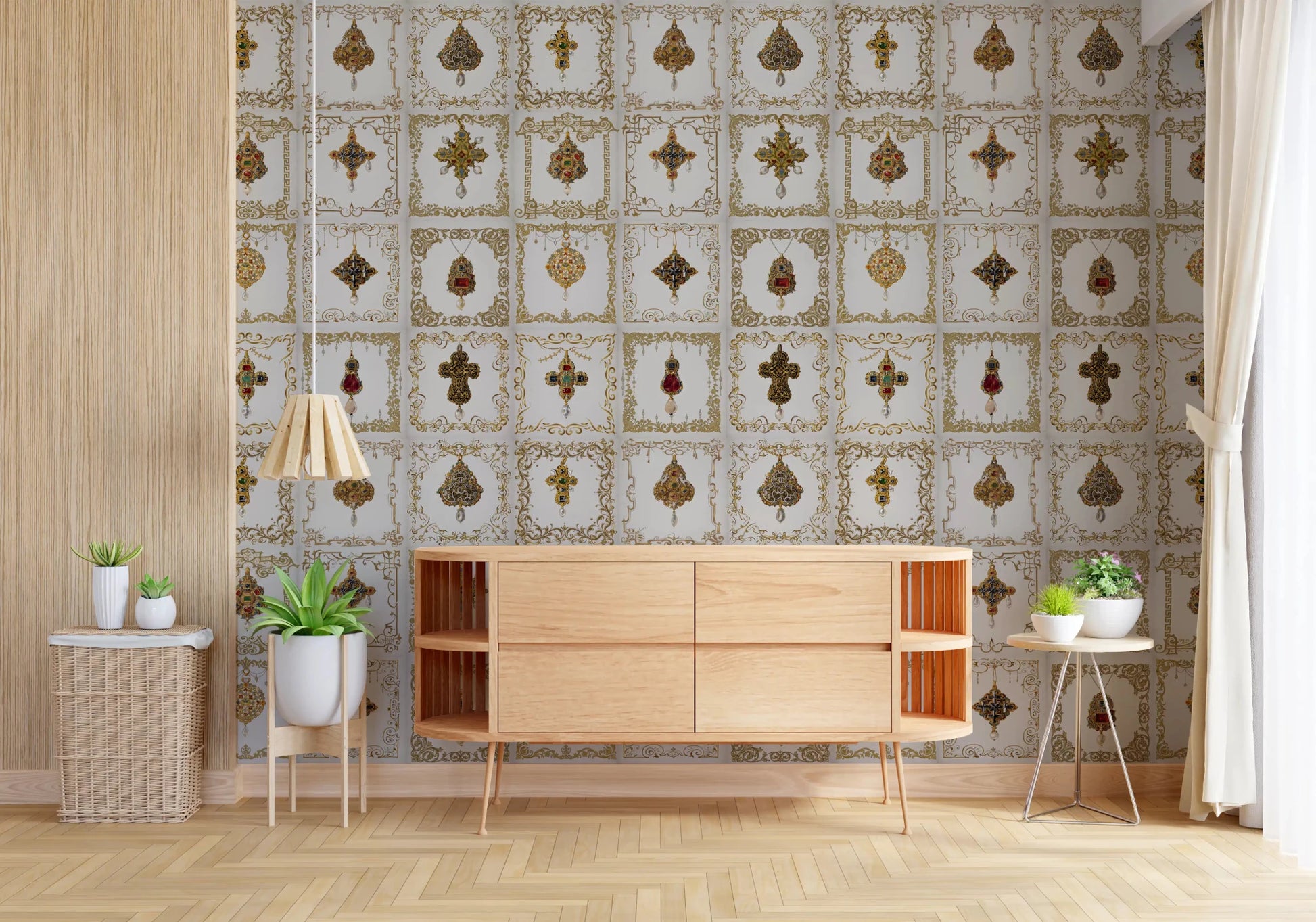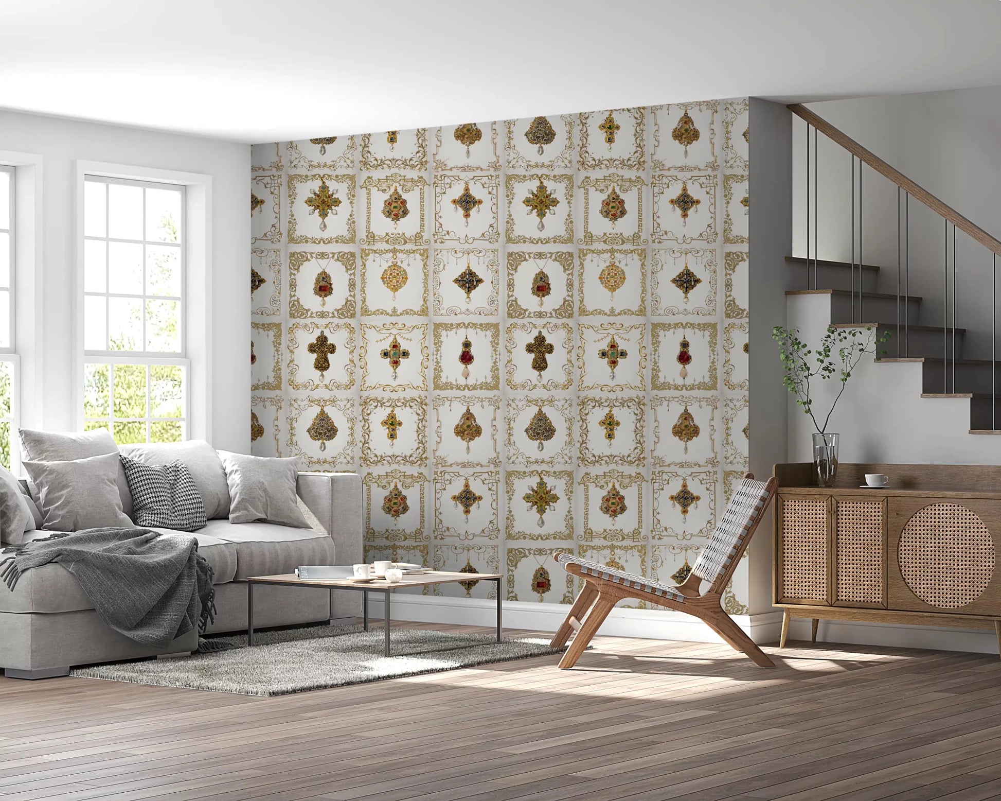 Adorn your interior with this opulent wallpaper for walls, showcasing a grand collection of historical jewellery designs. Each square features an intricately illustrated pendant or cross, meticulously framed by lavish gold scrollwork. Discover vibrant emeralds, rich rubies, deep sapphires, and lustrous pearls that create a dazzling display against a soft, off-white background. The design’s luxurious gold accents and rich jewel tones evoke a magnificent Baroque or Renaissance aesthetic. This elegant pattern transforms living rooms, dining rooms, or formal studies into sophisticated havens. It brings a sense of timeless grandeur and artistic splendour, elevating any space with its detailed, captivating beauty and refined charm.