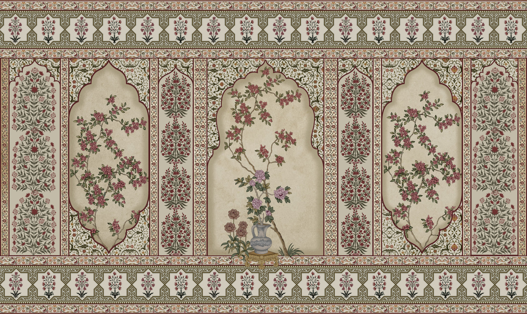 Step into the elegant world of Jharokha-e-Virasat a wallpaper design inspired by the intricate artistry of traditional Indian architecture. This visually stunning piece evokes a sense of heritage and timeless beauty, reminiscent of the elaborate windows (jharokhas) that offer glimpses into a rich cultural past. The design features a trio of arched windows, each adorned with meticulously detailed floral motifs. The central window uniquely showcases a flowering branch elegantly cascading into a vintage vase, placed upon a small pedestal, adding depth and a focal point to the design. The palette blends soft, earthy tones with touches of deep red and lush green, creating a warm and inviting ambiance. Intricate borders frame the central panels, showcasing geometric patterns and stylized flora further enhancing the wallpaper's regal allure. "Jharokha-e-Virasat" brings a touch of royal elegance to any space, making it perfect for creating a serene and sophisticated atmosphere.